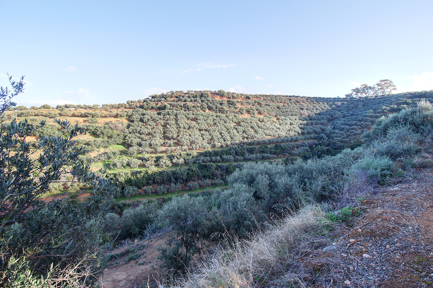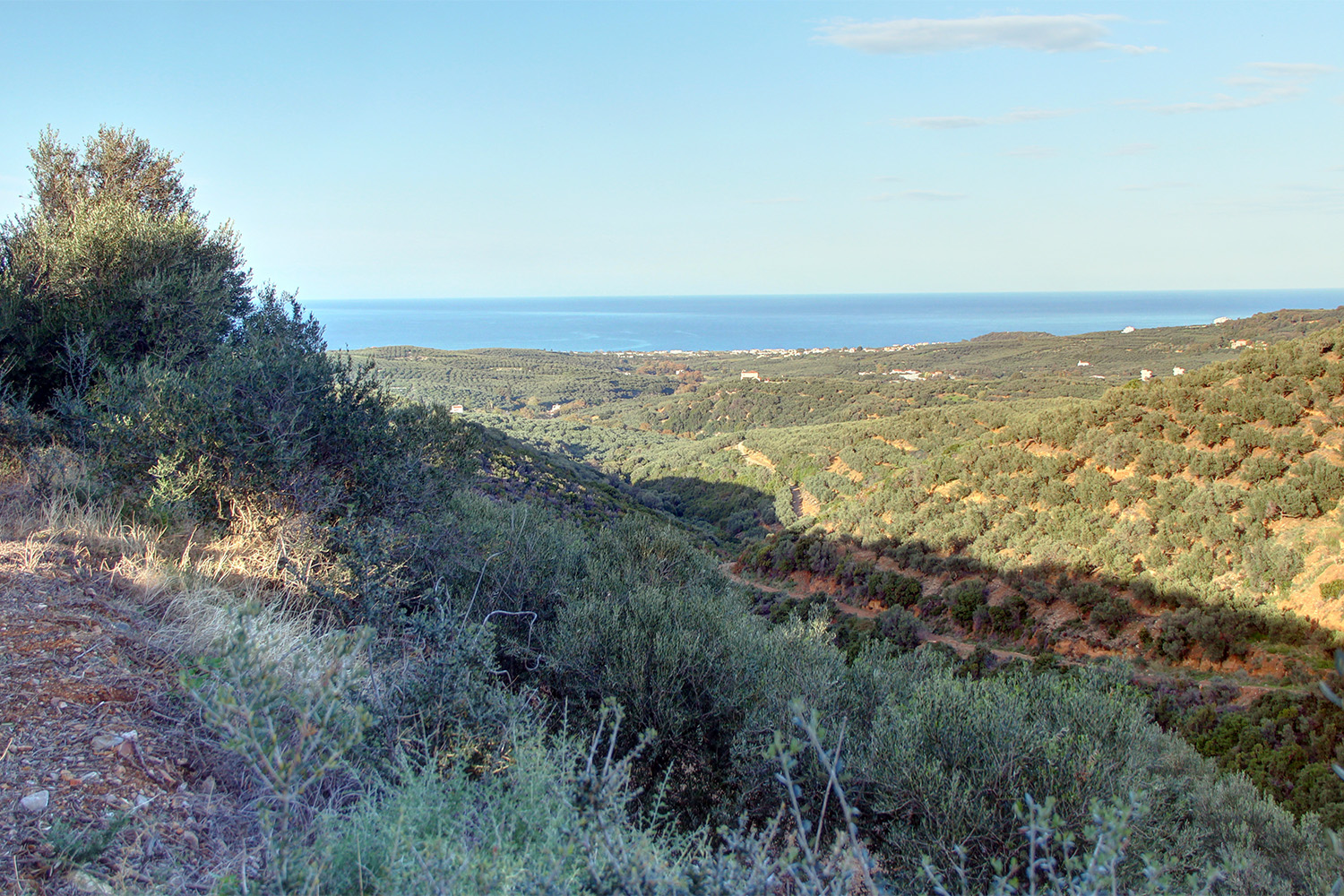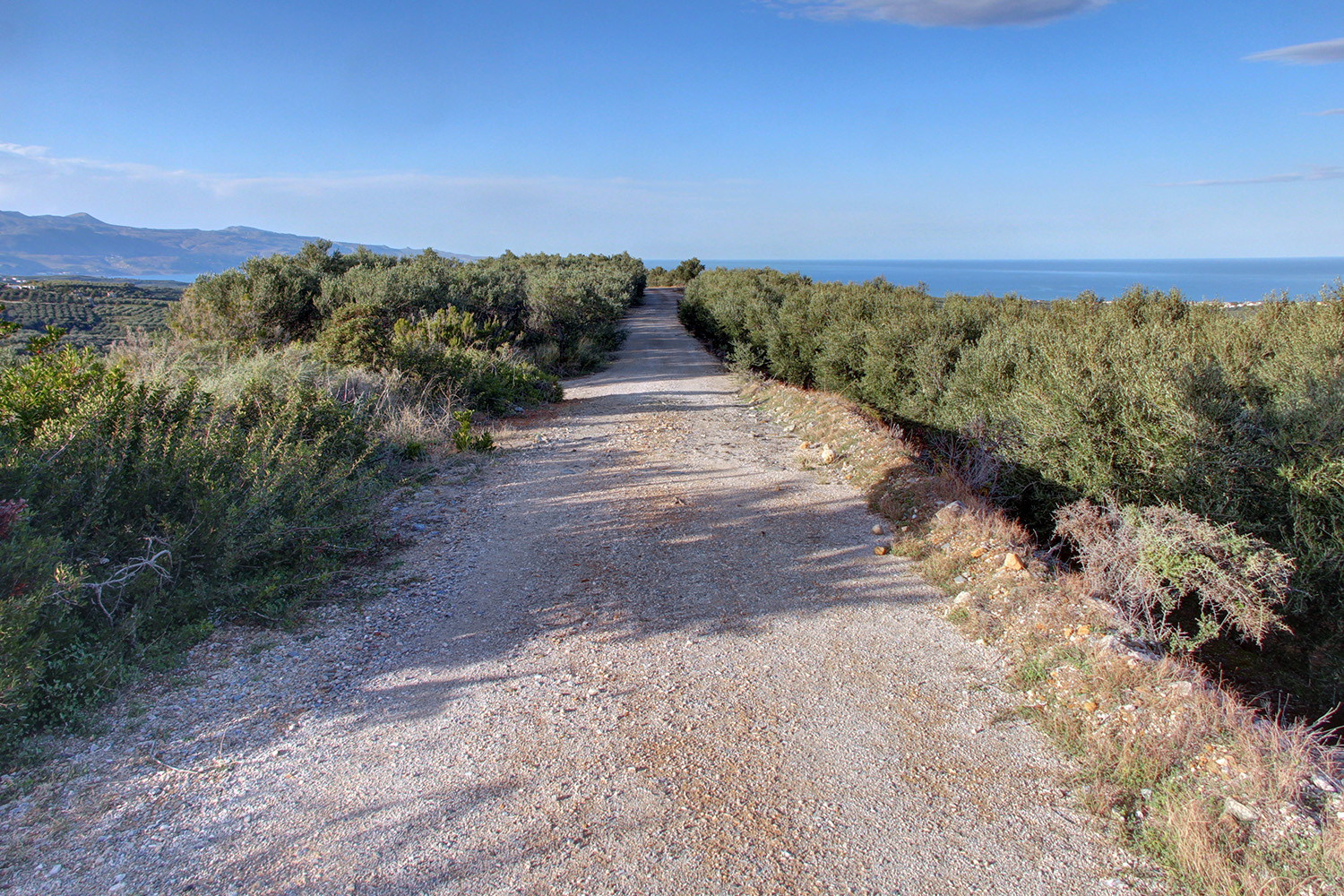 Das Grundstück liegt südlich des Dorfes Kyparissos in der Gemeinde Platanias. Es handelt sich um ein Grundstück, dessen höchster Punkt auf einem Bergrücken liegt. Die Grundstücksfront verläuft entlang einer Landstraße auf dieser Höhe, während in etwa 450 m Entfernung eine asphaltierte Straße in Richtung des Dorfes Ksirokampi abzweigt. Das Gelände fällt steil nach Osten ab, ist aber in große, ebene Terrassen unterteilt, auf denen jeweils ein bis zwei Reihen Olivenbäume stehen und zwischen denen sich steile Hänge erstrecken. Insgesamt befinden sich auf dem Grundstück etwa 200 Bäume, die gepflegt werden und Ertrag bringen. Eine Fläche von 5,762 m² steht zum Verkauf, wovon 307 m² als Wald ausgewiesen sind, wobei ein Einspruch geprüft wird. Ein weiterer, tiefer gelegener Bereich des Grundstücks ist eindeutig als Wald ausgewiesen und kann informell genutzt werden. Von allen Punkten bietet sich ein beeindruckender Blick auf das Meer, während der gegenüberliegende Hang ein imposantes Becken mit Olivenhainen bildet, in dem man die Stille der Natur genießen kann.