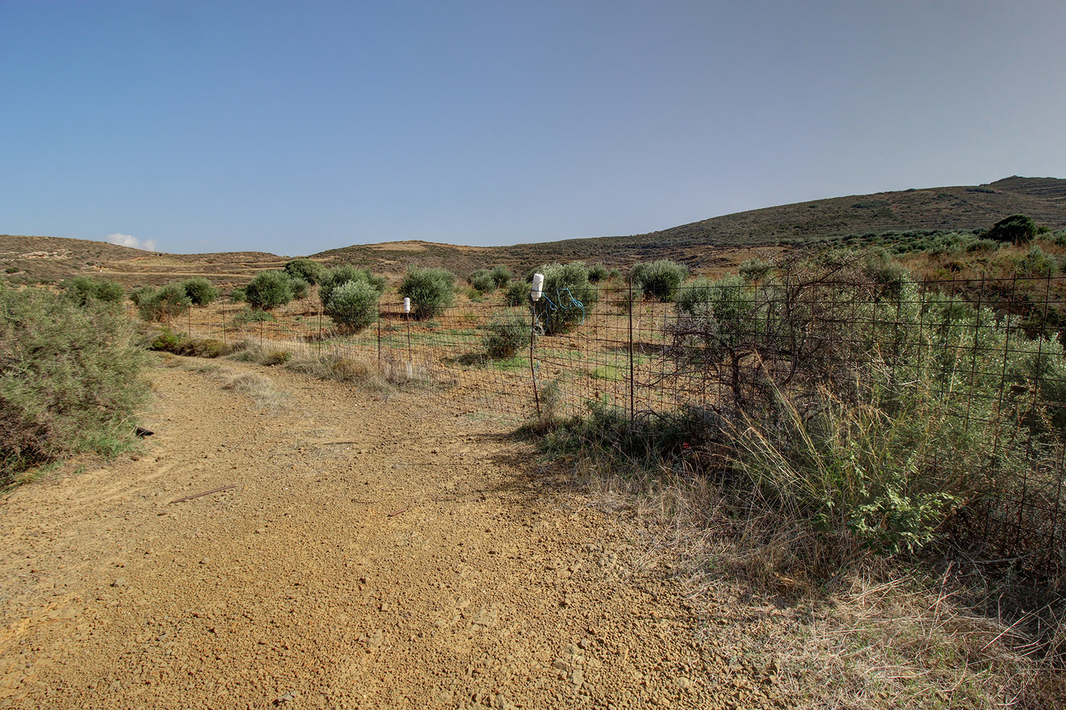 Das Grundstück hat einen Metallzaun und es gibt etwa 100 Olivenbäume, die jung, aber bereit für den Ertrag sind. Die Neigung des Geländes erleichtert jede Konstruktion. Nur in Randnähe gibt es einige Hangstellen, die in flache Terrassen unterteilt sind, die durch Böschungen getrennt sind. Die Ansichten des Grundstücks und seiner Merkmale sind selten. Das Gefälle der Straße, die zum Grundstück führt, ist nicht steil, so dass sie mit geringfügigen Änderungen und wenn sie instand gehalten wird, mit jedem herkömmlichen Fahrzeug befahrbar ist.