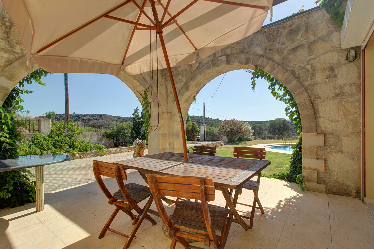 Der Haupteingang befindet sich im Erdgeschoss und besteht aus einem Schlafzimmer, einem Badezimmer und einem großen offenen Wohn-, Ess- und Küchenbereich. Die Küche verfügt über viele Schränke, eine große Granitplatte und alle notwendigen Elektrogeräte. Der gesamte Hauptraum verfügt über beeindruckende Marmorböden und große Öffnungen, die viel Licht hereinlassen. Der Wohnraum verfügt über Balkontüren, die vollständig geöffnet werden können, um den Innen- und den Außenbereich direkt miteinander zu verbinden. Alle Seiten des Erdgeschosses haben Ausgänge zu Innenhöfen und geräumigen Terrassen mit sonnigen oder schattigen Bereichen, die den ganzen Tag über zum Entspannen einladen.