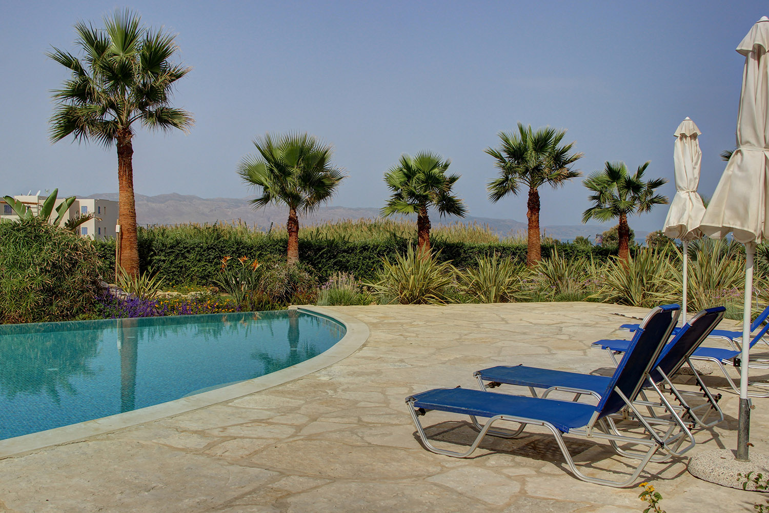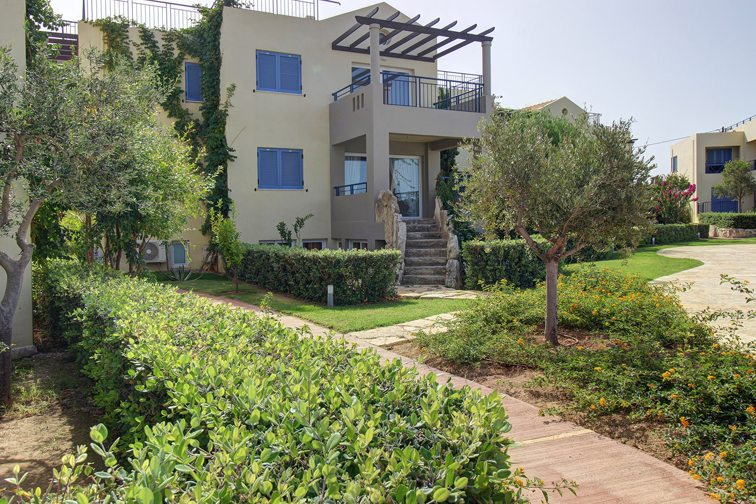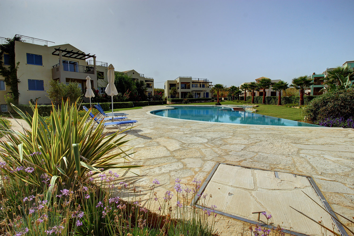 Die Wohnung befindet sich in einem luxuriösen Küstenkomplex, etwa 20 Autominuten westlich der Stadt Chania. Der Komplex befindet sich direkt vor dem schönen Strand von Pyrgos Psiloneros und verfügt über große, üppige Gärten und einen eleganten Themenpool von 250 m². Die Gegend ist wunderschön urban und entlang des Strandes gibt es Bänke sowie Promenaden und viel Grün. Der Strand hat Flecken mit Sand oder Kieselsteinen. Es ist ziemlich groß und bietet Optionen in organisierten oder isolierten Abschnitten.