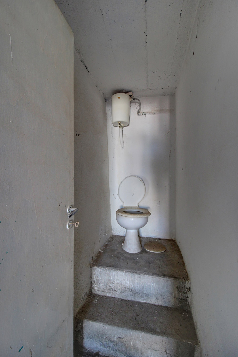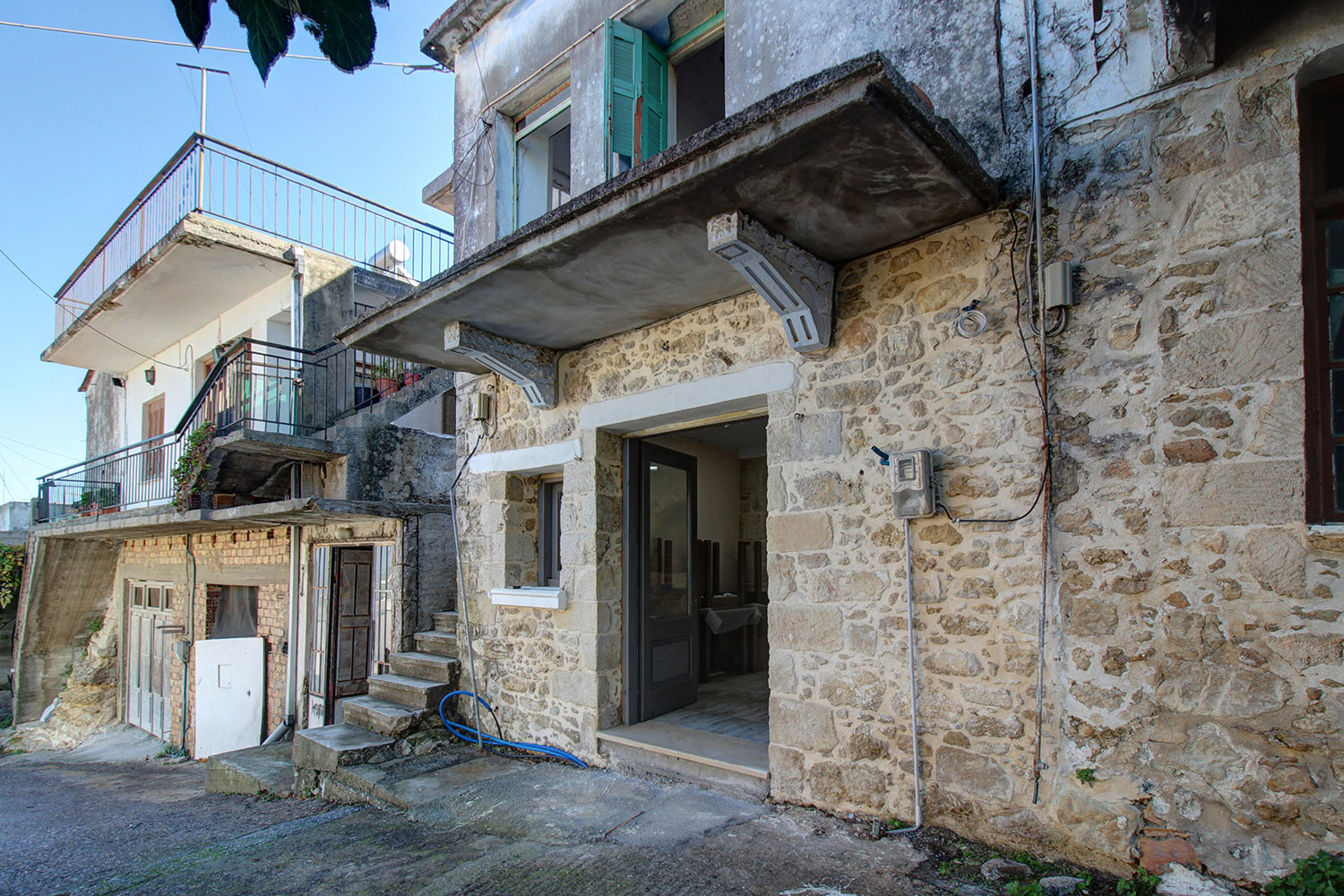 Das gesamte Erdgeschoss ist offen gestaltet mit einem unfertigen Badezimmer auf der Rückseite. Die Wände haben Stein, der in verschiedenen Bereichen innen und außen sichtbar ist, und es gibt eine abgehängte Decke. Die Küche ist durch einen Steinbogen getrennt. Das Obergeschoss ist separat über eine Außentreppe erreichbar und der Haupteingang öffnet sich auf einen Flur mit großer Fensterfront, der mit allen Bereichen verbunden ist. Es gibt insgesamt ein altes Badezimmer, drei separate Räume (Küche, Wohnzimmer, Schlafzimmer), einen kleinen Nordbalkon und eine kleine Terrasse vor dem Haupteingang. Das Obergeschoss bedarf einer kompletten Renovierung sowie einer Reparatur oder ggf. Erneuerung des Daches. Insgesamt weist das Gebäude jedenfalls keine baulichen Probleme auf und kann mit etwas mehr Geld voll funktionsfähig werden. Wenn Sie sich entscheiden, die beiden Etagen zu integrieren, können Sie die Hauptwohnräume im Erdgeschoss haben und bis zu drei Schlafzimmer im Obergeschoss schaffen.