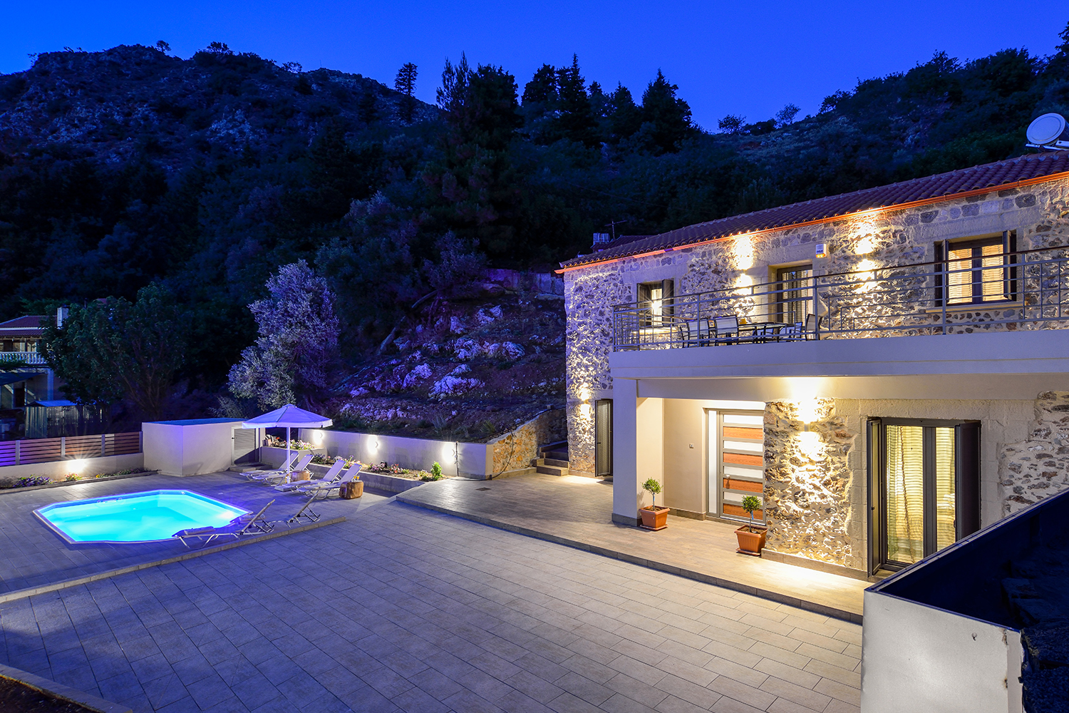 Vor dem Haupteingang gibt es einen überdachten Bereich, während wir im Inneren einen großen offenen Wohn-, Küchen- und Essbereich finden. Die Küche hat viele Schränke, eine große Theke und eine Speisekammer. Im Wohnbereich gibt es auch einen energieeffizienten Eckkamin. Im Erdgeschoss befinden sich außerdem eines der drei Schlafzimmer des Hauses sowie ein geräumiges Badezimmer mit Dusche. Eine Treppe mit Metallrahmen und Holzstufen führt nach oben, wo sich zwei weitere Schlafzimmer befinden, von denen jedes über ein eigenes Bad und einen Einbauschrank verfügt. Im Obergeschoss befindet sich ein großer Westbalkon mit schöner Aussicht auf die Umgebung. Das Anwesen verfügt über Klimaanlagen in allen Bereichen, ein Solarpanel sowie Aluminiumtüren und -fenster mit Fliegengittern und Doppelverglasung. Darüber hinaus gibt es Überwachungskameras, Alarm und Satellitenschüssel. Es ist eine ausgezeichnete Wahl als Ferienhaus, während es für die touristische Nutzung bereit ist. Es steht mit allen Möbeln und Geräten zum Verkauf.