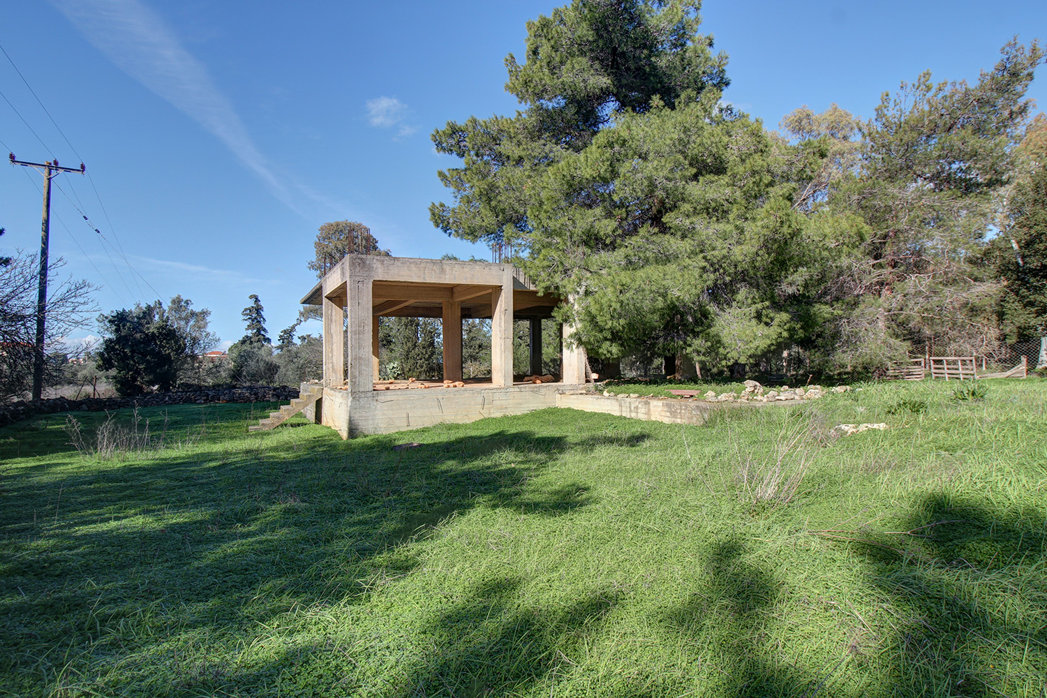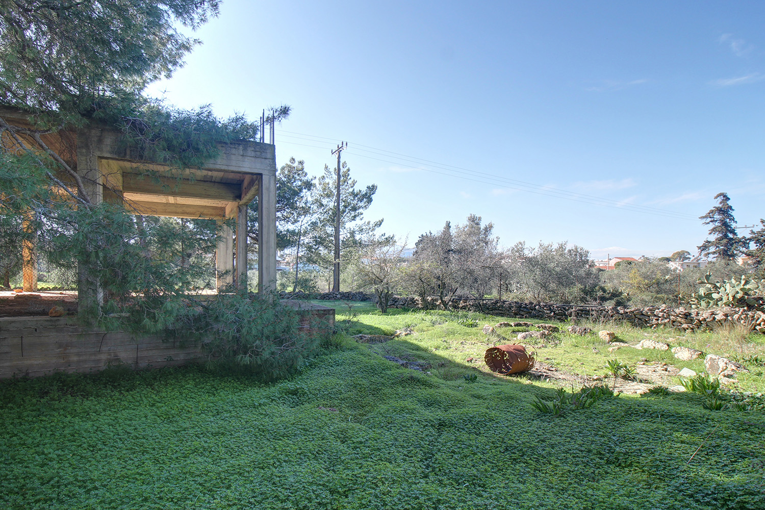 Das Grundstück befindet sich im Dorf Sternes, Gemeinde Akrotiri, im Bezirk Chania. Es liegt im lichteren Teil des Dorfes an einem schönen, dünn bebauten Ort. Das Grundstück ist größtenteils von großen Bäumen umgeben, an der Rückseite befindet sich ein kleiner Hain. Es hat eine nahezu rechteckige Form mit durchschnittlichen Abmessungen von 70 m Breite und 30 m Tiefe. Die große Südseite bietet einen herrlichen Blick auf die Weißen Berge. Das Grundstück eignet sich ideal für den Bau eines kleinen Wohnkomplexes mit bis zu 720 m², der bei Bedarf auch größer sein kann. Das bestehende Gebäude befindet sich nahe der Westseite und erleichtert so die Planung. Es handelt sich um ein im Rohbau befindliches Erdgeschosshaus, das je nach Bedarf mit 2 oder 3 Schlafzimmern ausgebaut werden kann. Neben dem Gebäude befindet sich auf dem Grundstück eine alte Dreschfläche aus Stein. Das Grundstück ist nahezu eben und leicht zu bebauen, was die Baukosten minimiert.