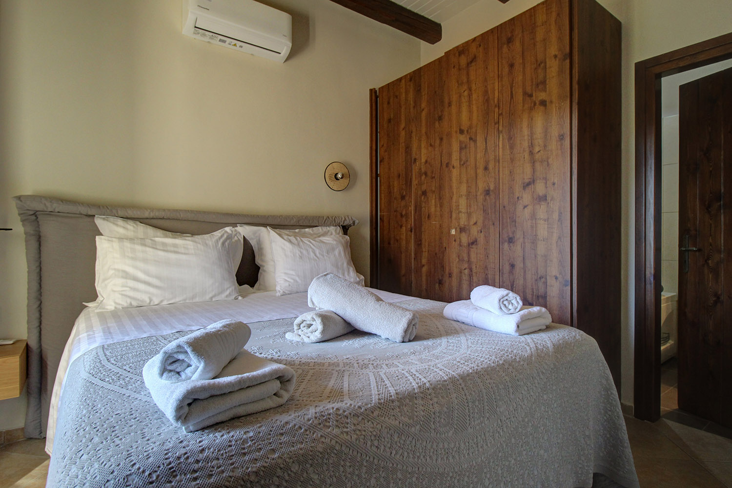 An der Stelle des bestehenden Gebäudes befand sich eine Steinhausruine, von der einige Materialien wiederverwendet wurden. Daher verfügt das Anwesen über interessante architektonische und traditionelle Elemente. Das Haus ist auf zwei Ebenen verteilt. Der Haupteingang befindet sich im Erdgeschoss, dessen größter Teil offen gestaltet ist. Der Wohnbereich, der Essbereich und die Küche liegen in einem großen, L-förmigen Bereich, außerdem gibt es ein Gäste-WC mit Waschküche sowie eines der Schlafzimmer mit eigenem Bad. Im Wohnbereich gibt es einen Kamin und von der Küche aus gibt es einen Ausgang zum Grillplatz. Eine beeindruckende Holztreppe führt in die erste Etage. Im Obergeschoss finden wir einen Abstellraum sowie zwei Schlafzimmer mit eigenem Bad und Balkonen auf der Vorder- und Rückseite. Beide verfügen über große Einbauschränke.