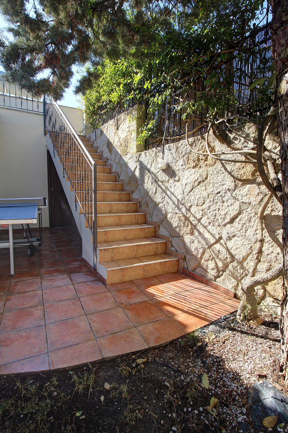 Das Grundstück ist mit einer Steinmauer eingezäunt und obwohl es an einem Hang liegt, wurde es gänzlich flach angelegt. Die Südostfassade ist erhöht, was Ausblicke gewährleistet. An der gegenüberliegenden Nordwestfassade befindet sich ein speziell angelegter Durchgang, der stufenlos in das Obergeschoss führt. Das Anwesen verfügt über ein elektrisches Tor, von dem aus wir auf einen Parkplatz für zwei Fahrzeuge gelangen, während es auch eine Tür für die Gäste gibt. Auf der Rückseite befindet sich der private Pool von 21 m². Rund um das Haus gibt es einen Blumengarten, einen Rasengarten, einen Abstellraum für die Gartenmöbel sowie einen überdachten Essbereich mit eingebautem Grill.