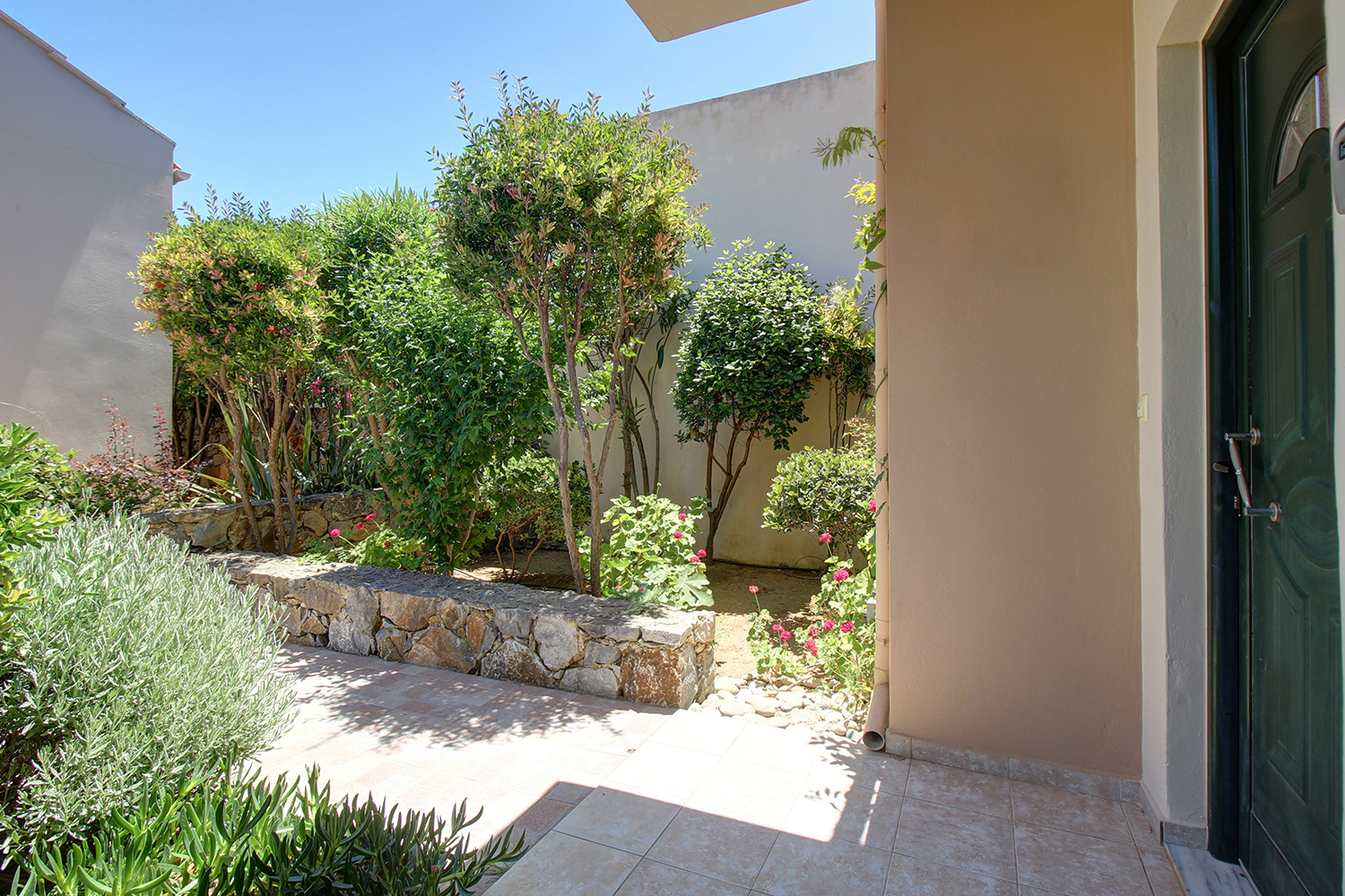 Das Haus befindet sich in ruhiger Lage am Rande des Komplexes. Vor dem Haupteingang befinden sich ein Innenhof und ein Garten zur alleinigen Nutzung. Auf der Rückseite finden wir eine Terrasse und einen zweiten Garten mit sehr guter Privatsphäre. Die Räume der Residenz befinden sich im Erdgeschoss und im ersten Stock mit einer Gesamtfläche von 71 m² und sind durch eine Innentreppe miteinander verbunden. Eine Außentreppe an der Rückseite des Gebäudes führt in den Keller, der offen gestaltet ist, etwa 25 m² groß ist und über einen Hochdruckreiniger und einen Reservewassertank verfügt.