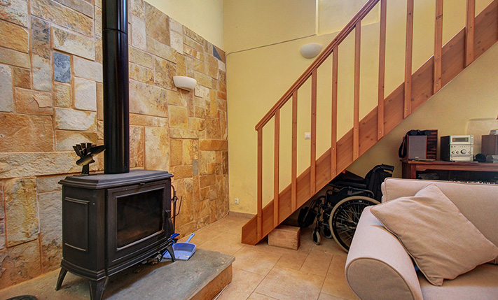 Das Gebäude ist zweistöckig, wobei die Ebenen intern und über die Außentreppe, die zum Balkon führt, miteinander verbunden sind. Das Obergeschoss besteht aus einem großen Holzboden, der vom Wohnzimmer aus zugänglich ist und als Schlafzimmer oder Büro genutzt werden kann. Der Haupteingang im Erdgeschoss öffnet sich in eine kurze Empfangshalle, die in einen großen offenen Wohn- und Essbereich mit hohen Decken und einem schönen Holzofen aus Gusseisen führt. Von der Eingangshalle aus gelangt man in einen halbseparaten Teil des Gebäudes mit einem Schlafzimmer und einem eigenen Badezimmer, ideal für Gäste. Ein Flur führt vom Wohnzimmer zur Küche, zwei großen Schlafzimmern und einem Hauptbadezimmer. Die Küche öffnet sich zum Innenhof und verfügt über eine eigene Speisekammer.