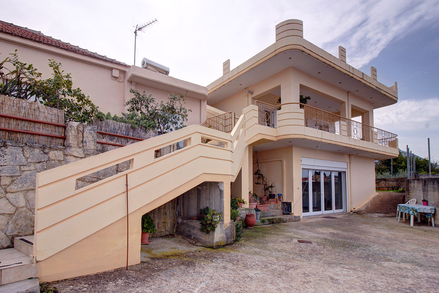 Das Anwesen liegt in einem traditionellen Dorf in Apokoronas, an einem ruhigen Ort, von wo aus man einen beeindruckenden Panoramablick über die grüne Umgebung und bis zum Meer in der Ferne hat. Es handelt sich um ein zweigeschossiges Haus, welches im Erdgeschoss eine Garage von 66 m², im Erdgeschoss ein Gästehaus von ca. 33 m² sowie im Obergeschoss eine Wohnung von ca. 80 m² umfasst. Das Anwesen befindet sich in Familienbesitz und wurde zur Eigennutzung errichtet und ist daher gepflegt und hochwertig.