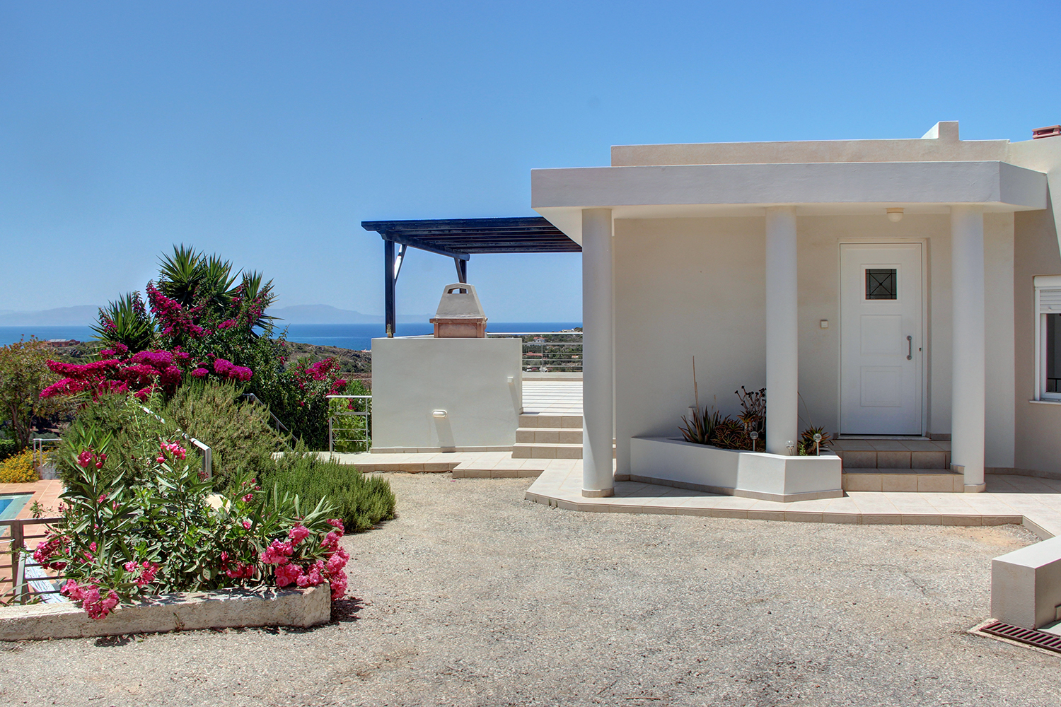 Das luxuriöse Anwesen erstreckt sich über drei Ebenen, die nach Nordwesten zum Meer ausgerichtet sind. Es ist eines von drei Häusern in einer kleinen Wohnanlage. Jedes Haus verfügt über ein eigenes Grundstück und ist unabhängig. Sie teilen sich lediglich eine kleine, private Zufahrt mit Tor. Das Haus ist das letzte der Anlage, hinter der das Dorf mit einem steilen Hang endet. Dadurch bleibt der beeindruckende und unverbaubare Blick auch in Zukunft erhalten.