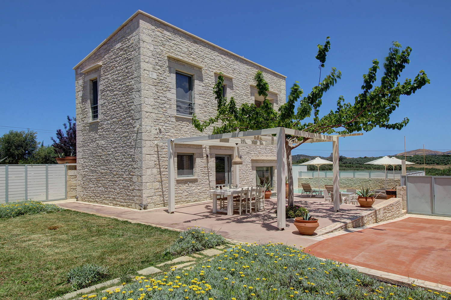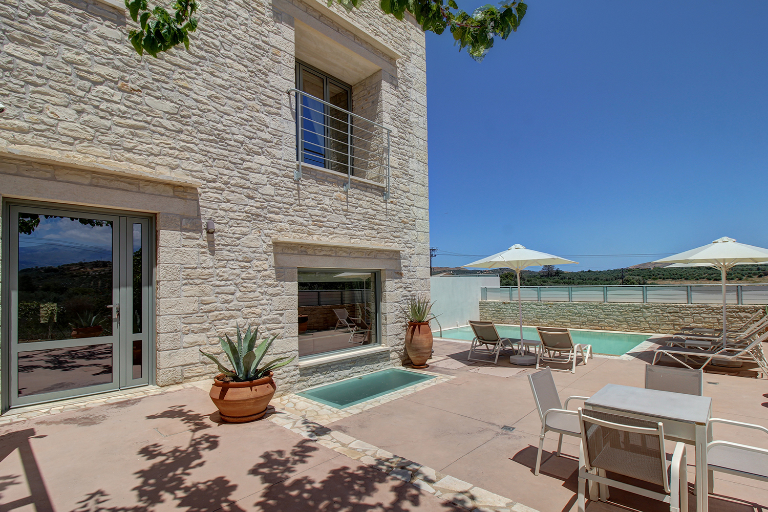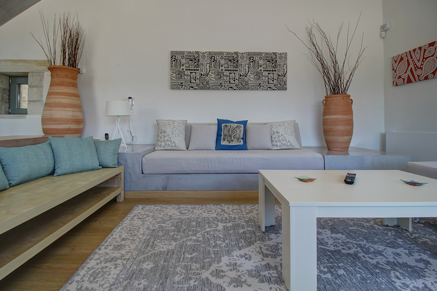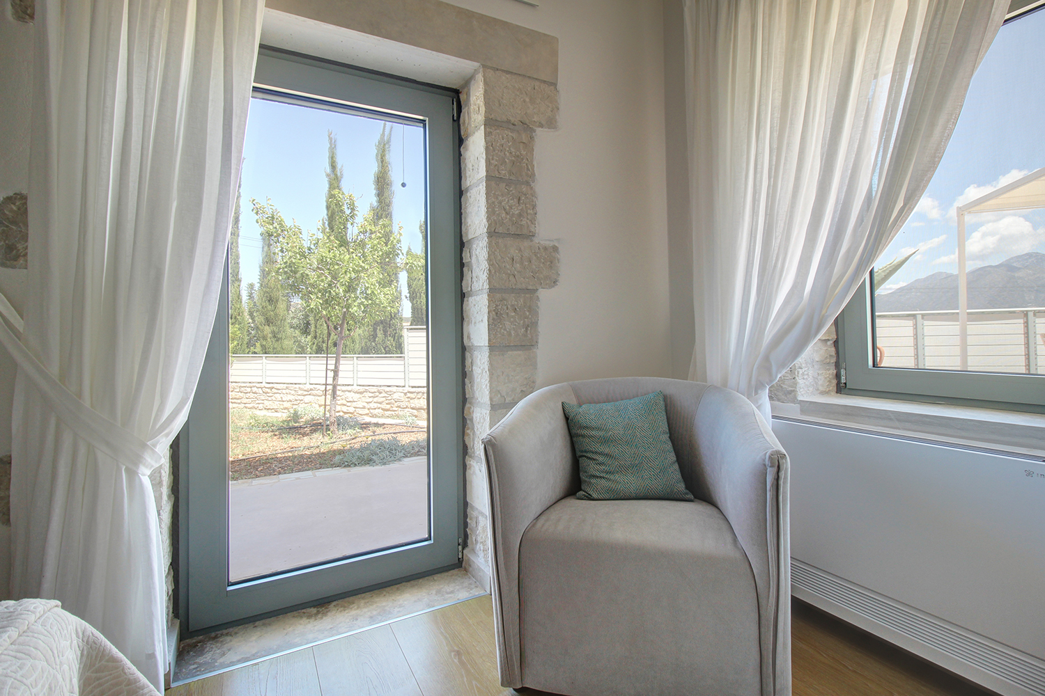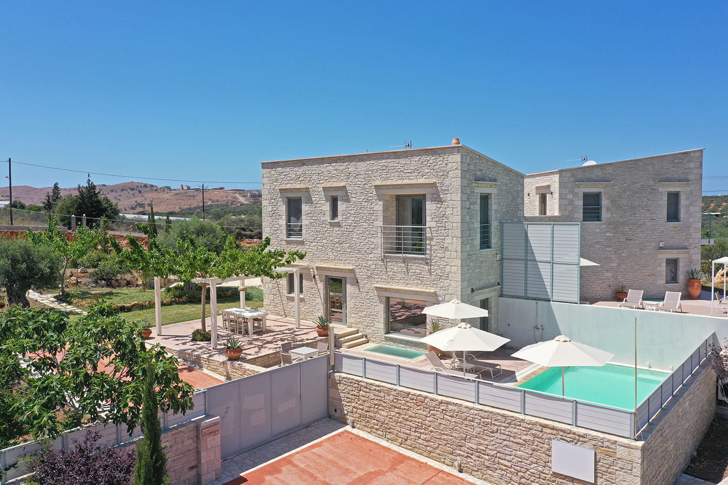Das Anwesen umfasst zwei luxuriöse, nebeneinander liegende Residenzen mit jeweils einem Außenbereich, einem privaten 24 m² großen Pool, Innenhöfen und einem Garten zur exklusiven Nutzung. Die beiden Häuser sind zudem gegensätzlich ausgerichtet, sodass für ausreichend Privatsphäre gesorgt ist. Der Komplex fügt sich harmonisch in die Umgebung ein, da die Häuser mit lokalem Stein verkleidet sind und die Gärten mit einheimischen Pflanzen bepflanzt sind, die mit den unzähligen Olivenhainen der Umgebung harmonieren. Die Gebäude der Residenzen erstrecken sich über drei Ebenen: Erdgeschoss und Obergeschoss dienen der Hauptnutzung, und ein großzügiger, offen gestalteter Keller mit weiteren 131 m² Fläche ist ebenfalls offen gestaltet. Der Bau der Gebäude begann 2014, die Fertigstellung erfolgte 2019 und sie wurden bis heute kaum genutzt.