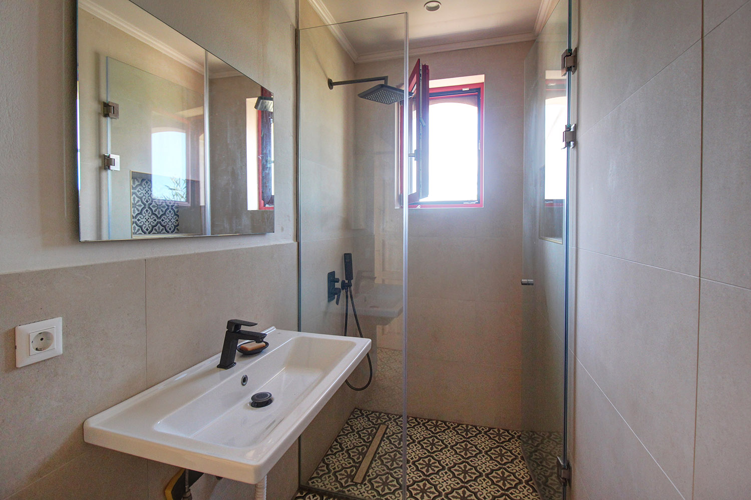 Vor dem Haupteingang befindet sich eine überdachte Terrasse mit Pergola. Das Gebäude gliedert sich in das Haupthaus mit offenem Wohnbereich, einem Schlafzimmer und einem Badezimmer. Eine zweite Tür führt in ein separates Gästehaus mit einem Schlafzimmer und eigenem Bad. Der offene Wohnbereich besticht durch eine imposante, holzvertäfelte Decke und eine Küche mit Frühstücksbar und Gaskochfeld. Große Terrassentüren lassen viel Licht in den Wohnbereich und öffnen sich zu einer Westterrasse mit Panoramablick. Beide Schlafzimmer verfügen über geräumige Einbauschränke, und die Badezimmer sind modern im Boho-Stil gestaltet. Das Haus ist hervorragend gepflegt und verfügt über eine Fußbodenheizung mit Wärmepumpe, eine Solaranlage sowie Aluminiumfenster und -türen mit Insektenschutzgittern und Doppelverglasung.