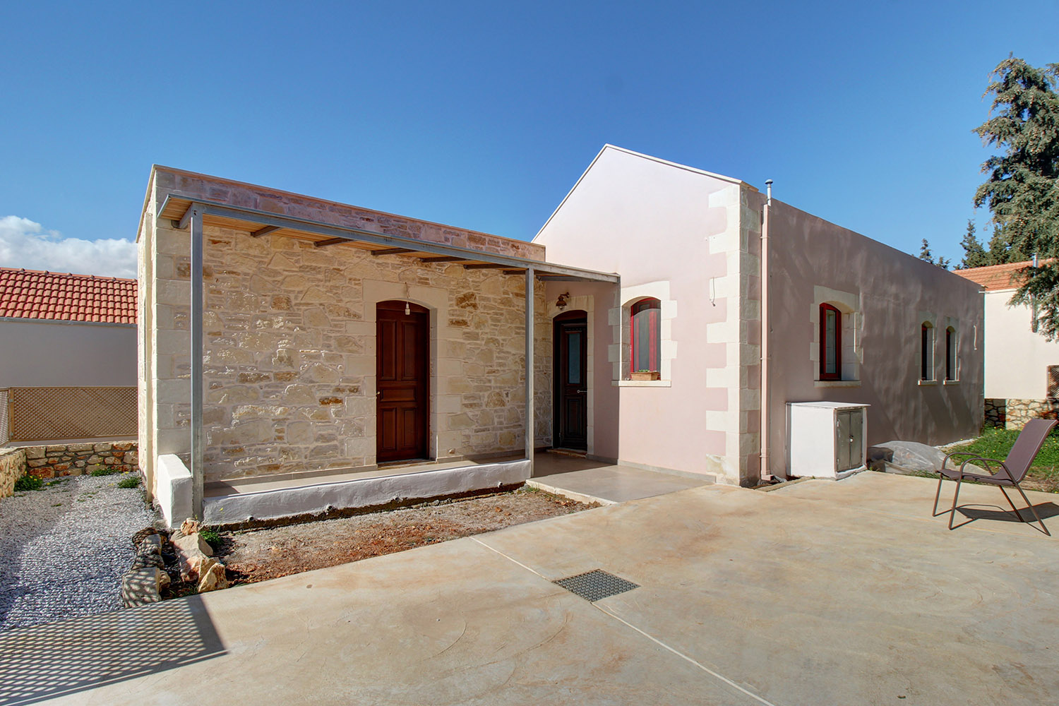 Das Anwesen liegt auf einem erhöhten Grundstück in einer malerischen Gegend am Rande des kleinen Ortes Vamos. Die grüne Umgebung bietet einen herrlichen Blick auf den Bergkamm der Weißen Berge. Die umliegenden Gebäude sind erst kürzlich errichtet worden und fügen sich geschmackvoll und harmonisch in die lokale Architektur ein. Das Haus verfügt über einen Garten auf zwei Seiten, einen Hof, einen Parkplatz und ein mit einer Steinmauer umzäuntes Grundstück.
