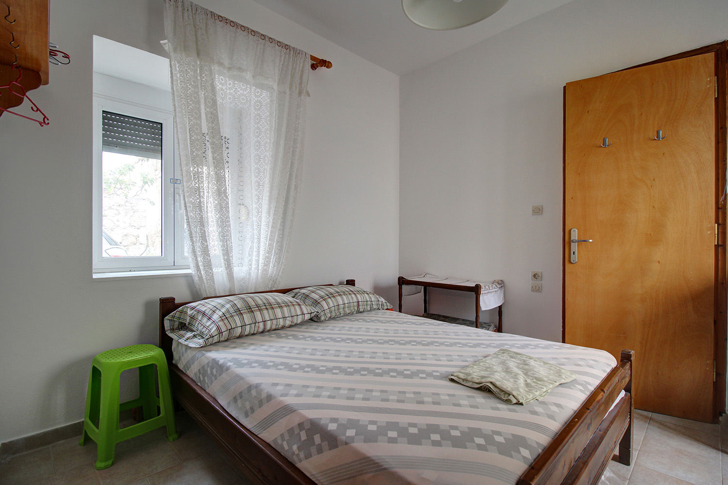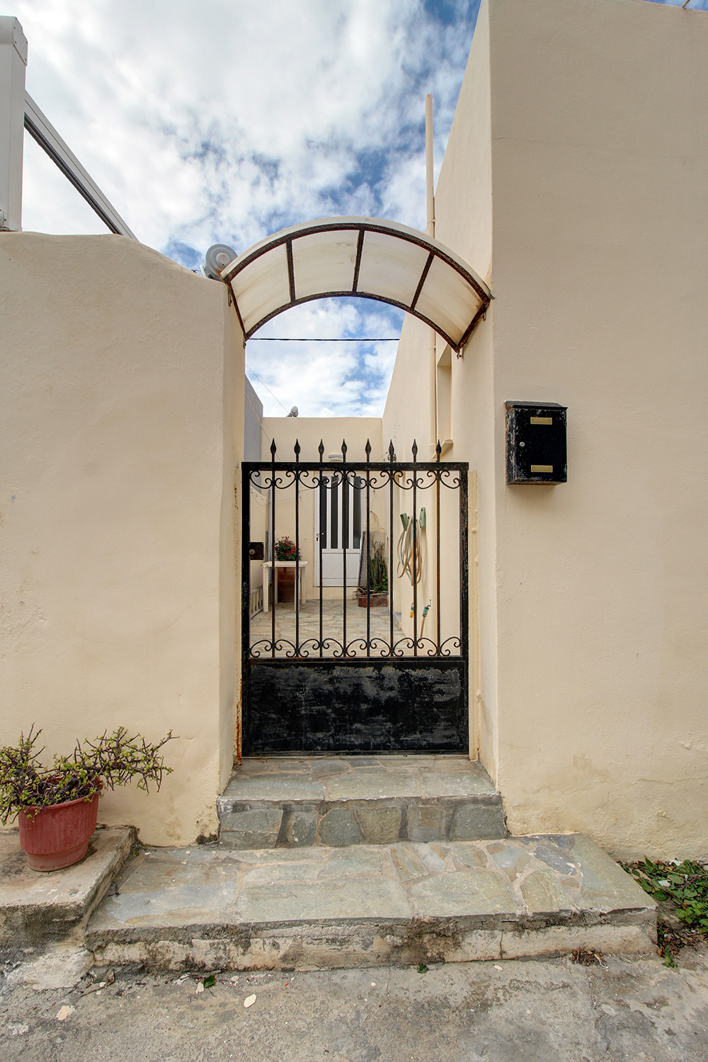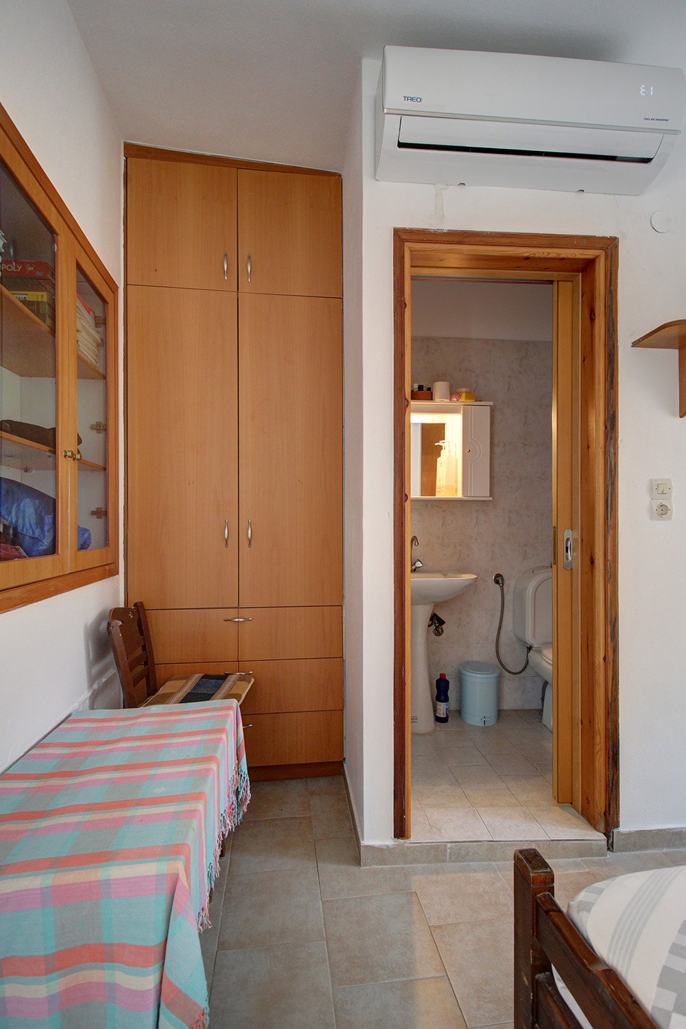 Von der Gasse bis zum Hauseingang ist ausreichend Platz für ein Auto. Auch direkt am Haus gibt es oft Parkmöglichkeiten. Etwa 100 m entfernt verläuft die Küstenstraße von Paleochora, wo weitere Parkplätze vorhanden sind. Das Gebäude hat einen L-förmigen Grundriss und umschließt an der Rückseite einen kleinen, privaten Innenhof. Von dort gelangt man in den Wohn- und Küchenbereich. Hier befindet sich auch ein Badezimmer mit Dusche sowie ein zweiter Ausgang zur Straße im Norden. Die Raumaufteilung folgt dem traditionellen lokalen Baustil, bei dem alle Zimmer in einer Reihe liegen und jeweils separat mit dem Außenbereich verbunden sind. Nach dem Wohnbereich befindet sich ein Schlafzimmer mit Zugang zur Straße im Westen sowie ein zweites, das zum Innenhof führt. Dieses zweite Schlafzimmer verfügt über ein eigenes Badezimmer. Das Haus ist klimatisiert und mit Aluminiumtüren und -fenstern mit Insektenschutzgittern und Doppelverglasung ausgestattet. Die meisten Möbel sind aus Massivholz und im Kaufpreis enthalten, ebenso wie die vorhandenen Elektrogeräte.