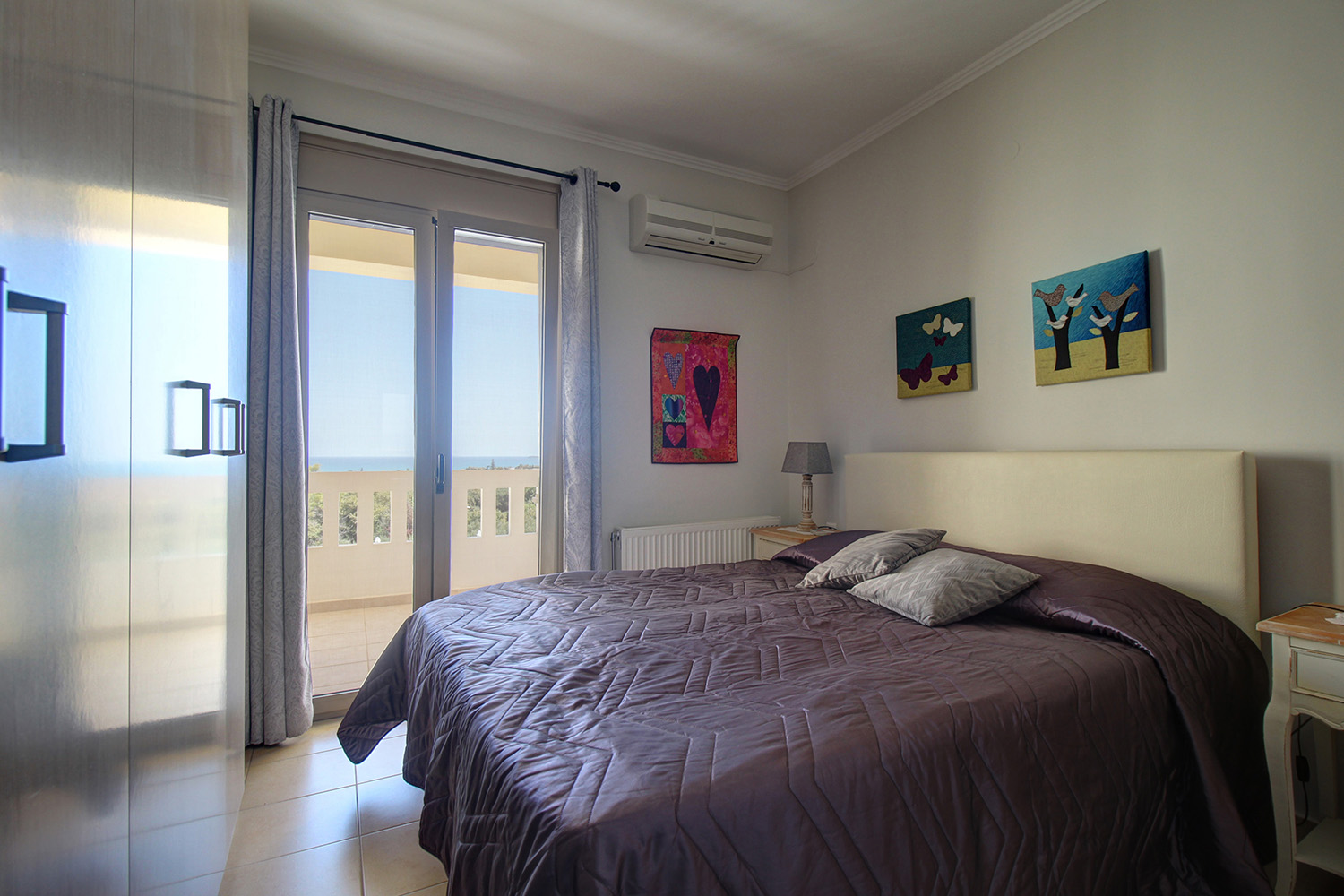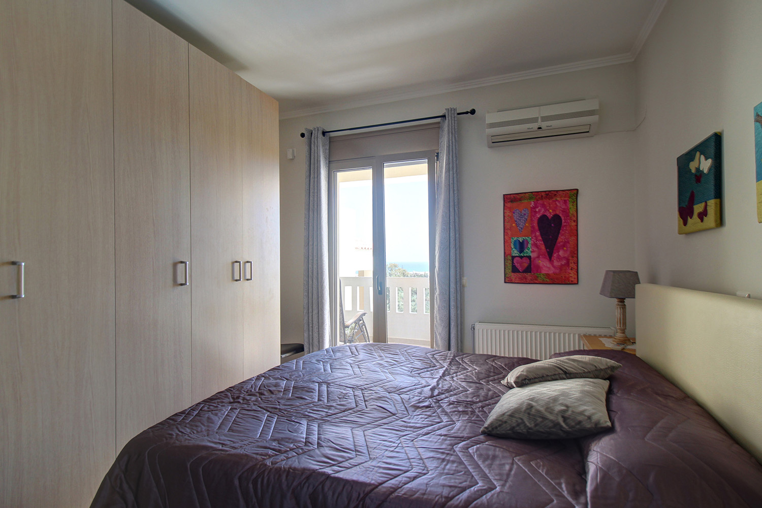 Das Obergeschoss verfügt über zwei überdachte Terrassen, jeweils nach Westen und Osten ausgerichtet, eine vor dem Haupteingang und die andere vom Wohnzimmer aus zugänglich. Beide Terrassen bieten Meerblick, wobei das Wohnzimmer so positioniert ist, dass es einen ungestörten Blick bis zur Insel Agioi Theodoroi bietet. Das Erdgeschoss ist offen gestaltet und verfügt über einen geräumigen Wohnbereich mit Kamin, Essbereich und eine Küche mit zahlreichen Schränken, einer großen Arbeitsplatte und einer Speisekammer. Die Innenräume sind hell, sorgfältig eingerichtet und verfügen über neue, isolierte Vinylböden. Die großzügige Terrasse mit Blick auf den Pool dient als Erweiterung des Wohnbereichs und eignet sich ideal für einen Kaffee oder eine Mahlzeit im Laufe des Tages. Eine Innentreppe führt zu zwei Schlafzimmern im Obergeschoss, jeweils mit großen Einbauschränken und Zugang zum Balkon. Ein Schlafzimmer verfügt über ein eigenes Bad, während ein Hauptbad mit Dusche und Waschmaschine den Rest der Etage versorgt.