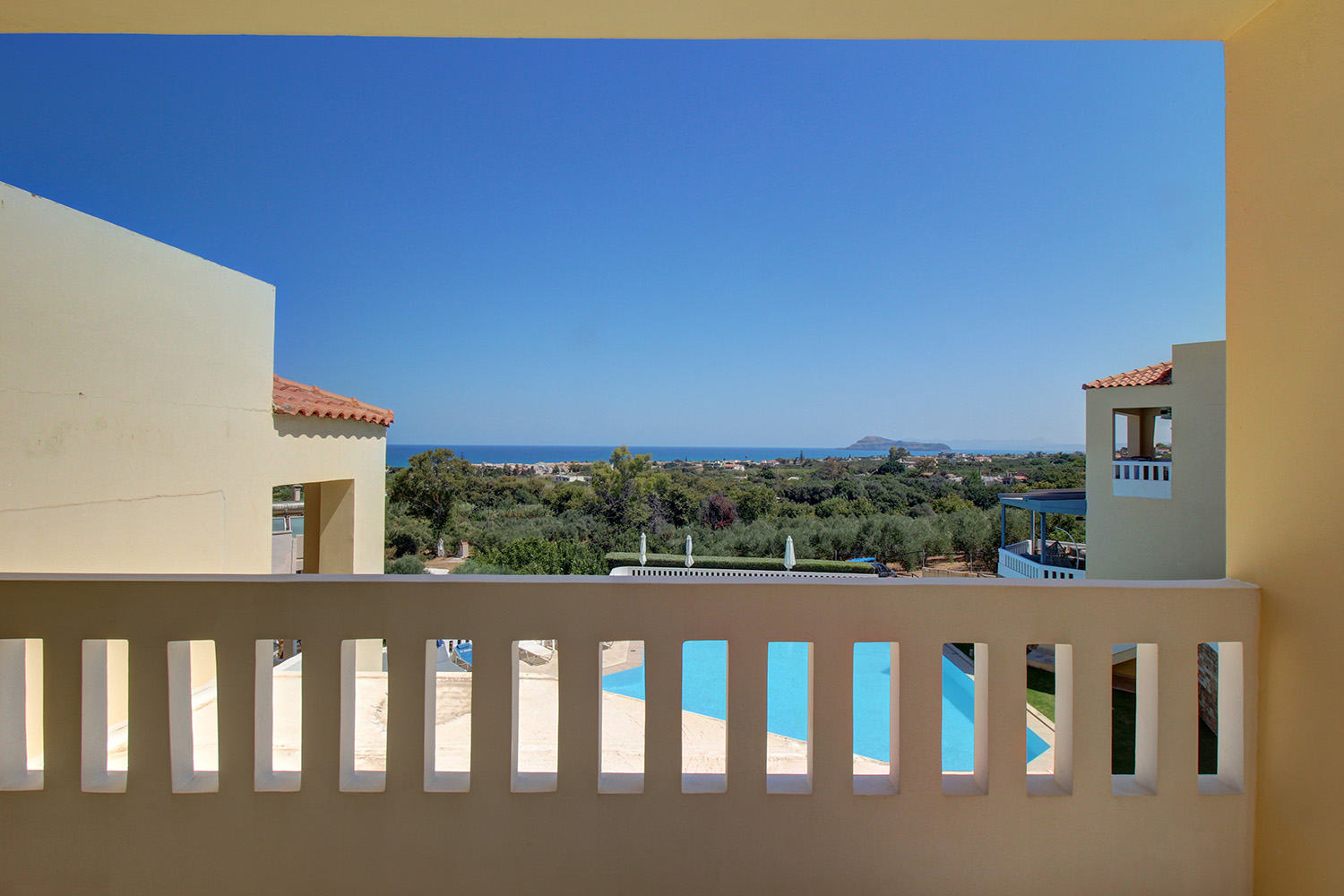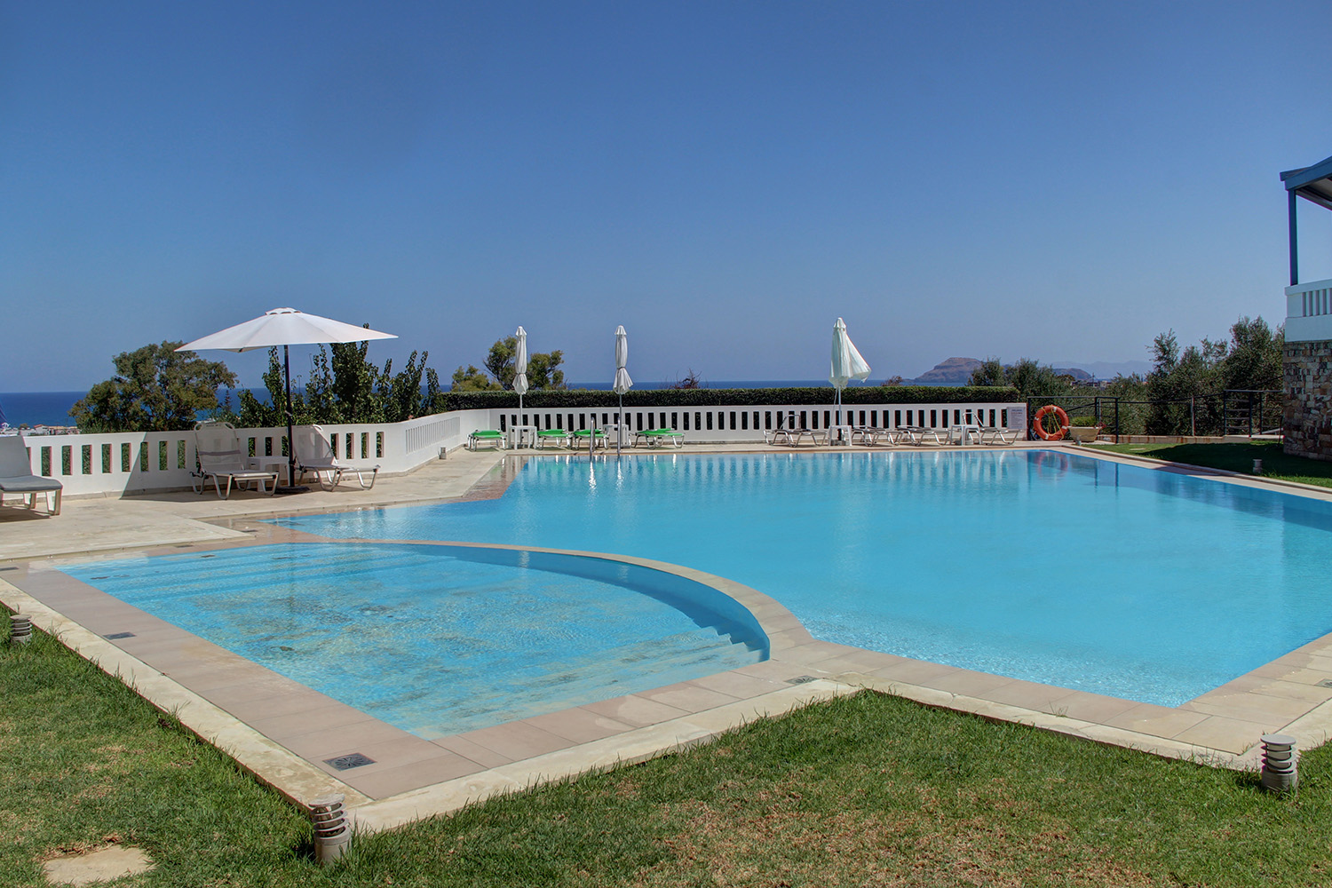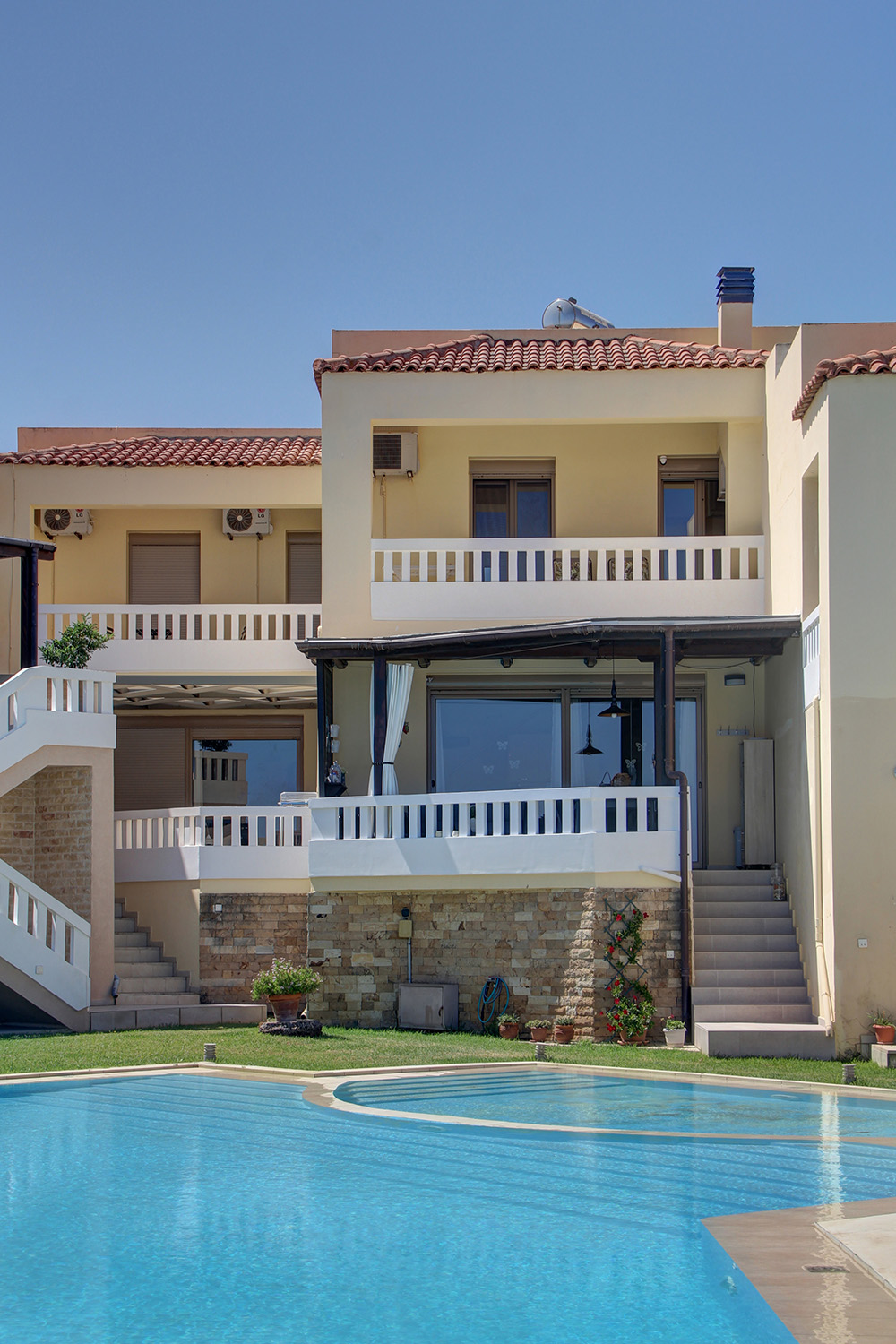 Dieses Haus ist eines von acht Wohneinheiten in einer durchdachten Anlage mit großem Gemeinschaftspool und angelegtem Garten mit Rasen. Jedes Haus ist unabhängig, und dieses Anwesen am westlichen Rand des Grundstücks bietet die schönste Aussicht der Anlage. Der 160 m² große Pool umfasst einen Kinderbereich. Auf einer unteren Ebene befindet sich ein Parkplatz mit zwei für das Haus reservierten Stellplätzen. Die Gebäude liegen an einem Hang mit nordöstlicher Ausrichtung. Garten und Pool liegen erhöht hinter einer hohen Stützmauer und bieten einen weiten, unverbaubaren Blick auf das Meer und die Insel Agioi Theodoroi. Hinter dem Grundstück endet die städtebauliche Planung des Gebiets, sodass die Aussicht auch in Zukunft frei bleibt.