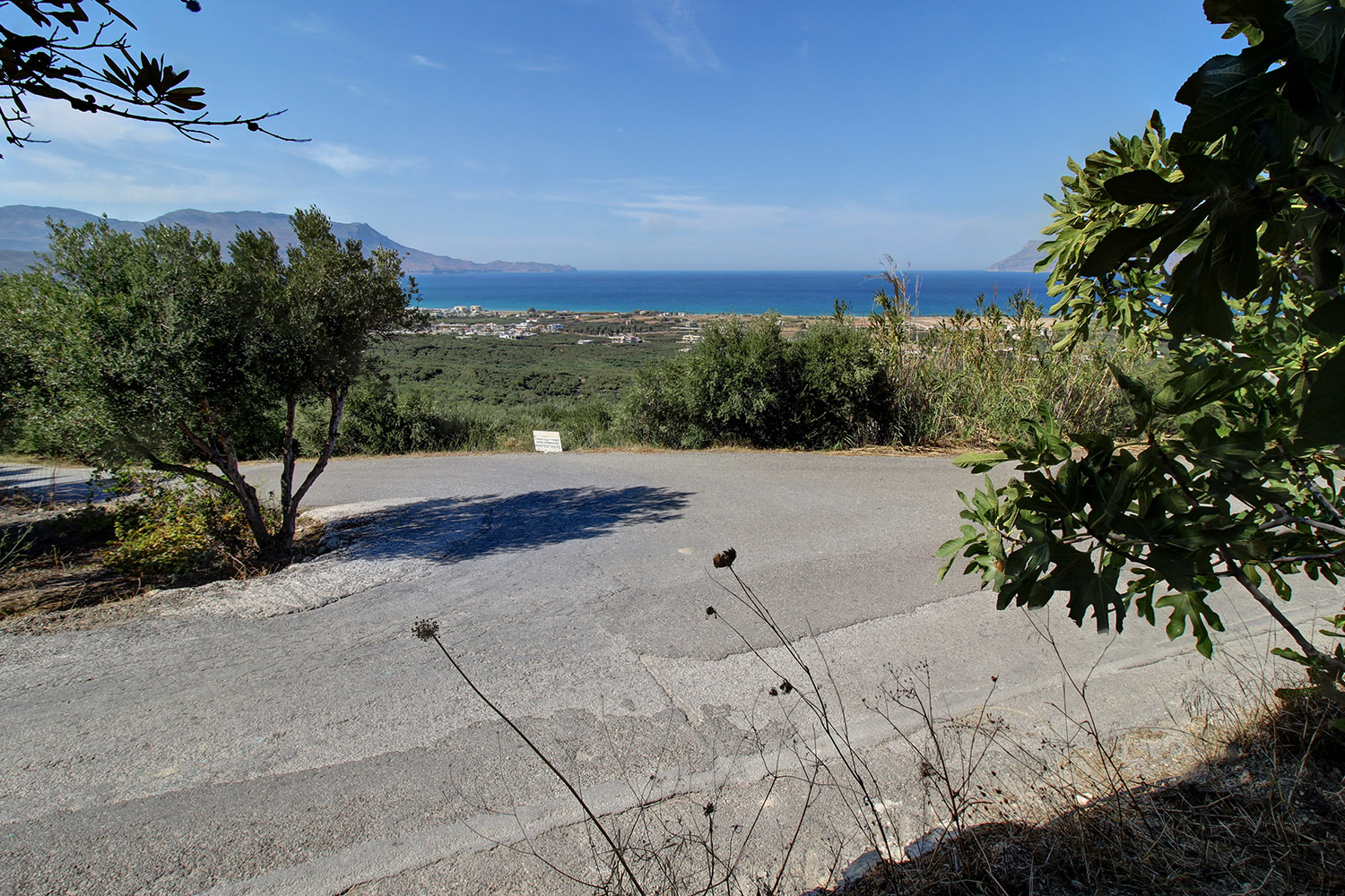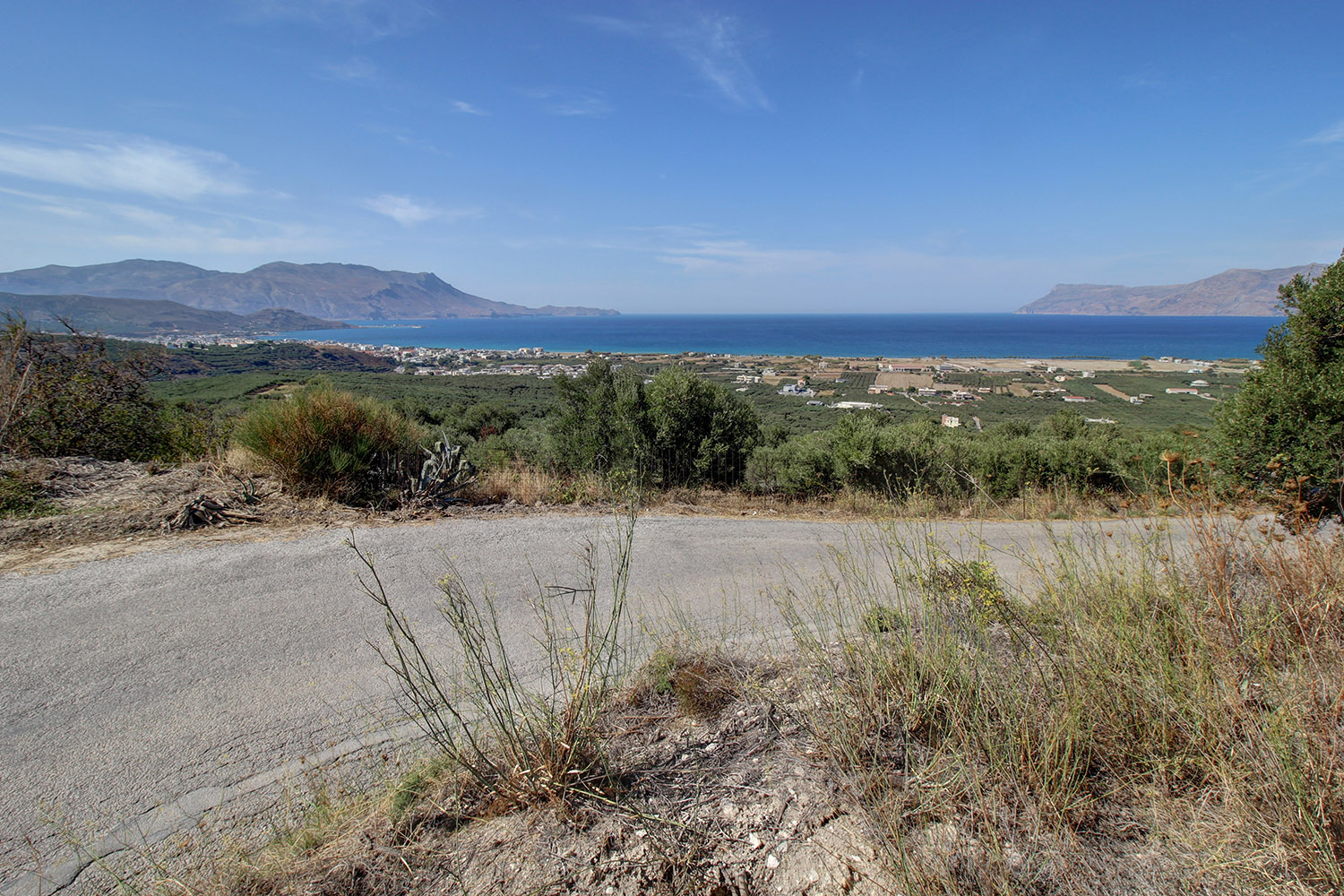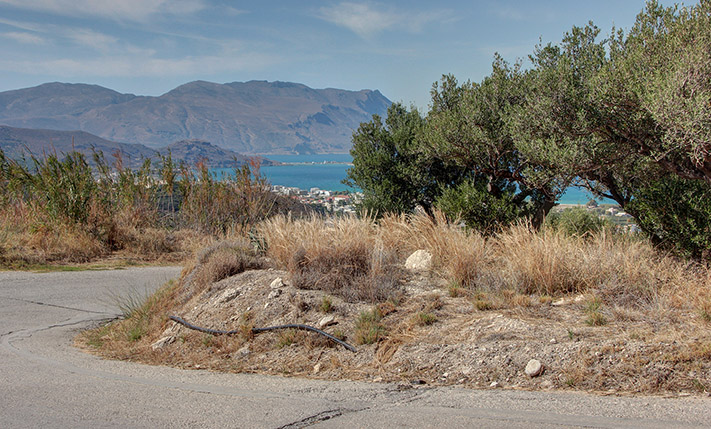 The plot is on a north-facing hillside south of Kissamos, from where the 180°views are excellent over the bay of the same name. There are two opposite frontages on an asphalt road and on the sea side there is a slope, which ensures that the views will remain as they currently are. The plot comes from the partition of a larger property and there is the possibility for small modifications. The land is gently sloping with frontages on the south and the north sides and there are approximately 17 mature and productive olive trees.