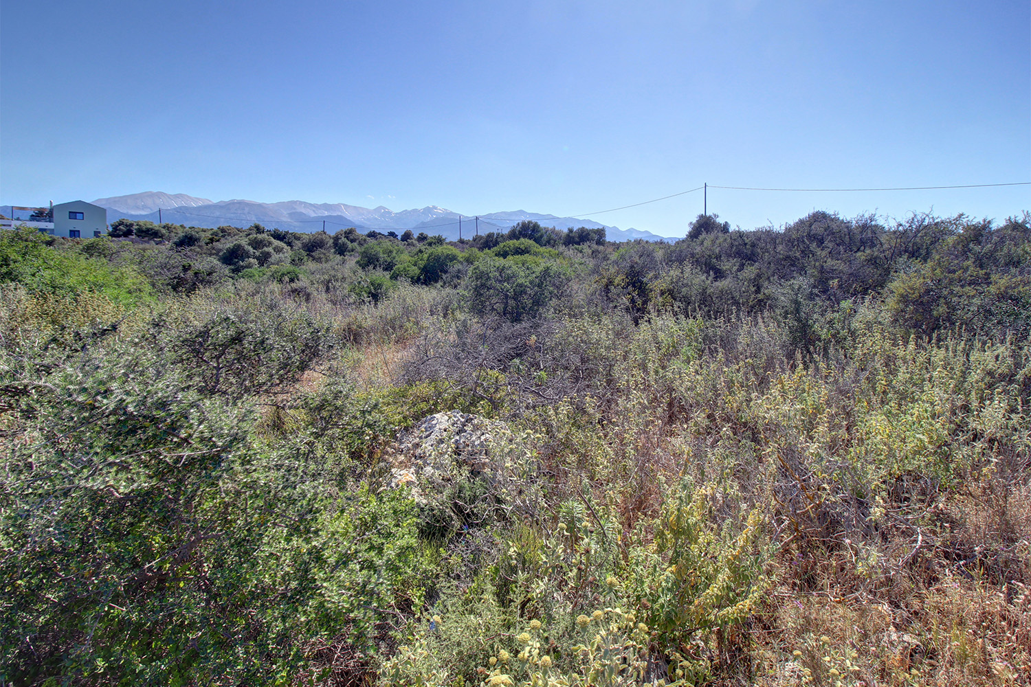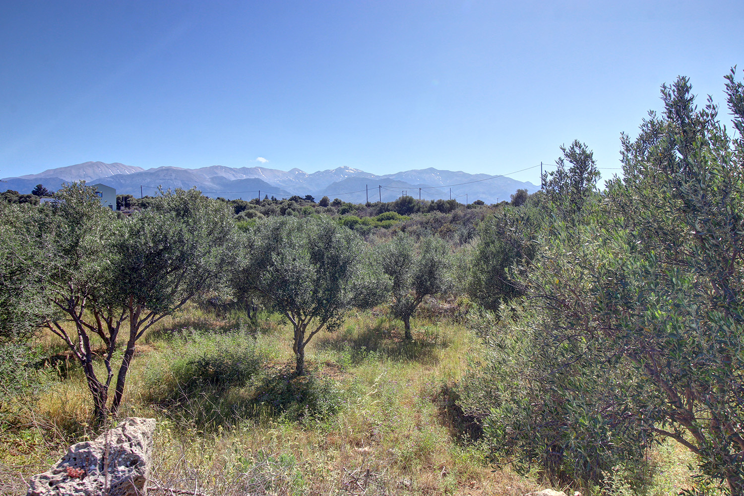 The property is in an excellent location in nature. It is surrounded by olive groves, the wild Cretan landscape and some luxury residences in the distance. It is a buildable plot with good shape and large frontages, on a passable rural road to the west and a second one along the south side. The ground has a gentle northeast slope and there are some areas with low native vegetation as well as about 65 mature and productive olive trees. The views are impressive up to the sea and towards the ridge of the White Mountains, from all points and from the natural ground level. A dirt road reaches the property, which, however, is maintained and is passable along its entire length. There is also an asphalt road at a distance of about 1 km.
