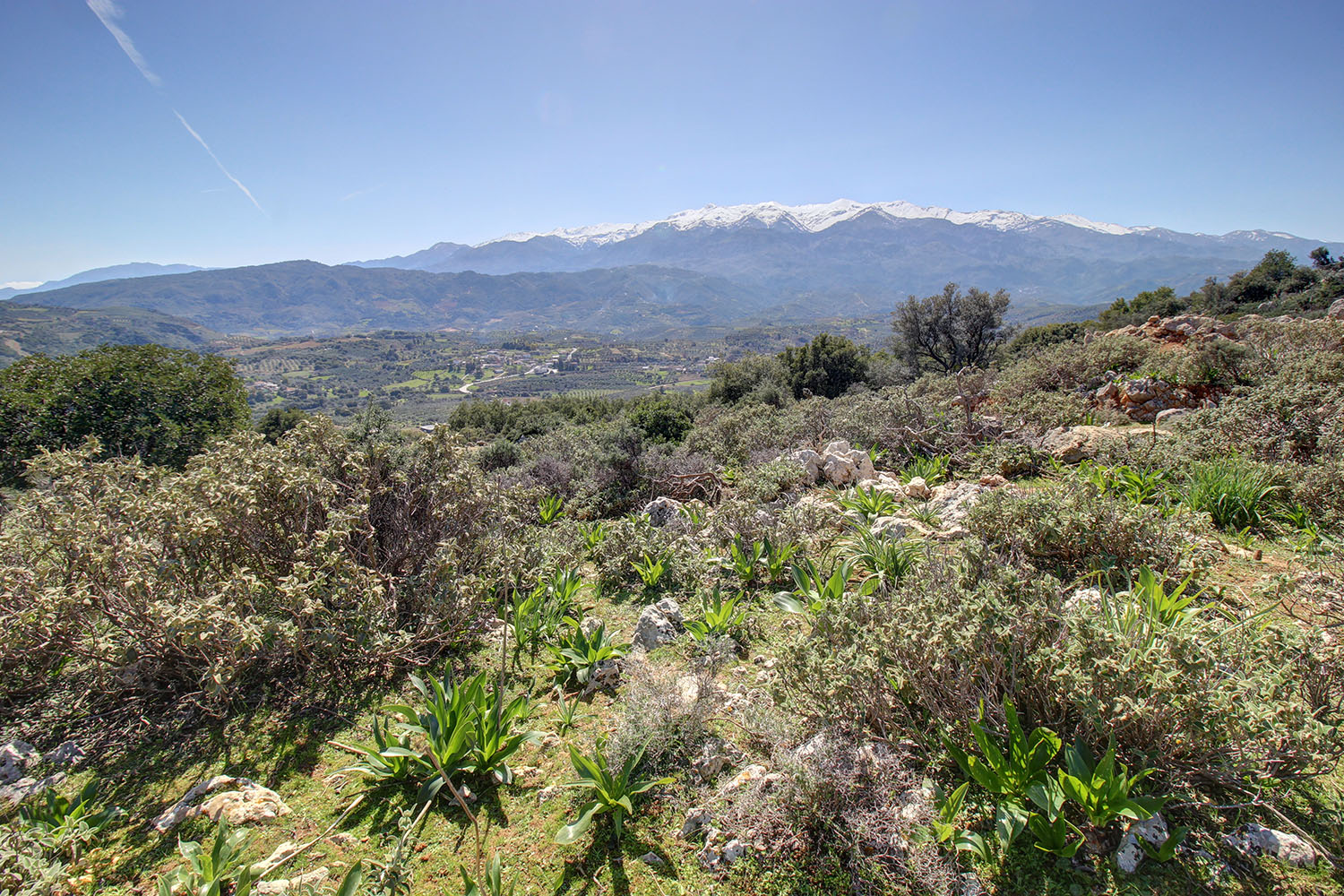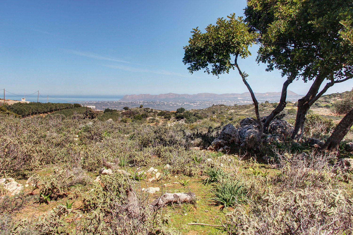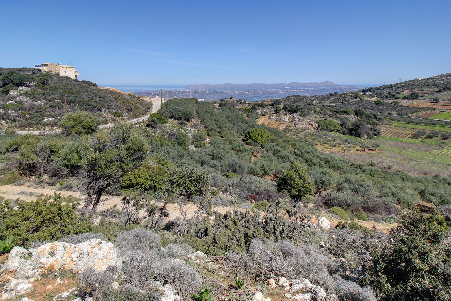 The property is mainly surrounded by luxury villas and wooded areas with natural vegetation, just outside and south of Chania city. It is a buildable plot with good shape and frontages on roads from three sides. The road at the highest level is paved with asphalt and the other two are rural. The ground has a northeast slope and is rocky while there are flat spots, which facilitate any construction. The views from all points are impressive over the city and up to the sea to the north but also towards the White Mountains from the south side.