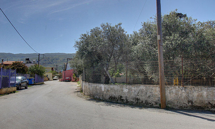 The plot is at the junction of two asphalt roads, which are quiet with little traffic, in a village 5 minutes south of the city center of Chania. Its shape is rectangular and has average dimensions of 40 m * 23 m with frontages on the north and east, respectively. The ground is flat and there are 13 big olive trees and some orange trees. The plot is an excellent choice for the construction of a small complex of apartments or it can be divided in order to construct two large detached houses.
