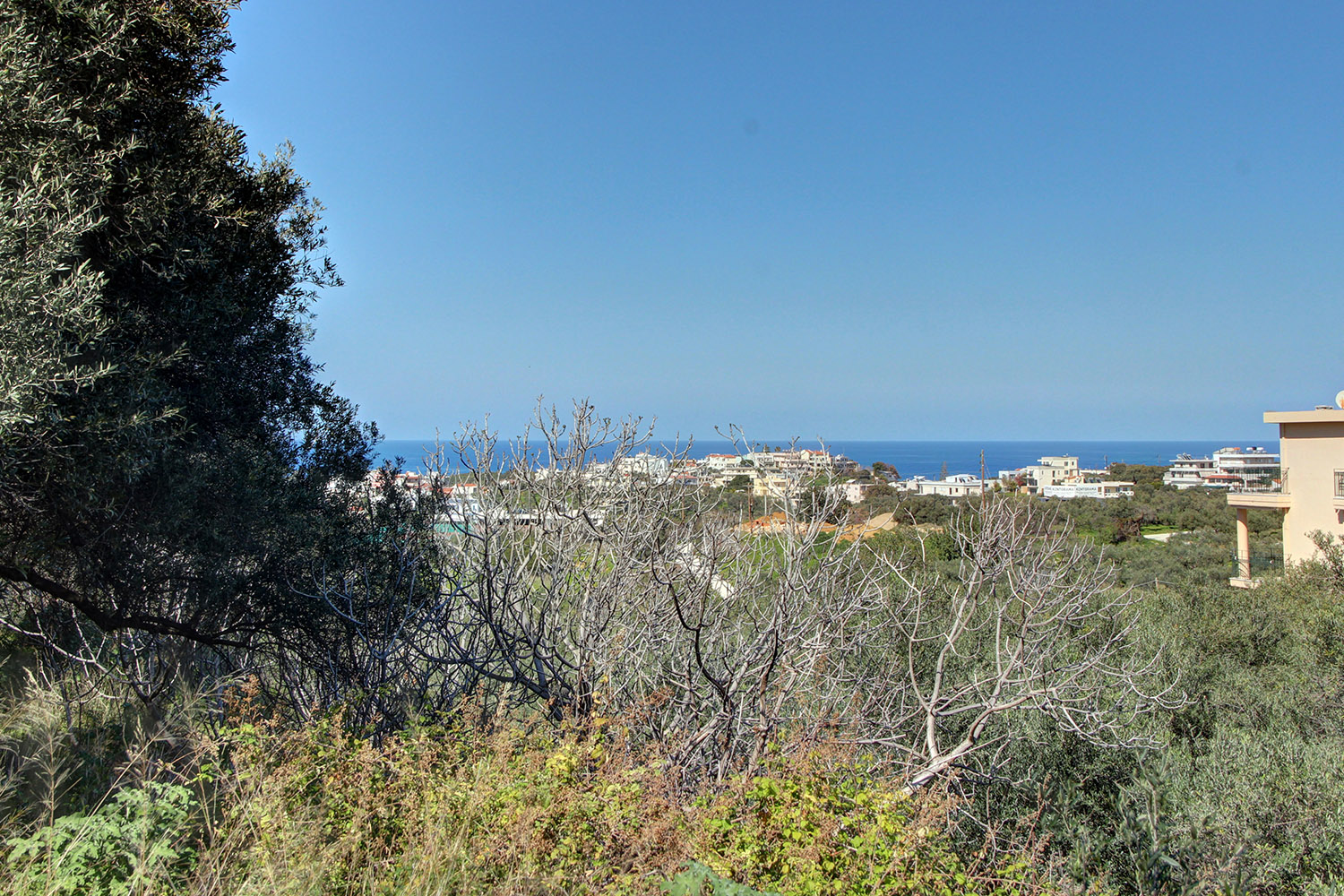 The plot is in a neighborhood southwest and about 4 km away from the city center. It is "L" shaped and has about 20 mature olive trees. It is on a hillside with a northeasterly slope but the land is divided into two large flat terraces. Along the northern side there is a high slope that ensures unobstructed views. If you remove some of the trees, then from any building that will be constructed in the future on the upper terrace, you will have beautiful views up to the sea even from the natural ground level.