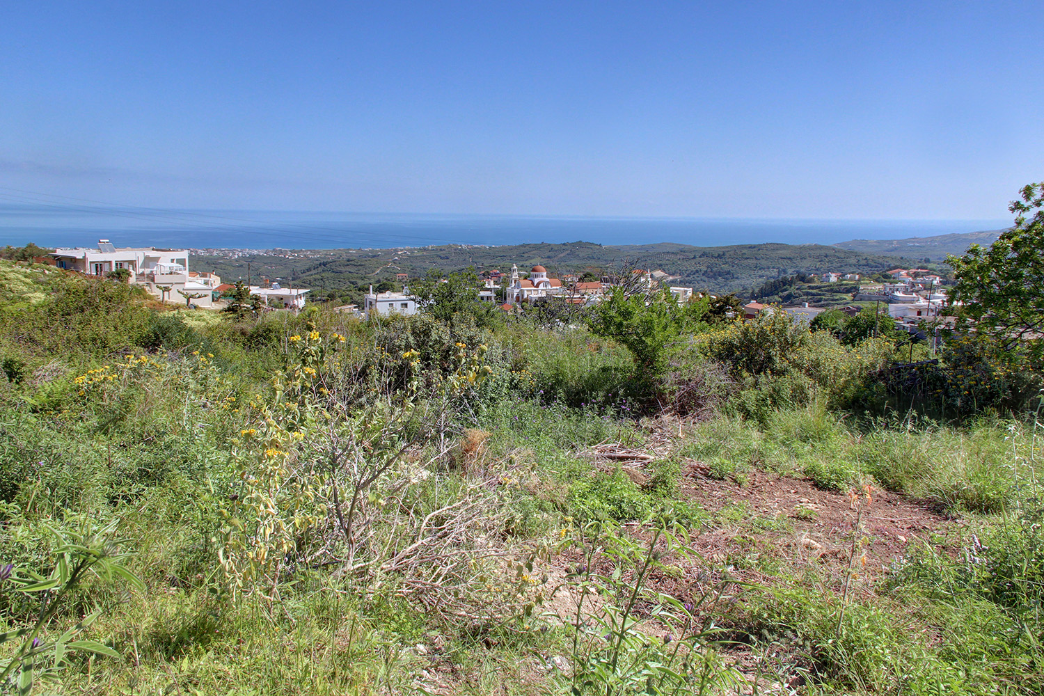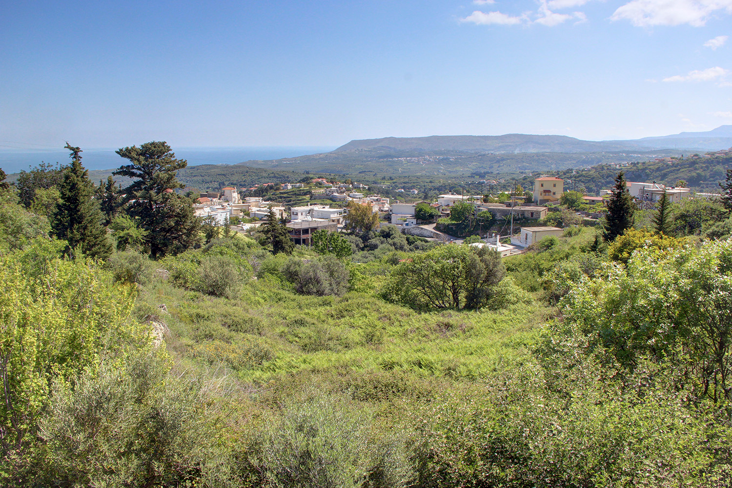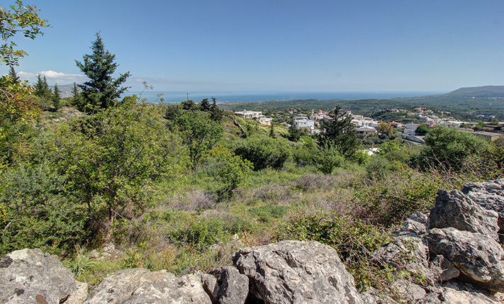 The property is located just outside the village boundary of Kournas, a traditional settlement in the municipality of Apokoronas. It is a buildable plot of land with a good shape and natural vegetation that can be cleared to suit any development plan. The terrain is naturally divided into two sections, each on a small rise. The view is panoramic and unobstructed from all points, even from the lower level. Of the two flat areas, the eastern one is particularly suitable for the construction of a house, with the natural terrain easily integrated into the outdoor design.