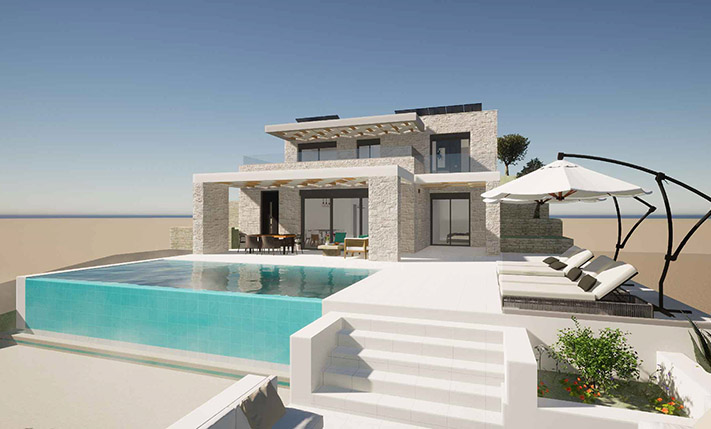 The study of the preliminary approval is contemporary and the building follows the slope of the natural ground on two levels. On the frontage there is a private swimming pool. The ground floor has a WC for visitors, a bathroom that is suitable for disabled people as well as a corresponding bedroom. The kitchen and the living area are located in an open-plan space and have access to the pool. Upstairs, we find two additional bedrooms, each of which has its own bathroom and exit to balcony with sea views. The study is functional but in any case can be modified in order to build anything according to your needs.