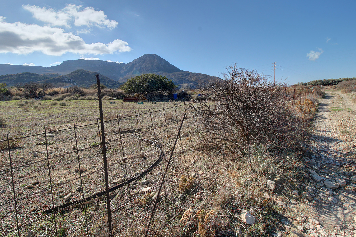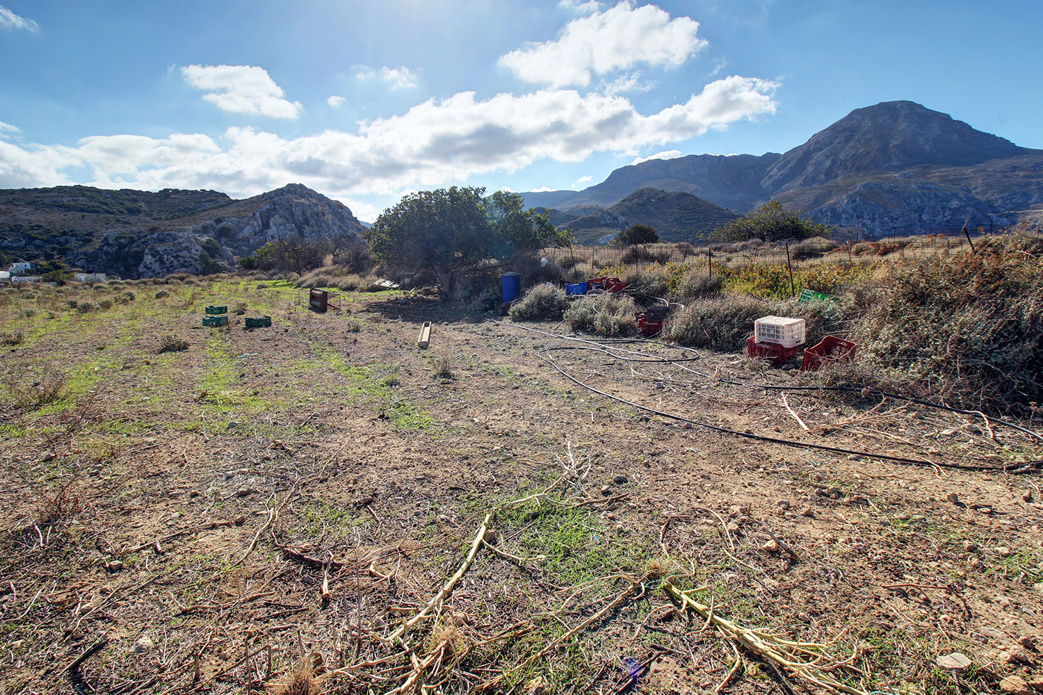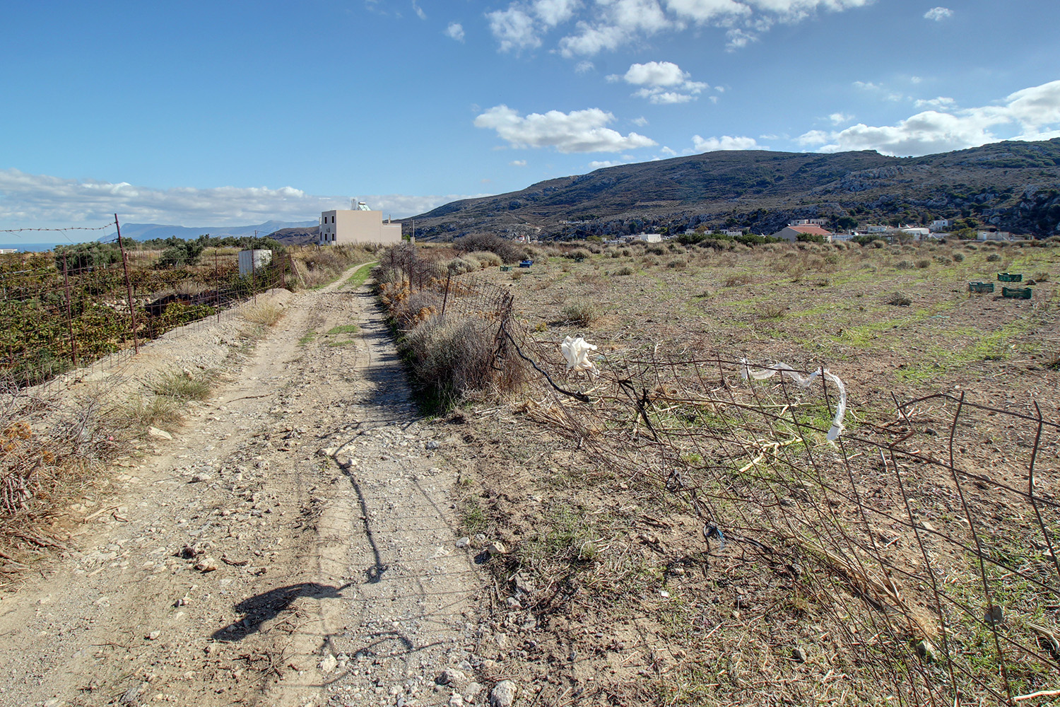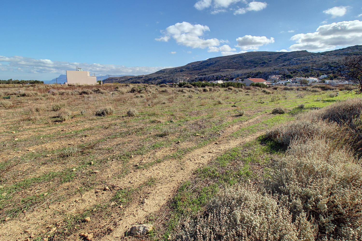 The plot is in the village Platanos of the municipality Kissamos. It is on the western edge of the village and the residential zone ends at its frontage, which ensures that the views right in front will remain as they currently are in the immediate future, as much as possible. A passable dirt road reaches the point while there is an asphalt road approximately 70 m away. The ground is flat and the frontage is on the north-west side. The views are beautiful over the wild landscape that surrounds the area and up to the sea to the north in the distance.