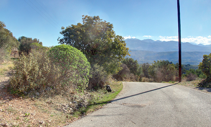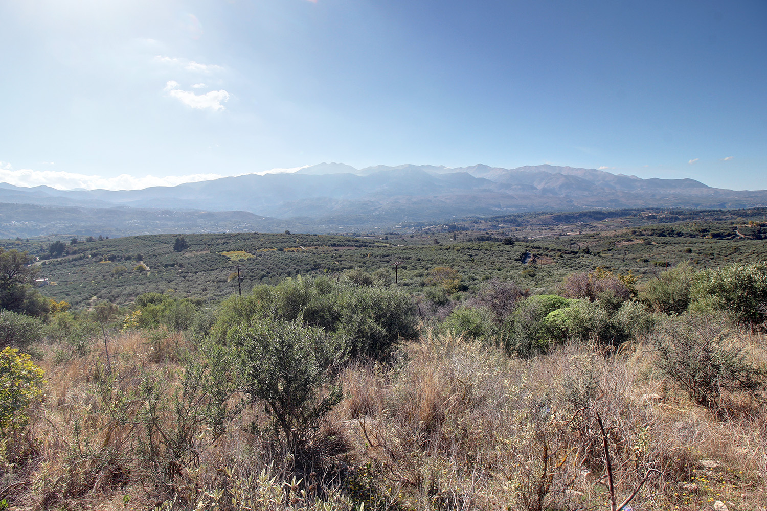 The property is just outside the small town of Vamos, on a hillside with southwest views over the plain of the Almyros river and up to the White Mountains in the distance. The plot has a large frontage on a provincial road at its lower southwest level as well as alternative access from its west side. The ground has a southwest slope, is gently rocky and there are some olive trees as well as low native vegetation. The views from all points are impressive towards the White Mountains. The property is an excellent choice if you want to build a house with unique views and large outdoor spaces.