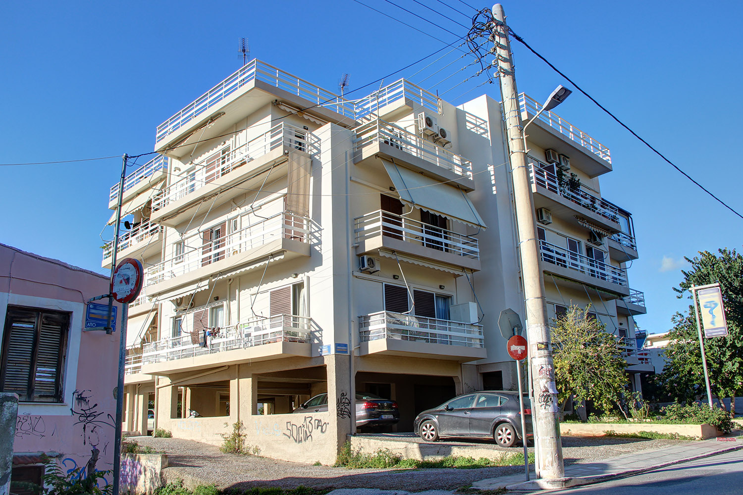 The apartment is in an excellent location, in the district Amperia, just 700 m from the Court House Square ("Dikastiria"). It is on the second floor of a three-storey block of flats with additional covered parking area on the ground floor. The sale of the property is to include two parking spots, while there is an extra one available after negotiation. The building is in good condition and has an elevator.
