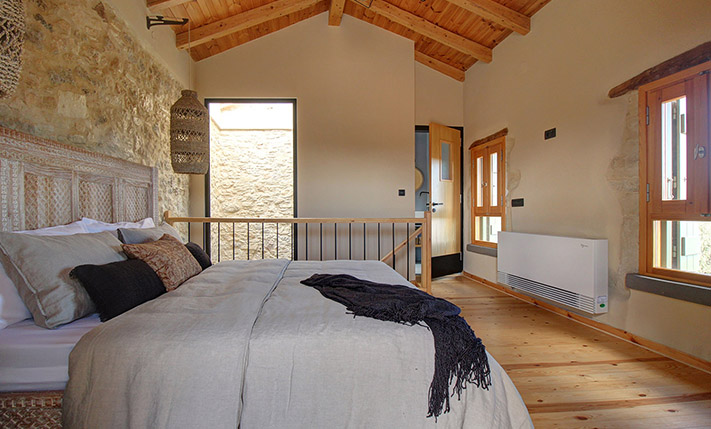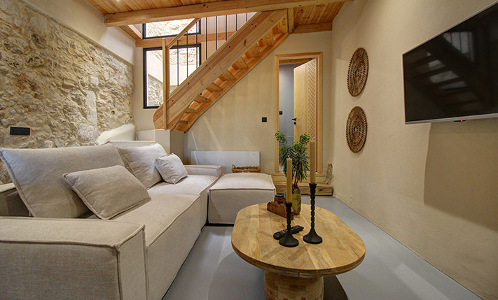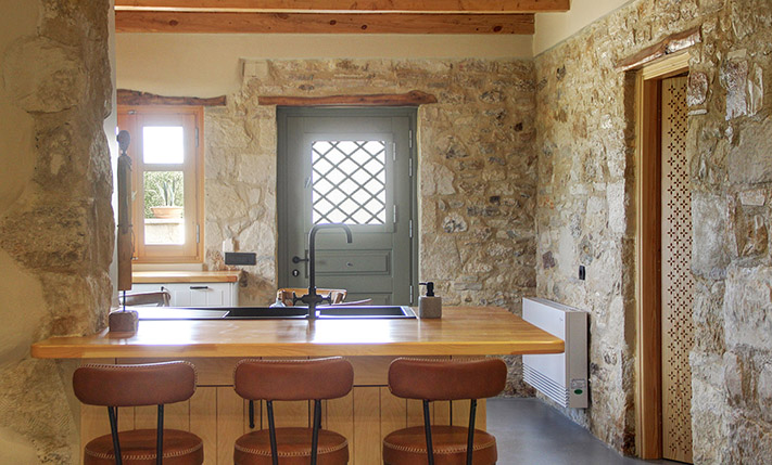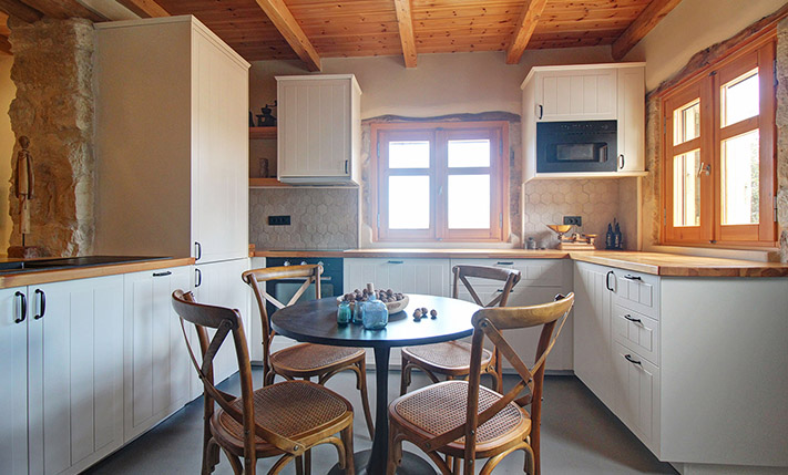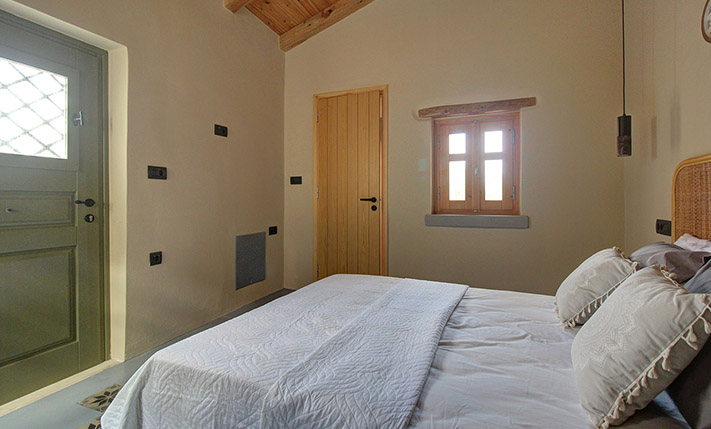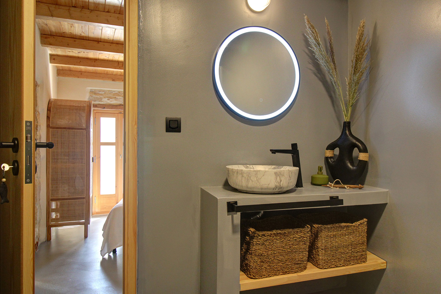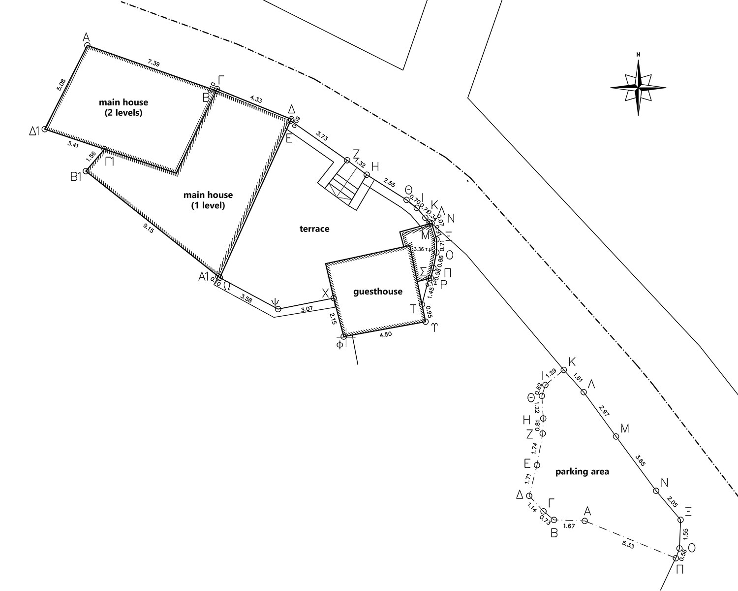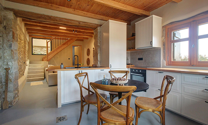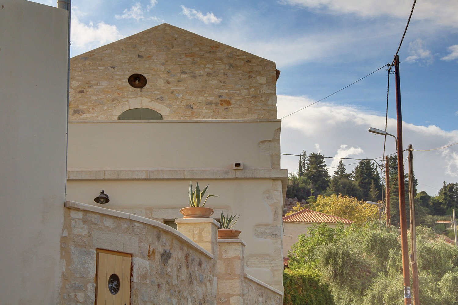 The residence is built on a plot of 167 m², while a private parking area for two vehicles is available on an additional plot of 41 m², located about 10 m away. The courtyard of the house is enclosed by a stone wall, ensuring good privacy. In the courtyard, there is also a large well that has water all year round. The main entrance of the house opens into the kitchen, which is modern and fully equipped with a central island, a spacious countertop, and all necessary appliances. Next to it is the living room, beautifully lit through a skylight at the back. From the living room, there is access to a guest bathroom, which also has space for a washing machine. Each bedroom in the house has its own en-suite bathroom with a shower. One of the bedrooms is on the ground floor, while the master and largest one occupies the upper floor. The guesthouse includes a third bedroom, which also has its own bathroom. On the upper floor, there is an exceptionally large balcony with beautiful views, ideal for sunbathing.