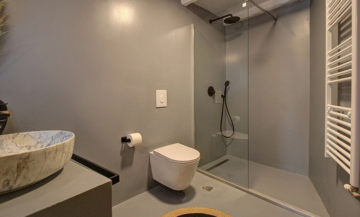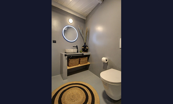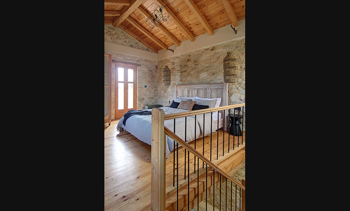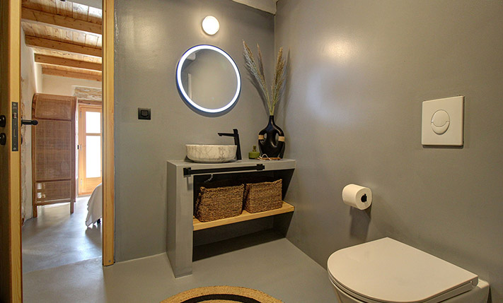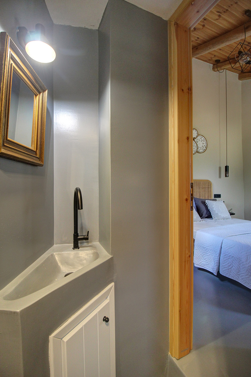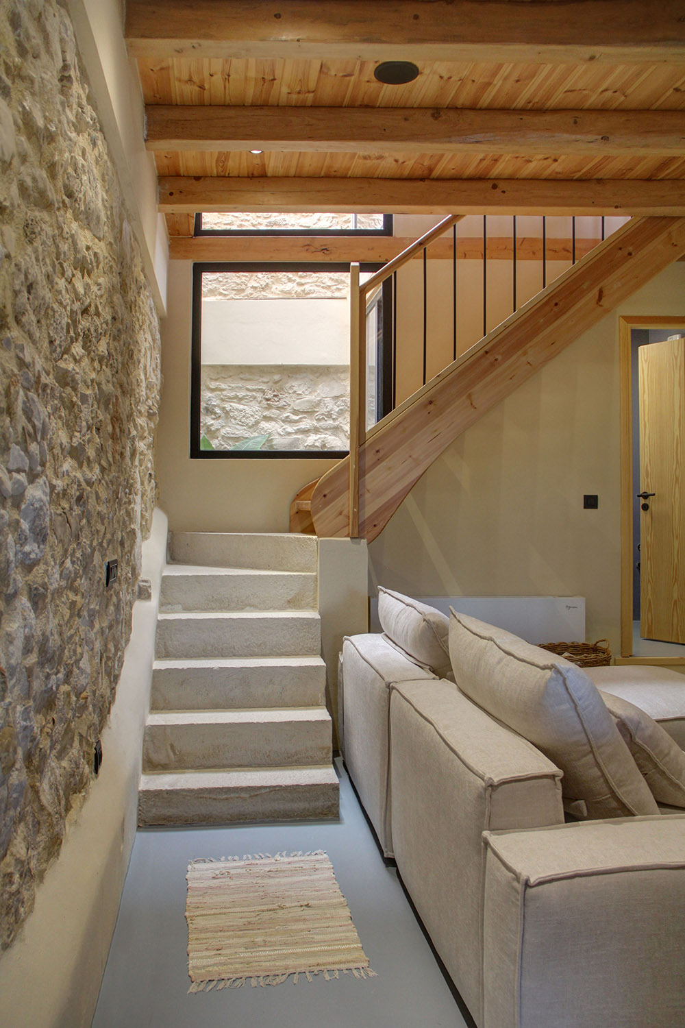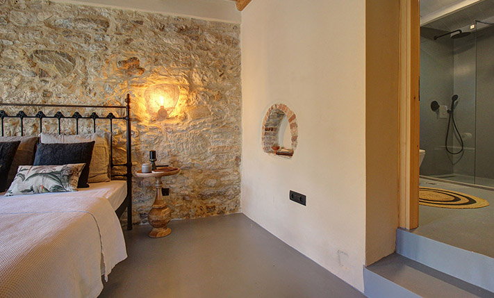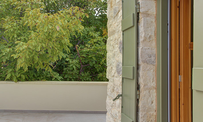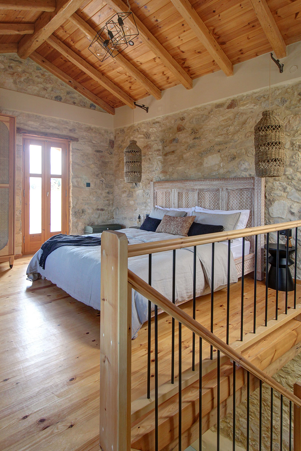The residence is built on a plot of 167 m², while a private parking area for two vehicles is available on an additional plot of 41 m², located about 10 m away. The courtyard of the house is enclosed by a stone wall, ensuring good privacy. In the courtyard, there is also a large well that has water all year round. The main entrance of the house opens into the kitchen, which is modern and fully equipped with a central island, a spacious countertop, and all necessary appliances. Next to it is the living room, beautifully lit through a skylight at the back. From the living room, there is access to a guest bathroom, which also has space for a washing machine. Each bedroom in the house has its own en-suite bathroom with a shower. One of the bedrooms is on the ground floor, while the master and largest one occupies the upper floor. The guesthouse includes a third bedroom, which also has its own bathroom. On the upper floor, there is an exceptionally large balcony with beautiful views, ideal for sunbathing.