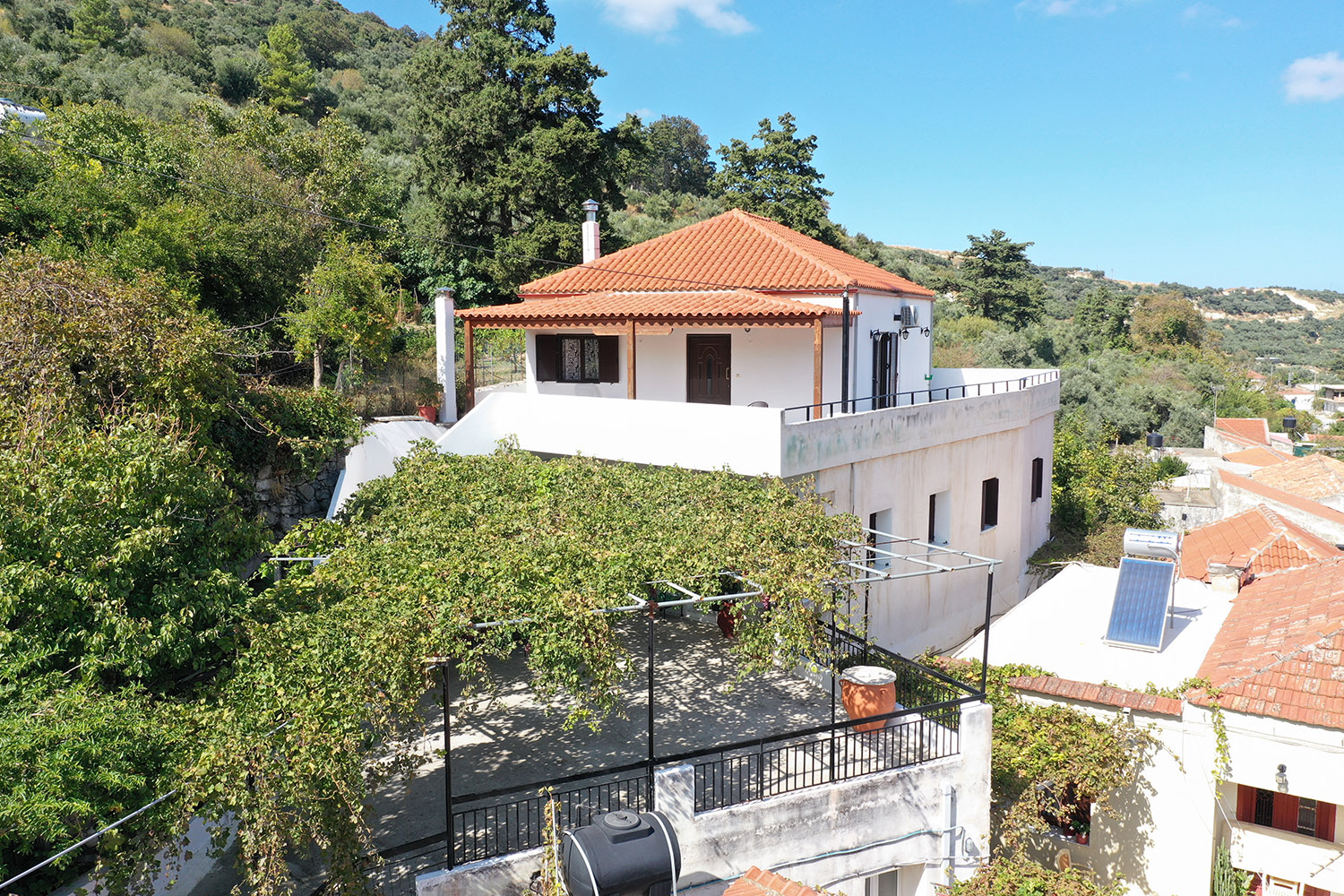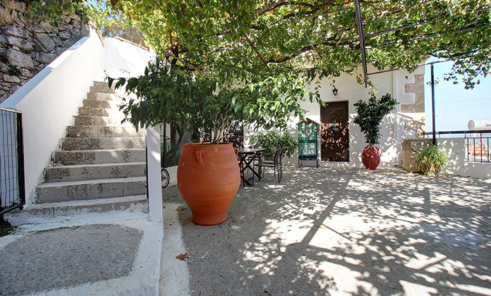 Although the village has enough tourism, a quiet cement road reaches the area. At the frontage of the property, there is a large courtyard and parking space. The entire courtyard is covered with vine and has beautiful views over the Gorge Topolia and up to the sea and the bay of Kissamos. The back side of the building also has a large unused space for garden, swimming pool or anything else that meets your needs.