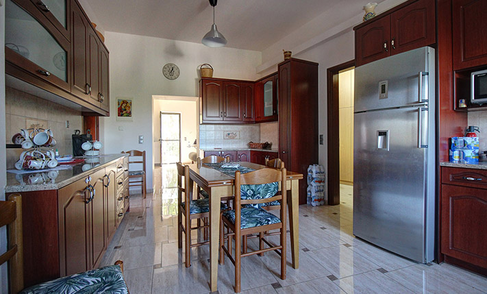The building is divided into two separate apartments, which are connected only externally. All the rooms of the lower floor are very spacious, high-ceilinged and, if you decide to reconfigure the spaces, you can add at least one extra bedroom. The main entrance opens onto an open-plan area with living space and dining space that are separated by an impressive arch. In the living area there is also a beautiful corner fireplace. The kitchen is in a separate room and has many cabinets and all the necessary electrical appliances. On the ground floor, there are also two bedrooms with fitted wardrobes, a bathroom with a bathtub and a storage room. An external staircase leads to the upper floor and to a terrace, which extends around the building, with views from all sides. Inside, there are an open-plan living, dining and kitchen area, two bedrooms and a bathroom.