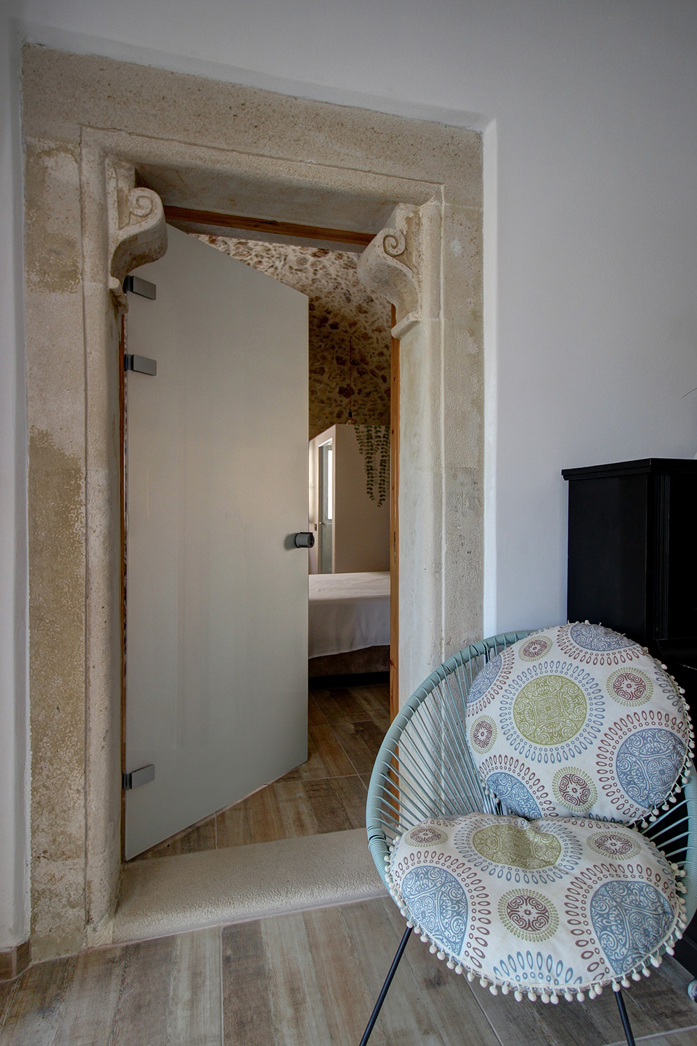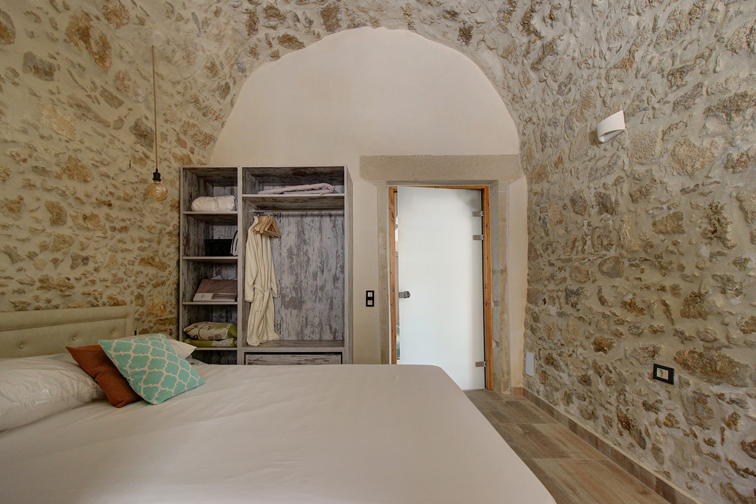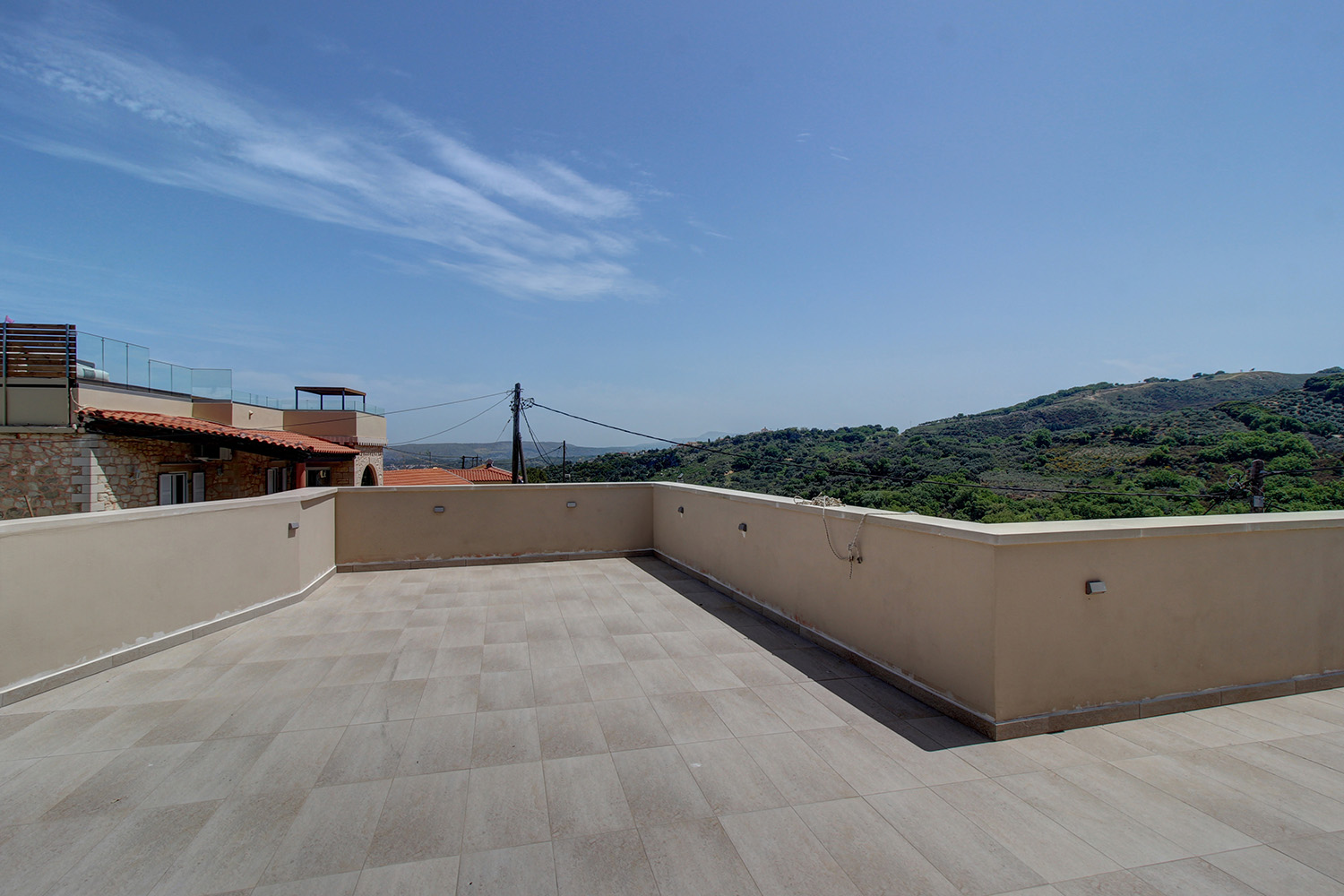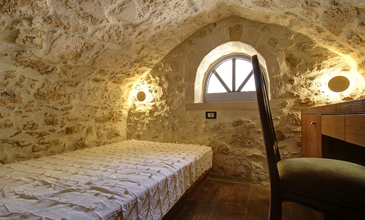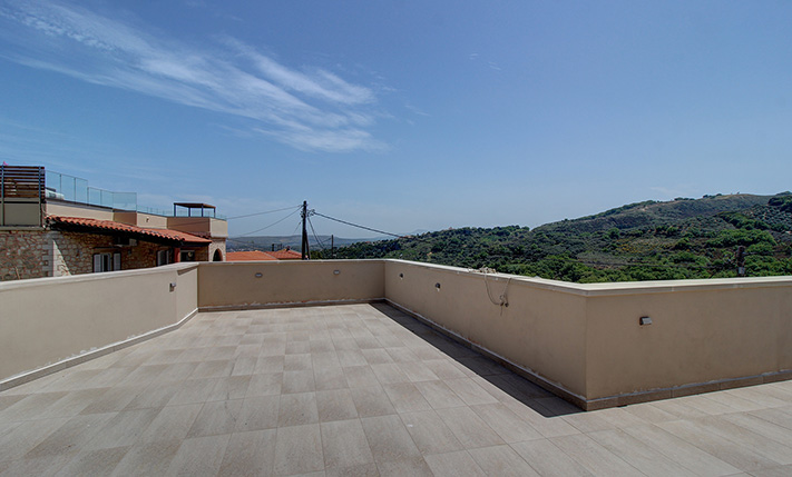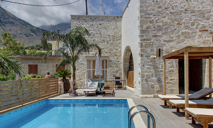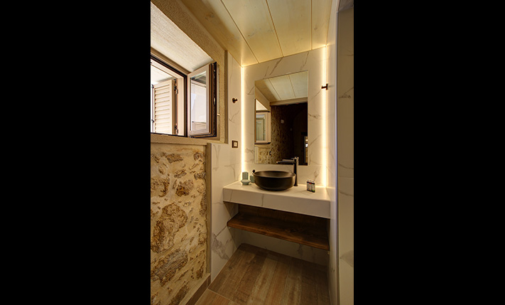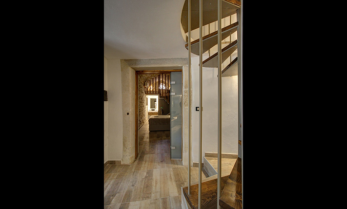 In front of the house there is a private pool about 25 m² while before our main entrance we find a large covered terrace, which is also used as a reception hall. Inside there is a large open-plan living and kitchen area, which is connected with the pool as well as with a picturesque cobbled path at the back side of the building. The kitchen has many cupboards and a modern island. On the ground floor there is also a large family bathroom as well as two vaulted bedrooms with en-suite bathrooms, in one of which there is a loft with a desk. An internal staircase leads upstairs, passes through a small guest-bedroom and ends in the master bedroom, which is en-suite and has exit to a large balcony with jacuzzi and sea views.