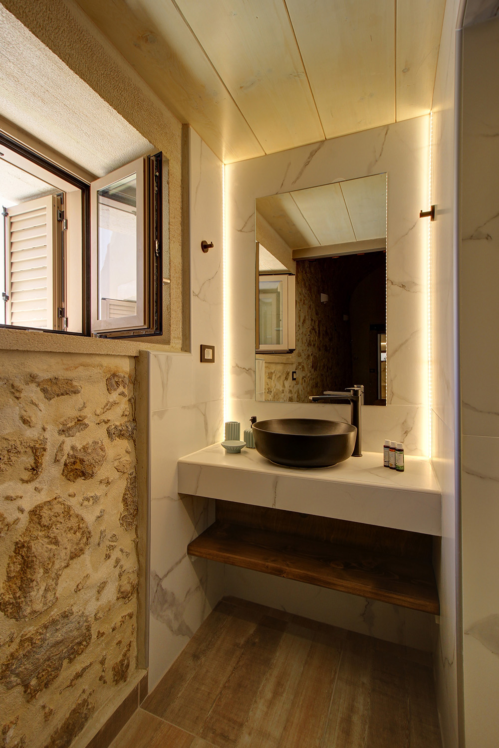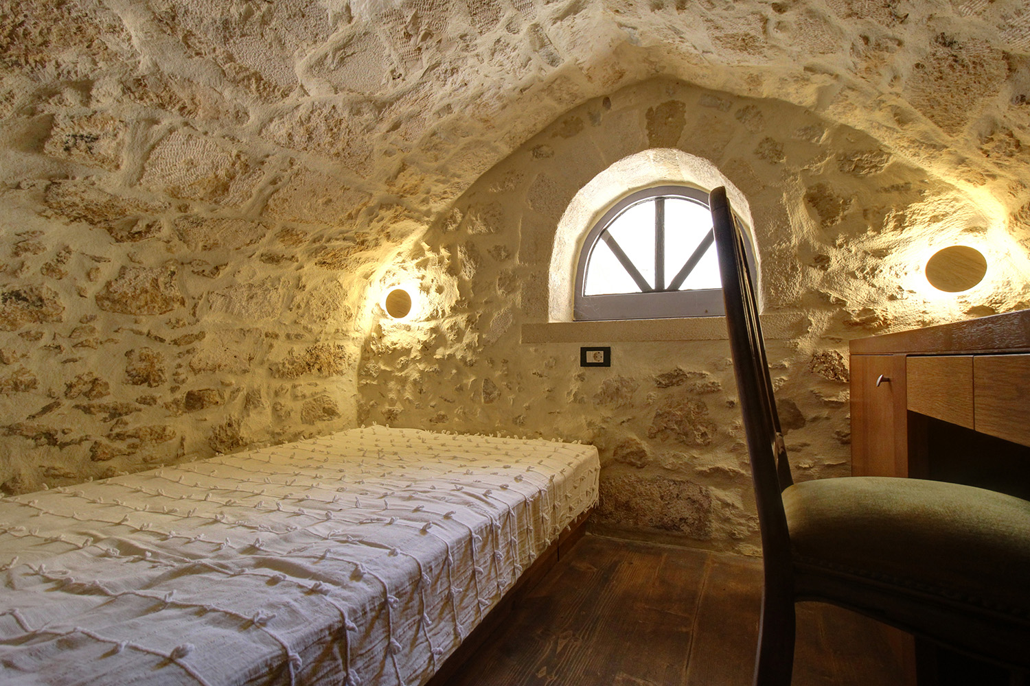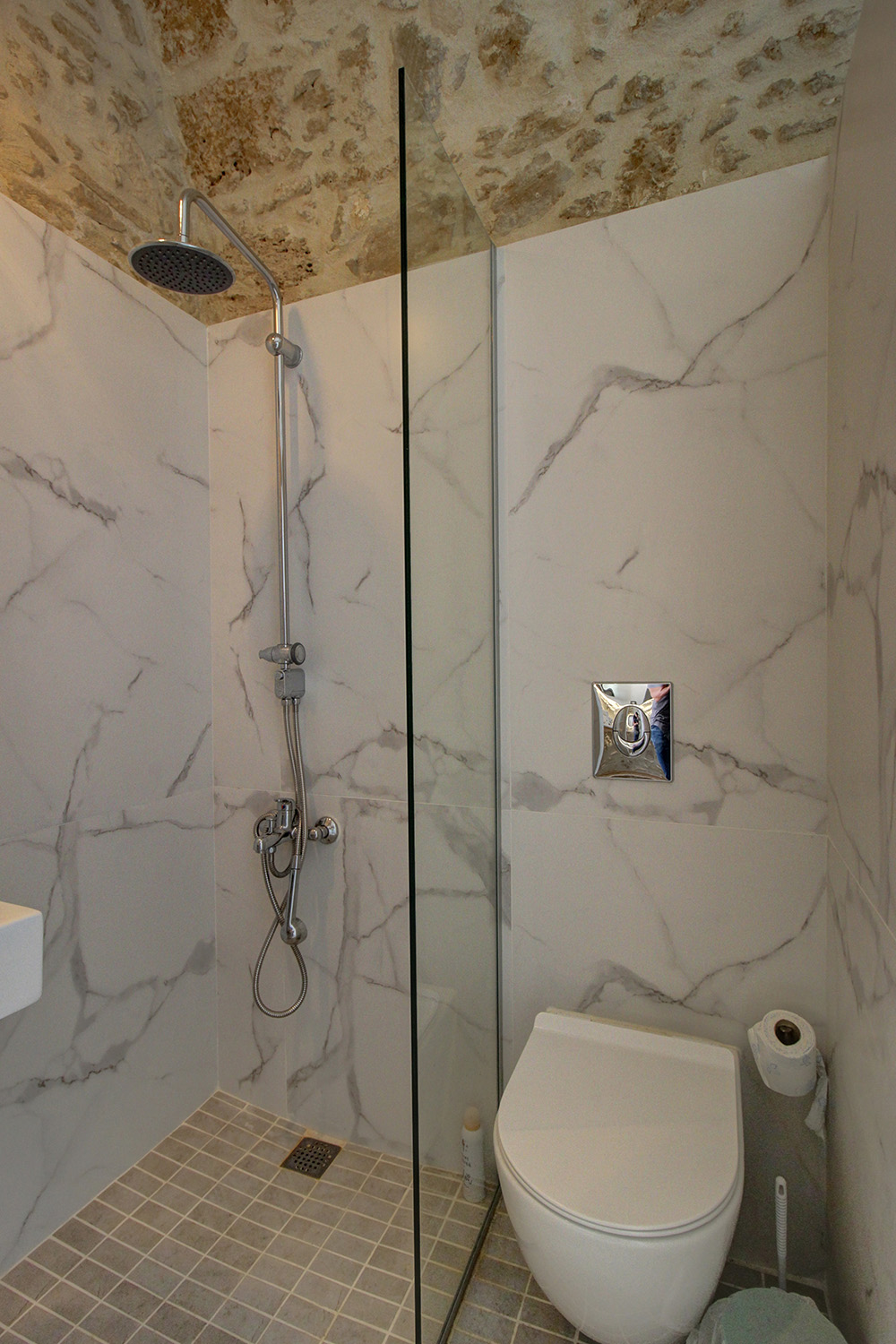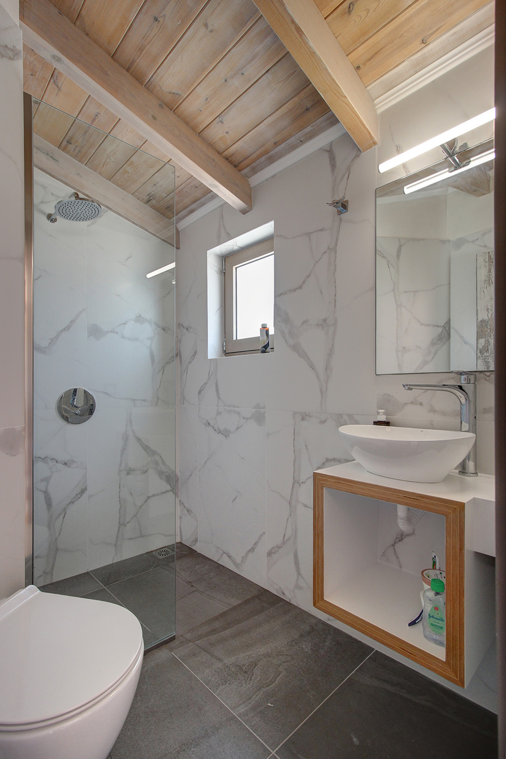 In front of the house there is a private pool about 25 m² while before our main entrance we find a large covered terrace, which is also used as a reception hall. Inside there is a large open-plan living and kitchen area, which is connected with the pool as well as with a picturesque cobbled path at the back side of the building. The kitchen has many cupboards and a modern island. On the ground floor there is also a large family bathroom as well as two vaulted bedrooms with en-suite bathrooms, in one of which there is a loft with a desk. An internal staircase leads upstairs, passes through a small guest-bedroom and ends in the master bedroom, which is en-suite and has exit to a large balcony with jacuzzi and sea views.