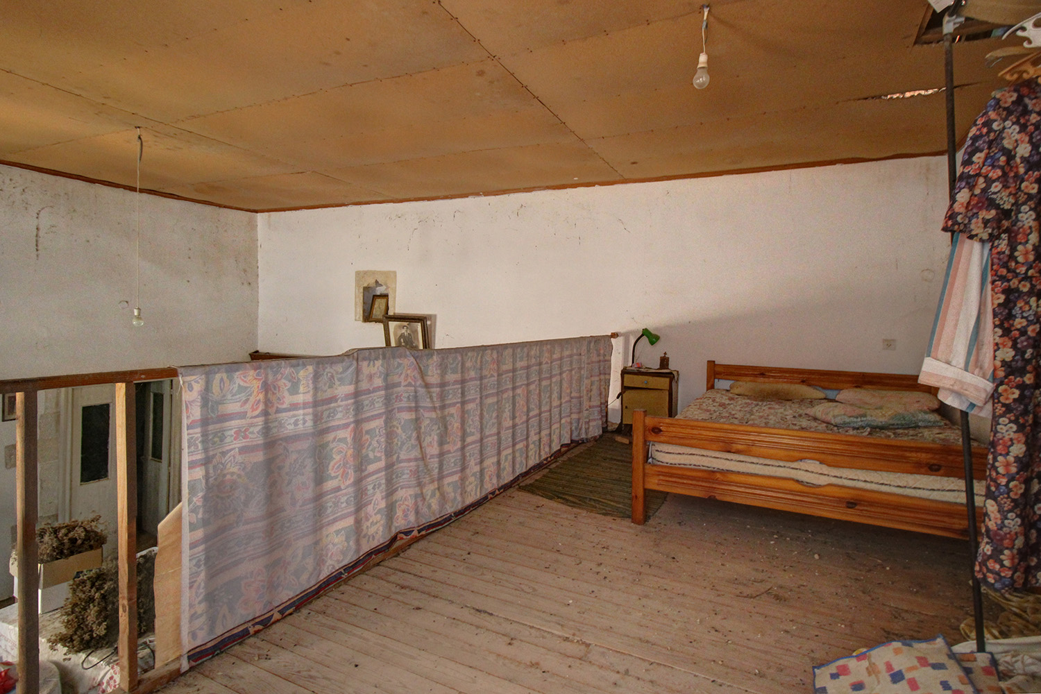 The interior of the house follows the slope of the ground with stairs that create separate levels. The main space is quite large with a loft and allows you to place there the kitchen and the living room with even a bedroom upstairs or an office space. There is another bedroom area as well as the old kitchen that can accommodate another bedroom. The old bathroom is located in a separate area in the yard and can be used as a storehouse or a boiler room and you may construct as many bathrooms as you want inside.