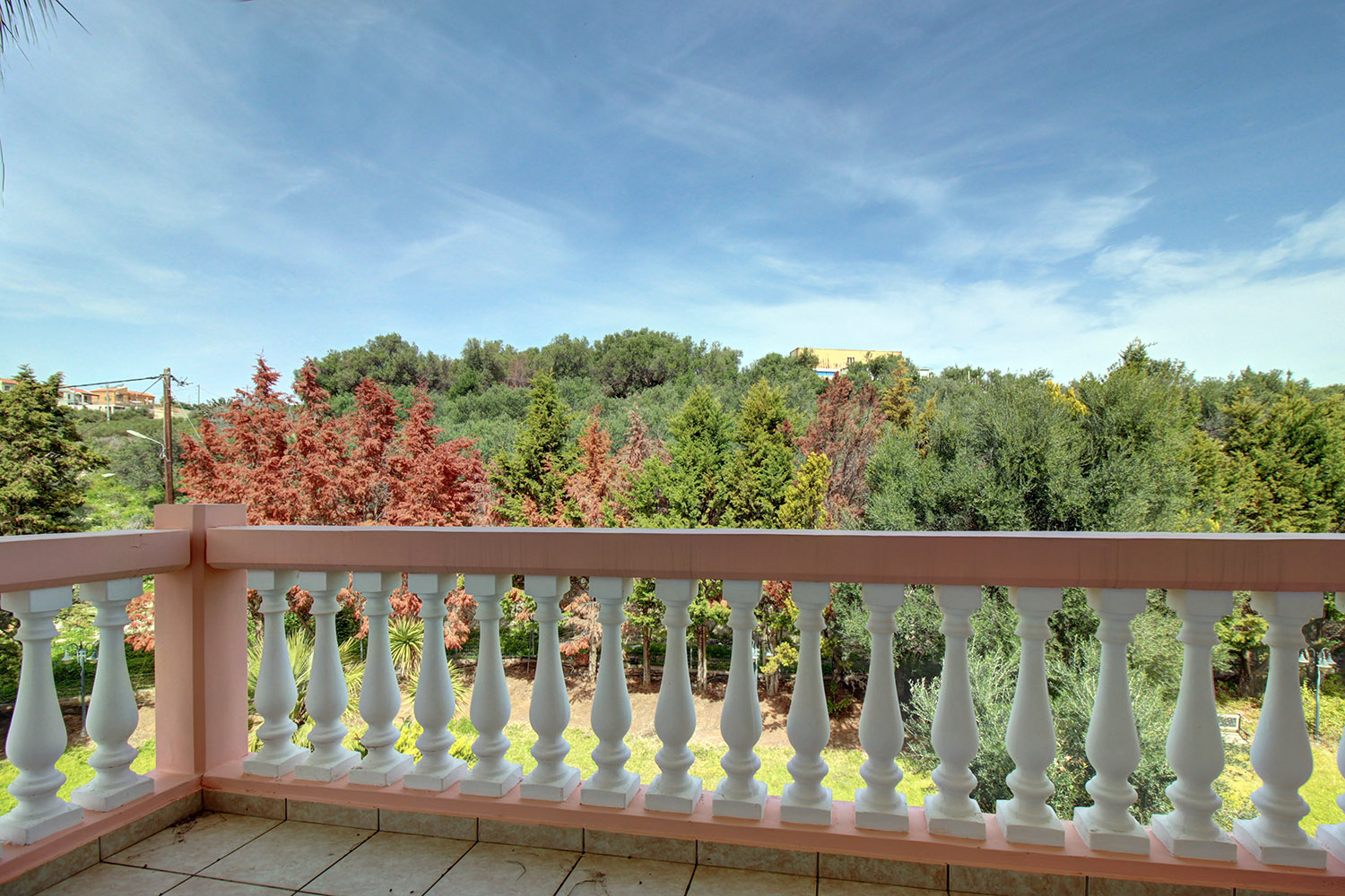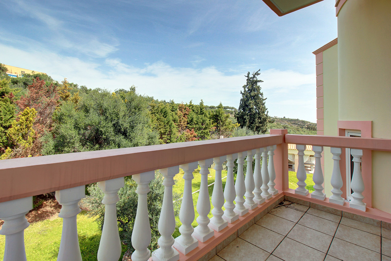 The property is enclosed by wall with iron railings. The front gate operates with an automation system and opens to a paved lane with lawn, tree and flower gardens at its right and left. At the rear of the lot there is a stone kiosk with brick oven, grill and a fully functional kitchen with sink and cabinets. A covered dining area is right outside the kiosk, while a shower bathroom is built right behind it. The private swimming pool of the property comprises a 25 m² children's pool and 70 m² adults' pool and it has also been placed at the rear side of the lot, as it offers the better views. The garden has an automated irrigation system with 5 m³ water tank. There is also a garage with automated doors and a button to open from the inside.