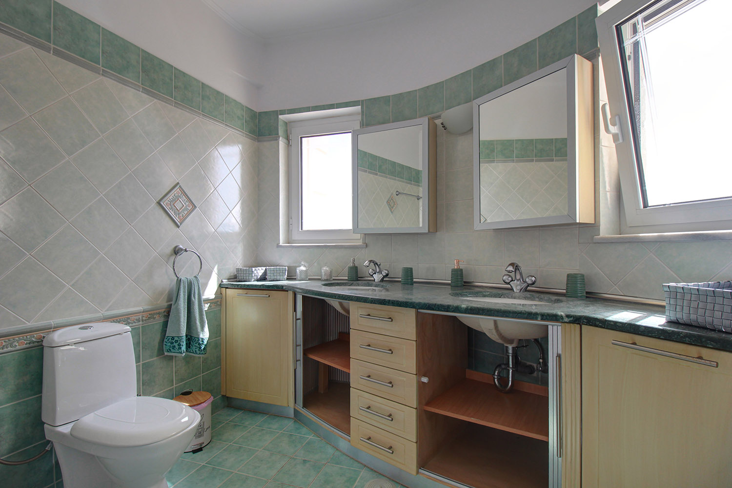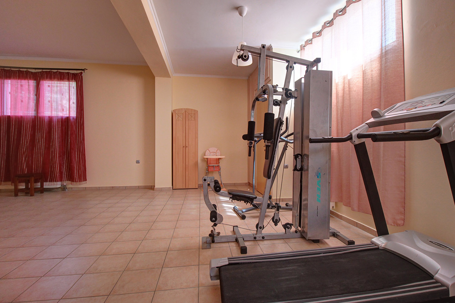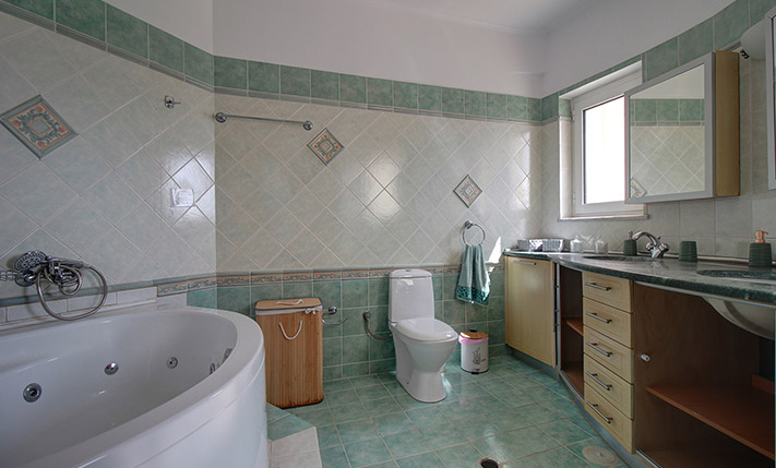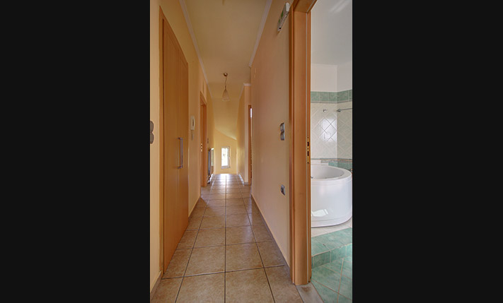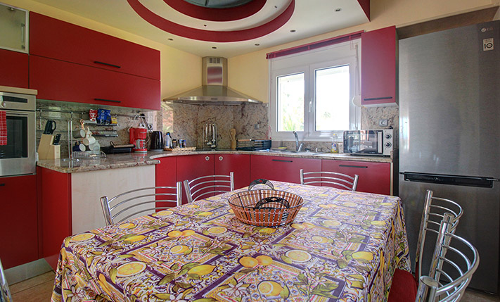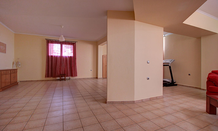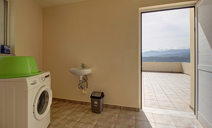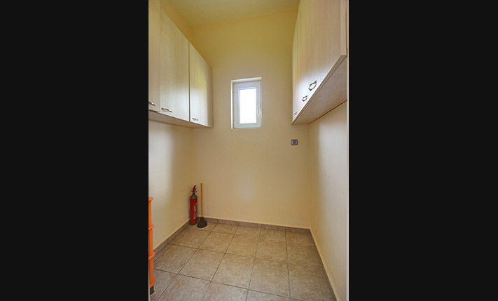The ground floor is open plan and consists of a dining-living room, guest room, shower bathroom, storage room with shelves and a spacious kitchen. An internal staircase leads to the basement that comprises yet another open plan lounge with kitchen, 2 bedrooms and a large bathroom with bathtub. A door opens directly from the basement to the pool area. The upper floor has one family bathroom, one en-suite master bedroom, two extra bedrooms and a walk-in closet and ironing room. A staircase leads from the first floor up to the tiled roof terrace and to a small laundry room with washing and drying machine.