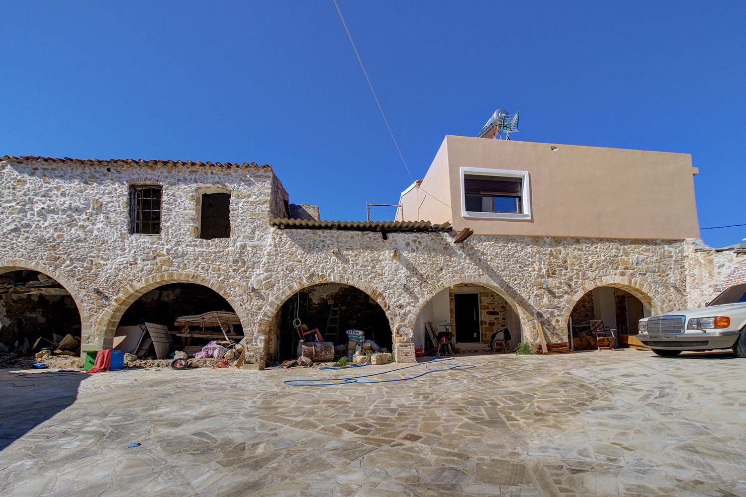 The property is in a neighborhood of the municipality Platanias, in a beautiful area with picturesque alleys and traditional houses. It is a complex of three residences, one of which is 145 m² and immediately habitable, the other of 120 m² is in the concrete stage and one more of about 80 m² is old stone and needs restoration.