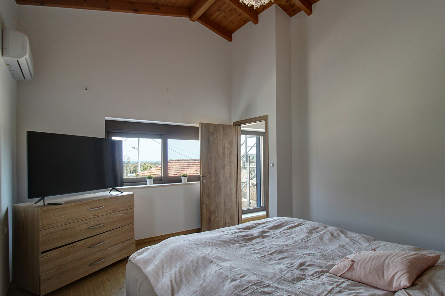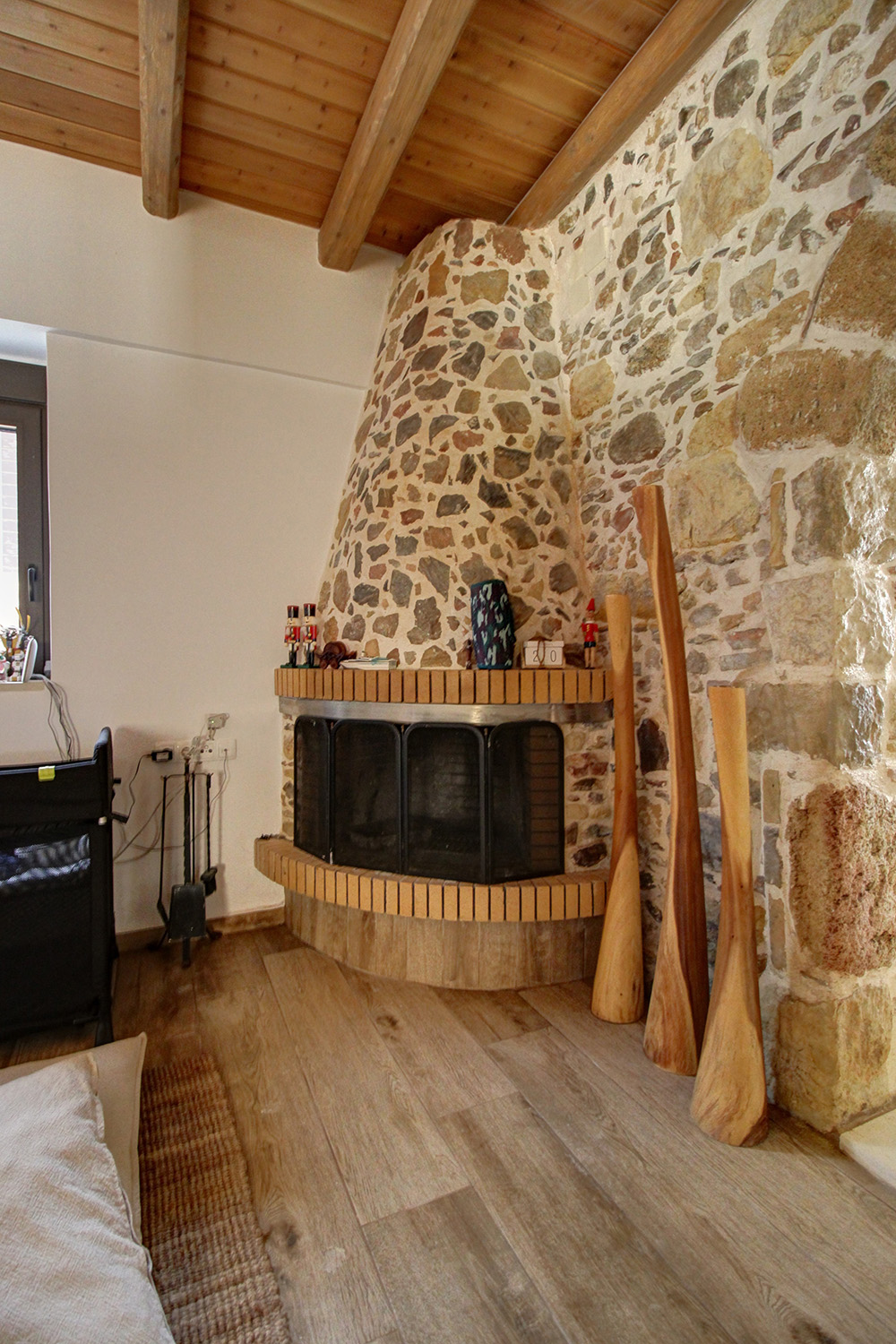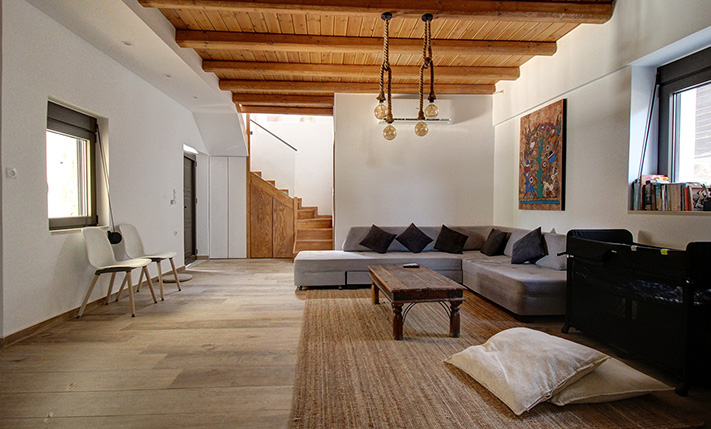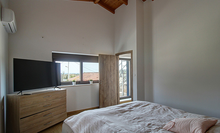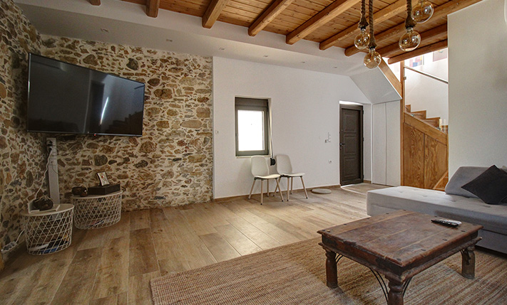 The house is elegant and perfectly combines the strong traditional elements of the original building with the modern later features. On the frontage there is a parking space with paved courtyard and built barbecue while before the main entrance we find a covered terrace with traditional stone arches. Inside, there is a large living area while the kitchen and the dining space are in a separate room. A staircase leads upstairs to a central corridor that is connected with all areas. There are a solar panel, air conditioners in all rooms and a traditional fireplace in the living area that is enough to heat the entire ground floor. The sale price also includes all the existing furniture, which is new and in excellent condition.