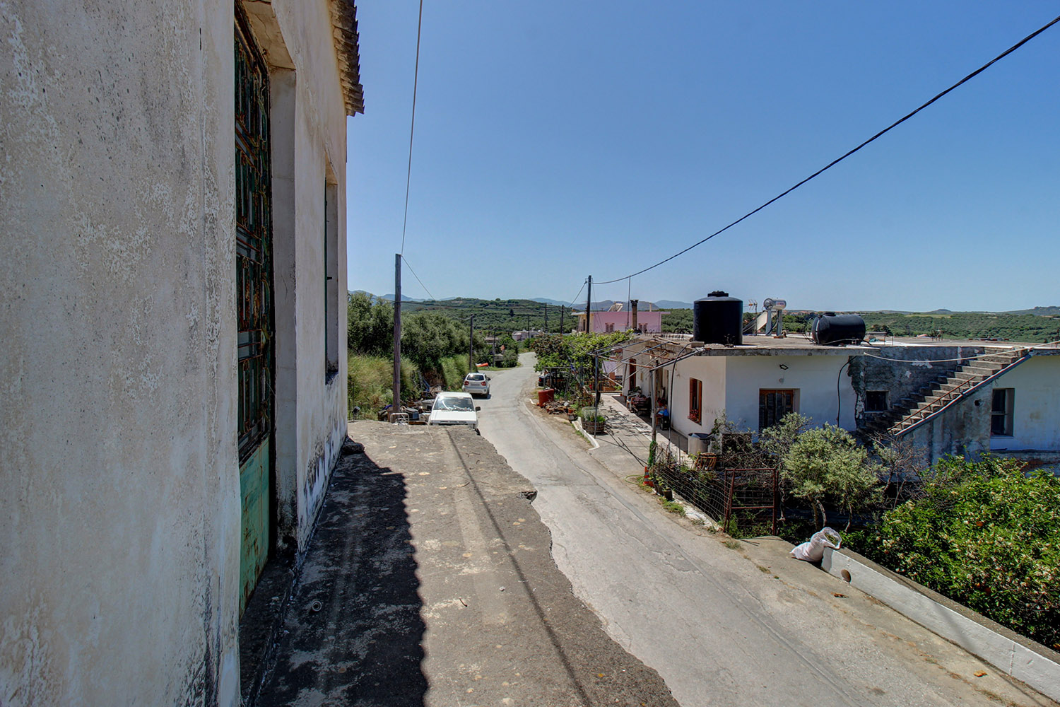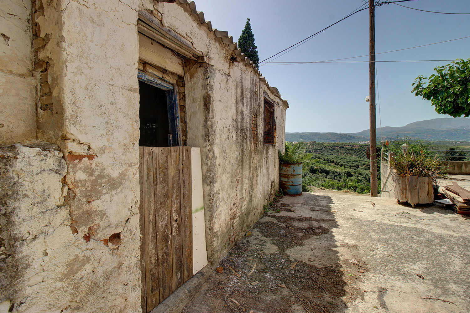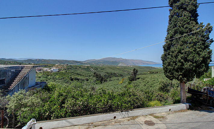 The plot has a good, almost rectangular shape with average dimensions of about 18 m along two opposite frontages * 35 m. The land has a gentle northwest slope and the views are excellent over countless olive groves and up to the sea, even from the lowest point. The larger of the two buildings has a semi-basement of about 45 m² on the street level, which could be converted into a garage, a storage space or boiler room. On the upper level there are 200 m² of main areas and additional 50 m² in the second building. At the back of the plot there are two professional winepresses with channels that are constructed for the collection of wine.