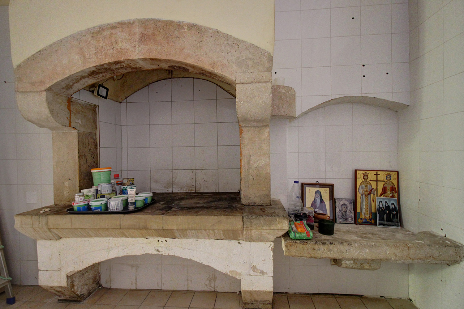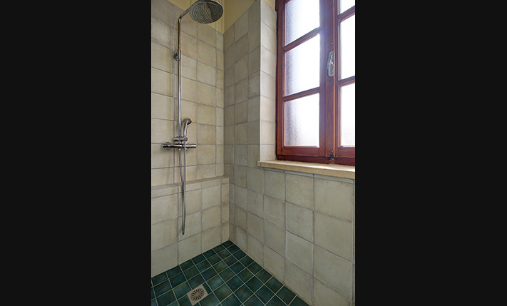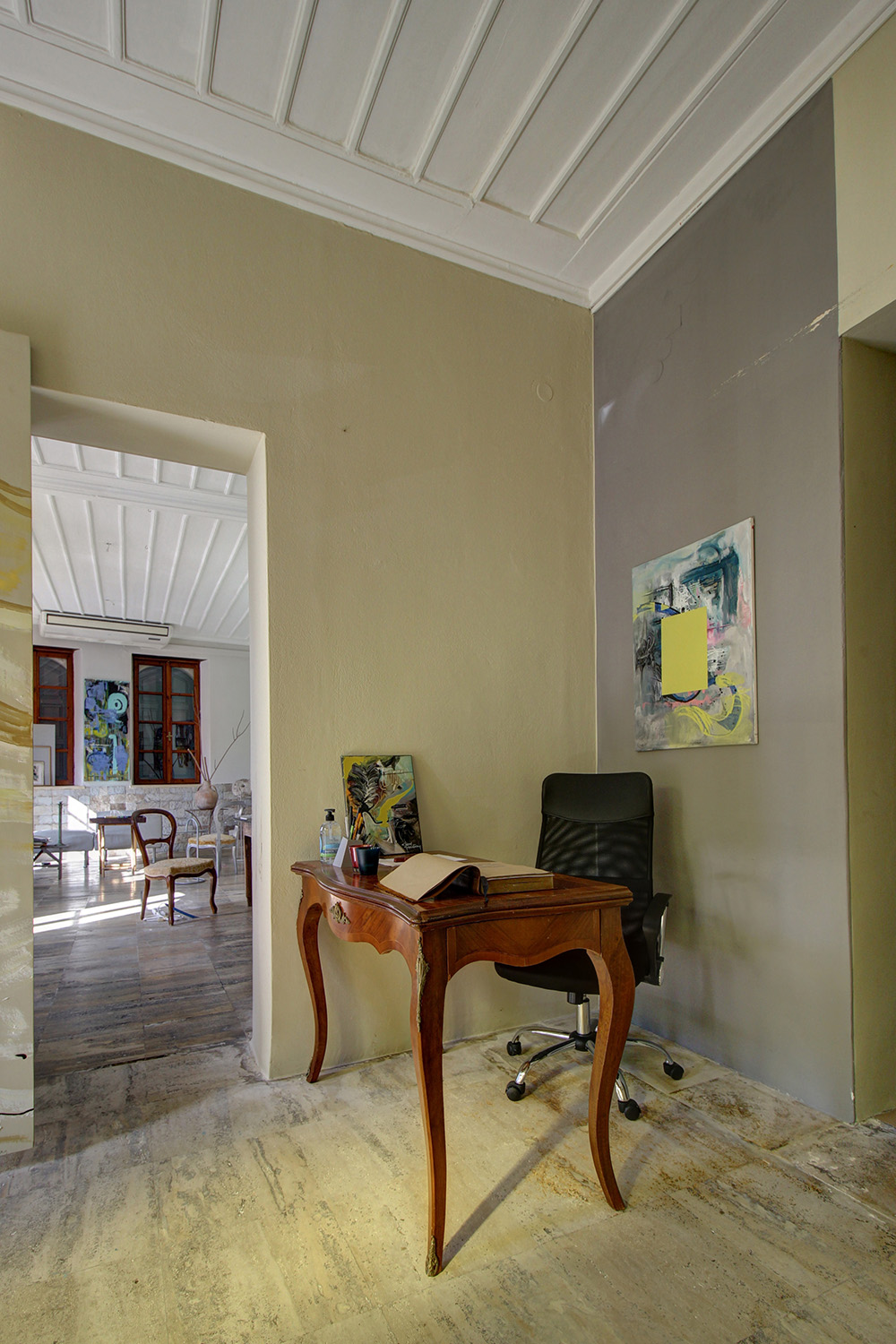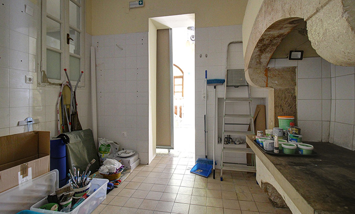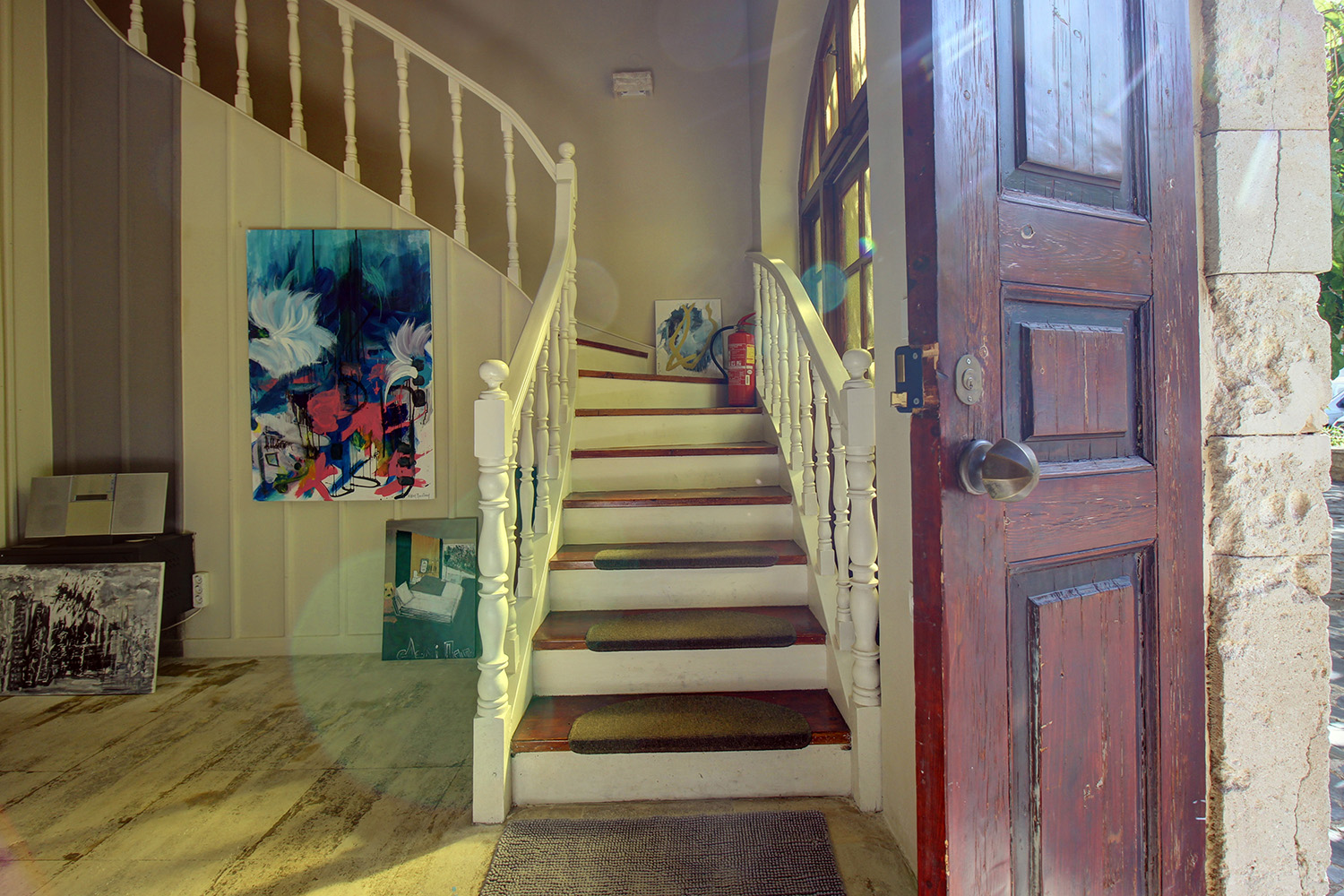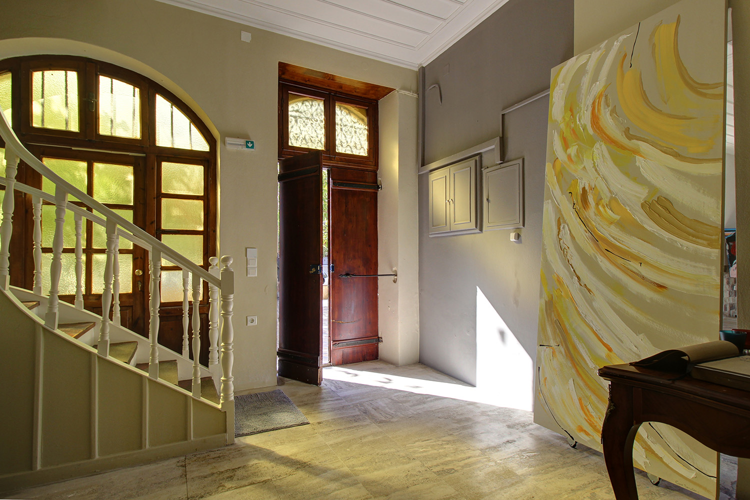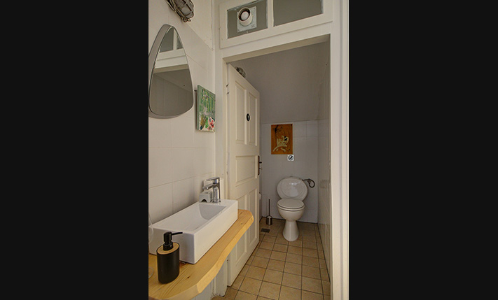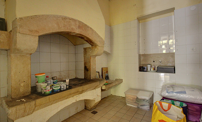 The frontages are large and on the south side there are two central entrances so that the upper and lower floors can be used separately. One of the entrances leads to an open-plan space that occupies almost the entire ground floor. The second door opens onto an entrance hall, which now is used as a reception and is connected with the main area of the ground floor, an old kitchen at the back, a professional double WC and with the staircase that leads upstairs. In the old kitchen there is a stone fireplace and there are tiles on the walls.