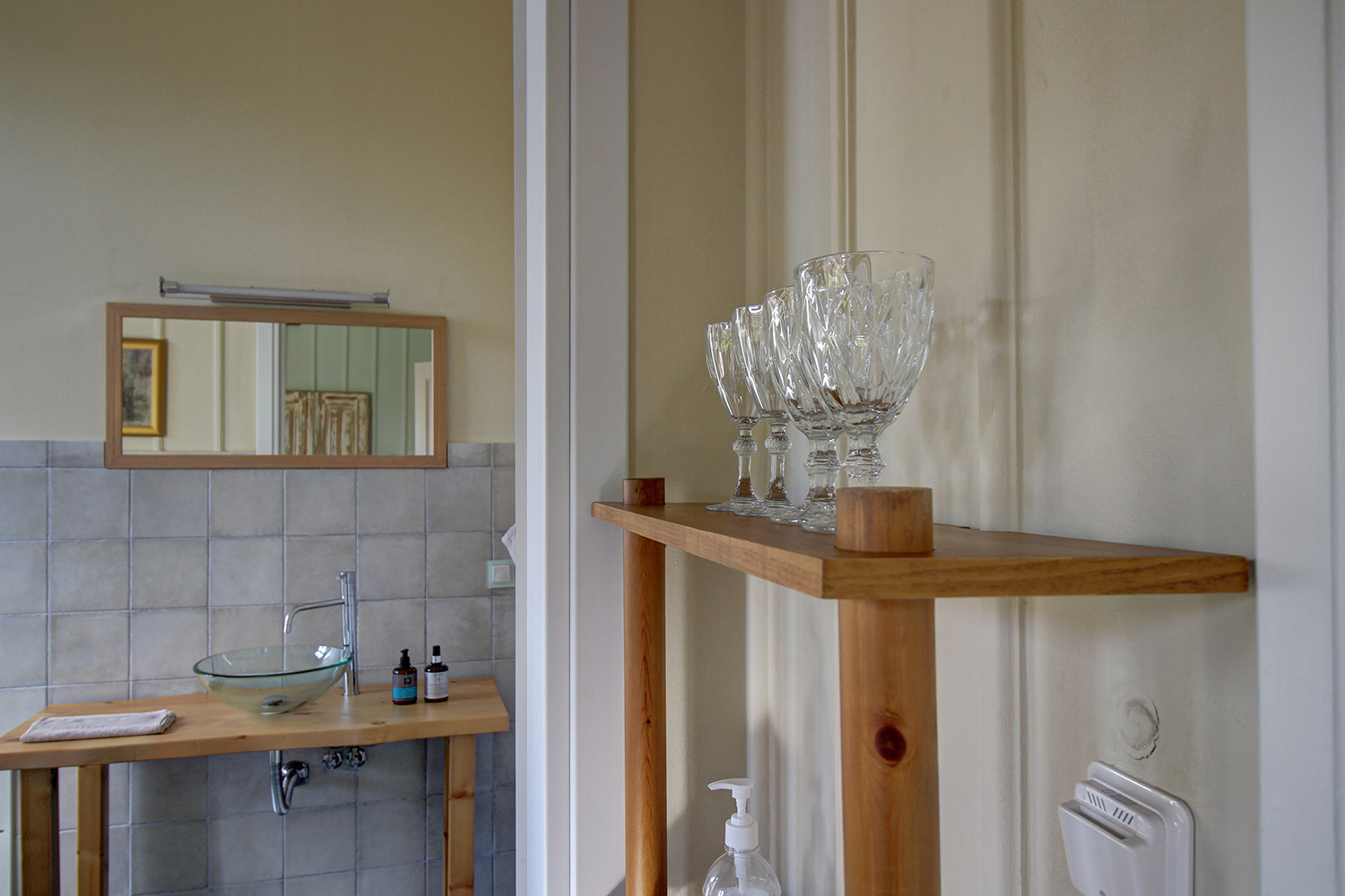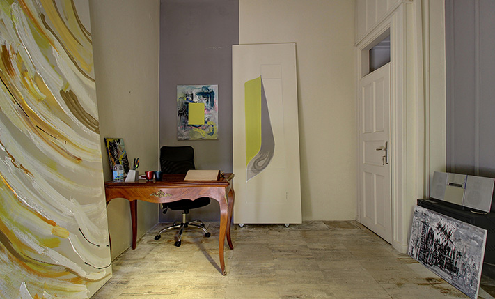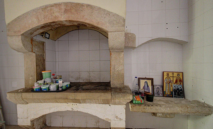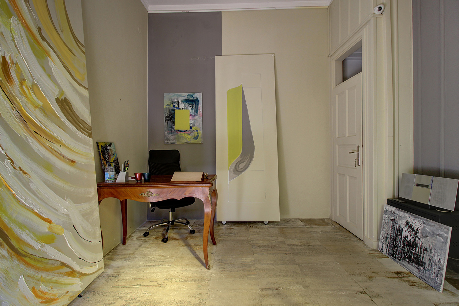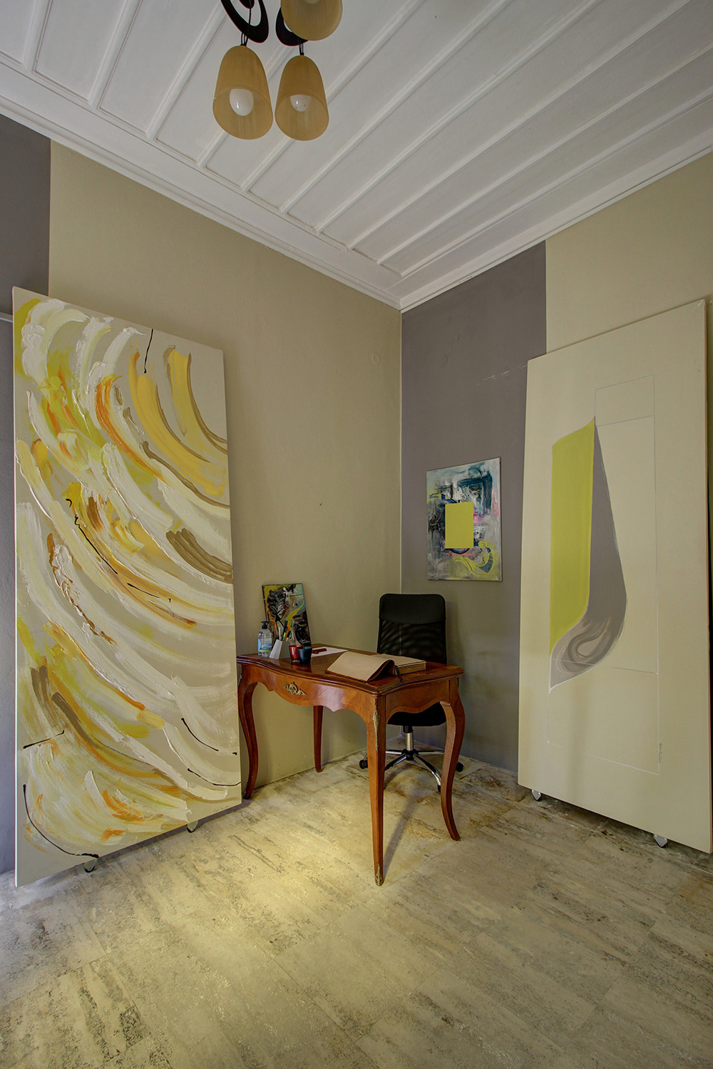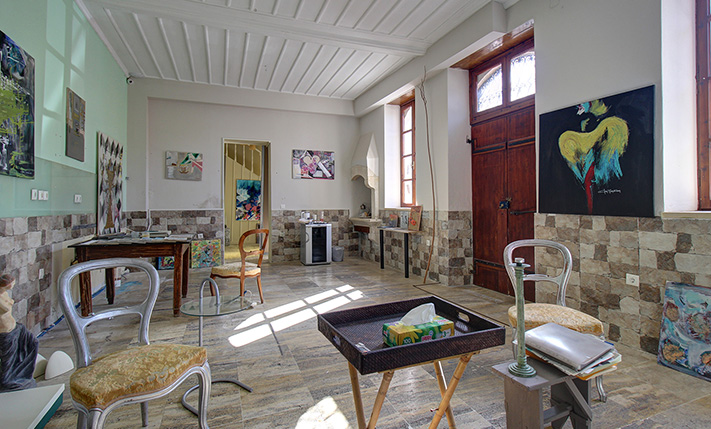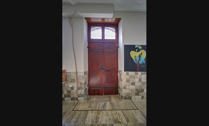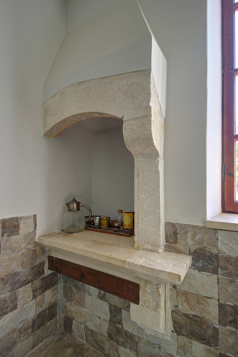 The frontages are large and on the south side there are two central entrances so that the upper and lower floors can be used separately. One of the entrances leads to an open-plan space that occupies almost the entire ground floor. The second door opens onto an entrance hall, which now is used as a reception and is connected with the main area of the ground floor, an old kitchen at the back, a professional double WC and with the staircase that leads upstairs. In the old kitchen there is a stone fireplace and there are tiles on the walls.