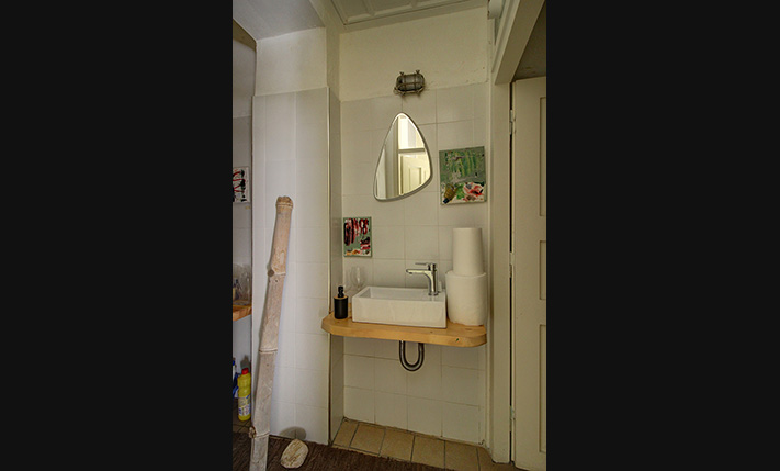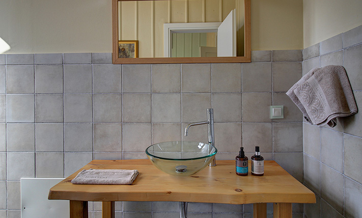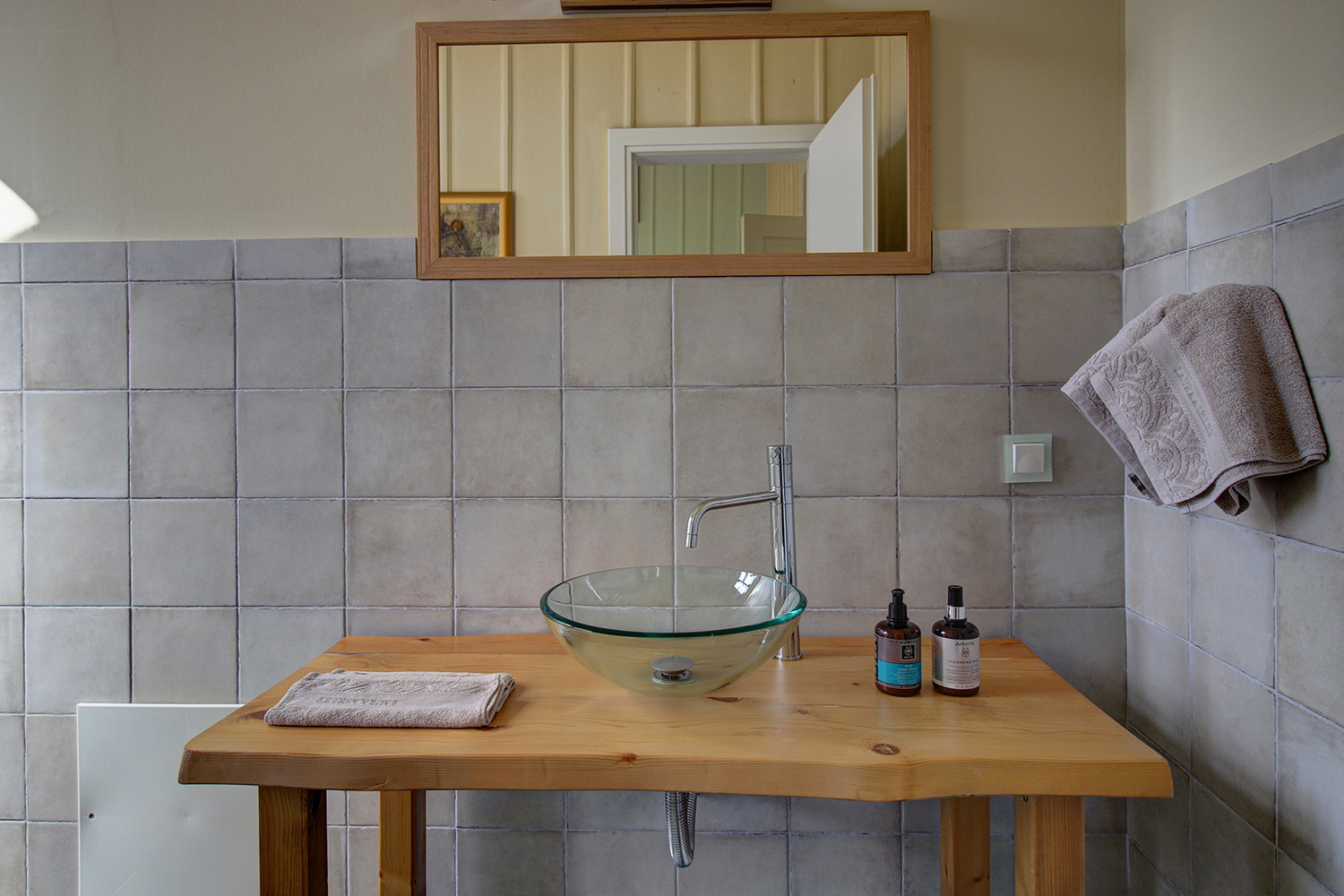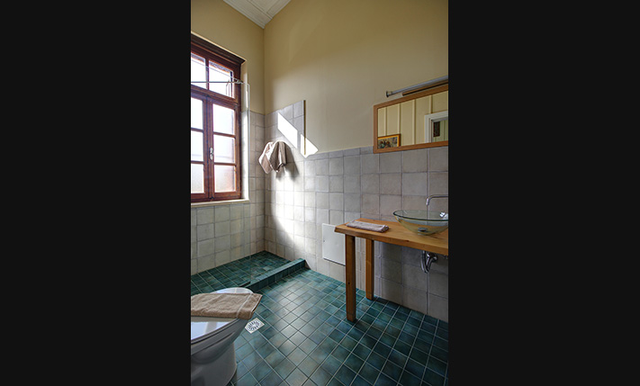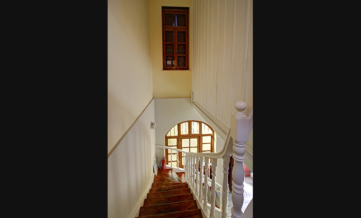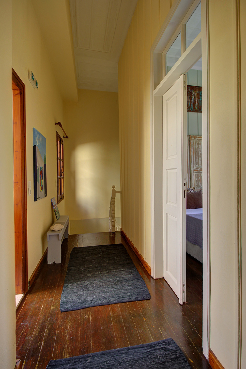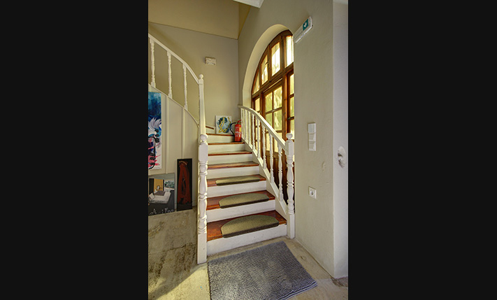 The handmade wooden staircase that leads to the upper floor is impressive. Upstairs, we find a central corridor that leads us to two bedrooms with impressively high ceilings, each of which has its own bathroom. A door opens to an enclosed interior balcony with good privacy. Here, there is also the old bathroom of the residence, which can be used as it currently is or as a storage room.