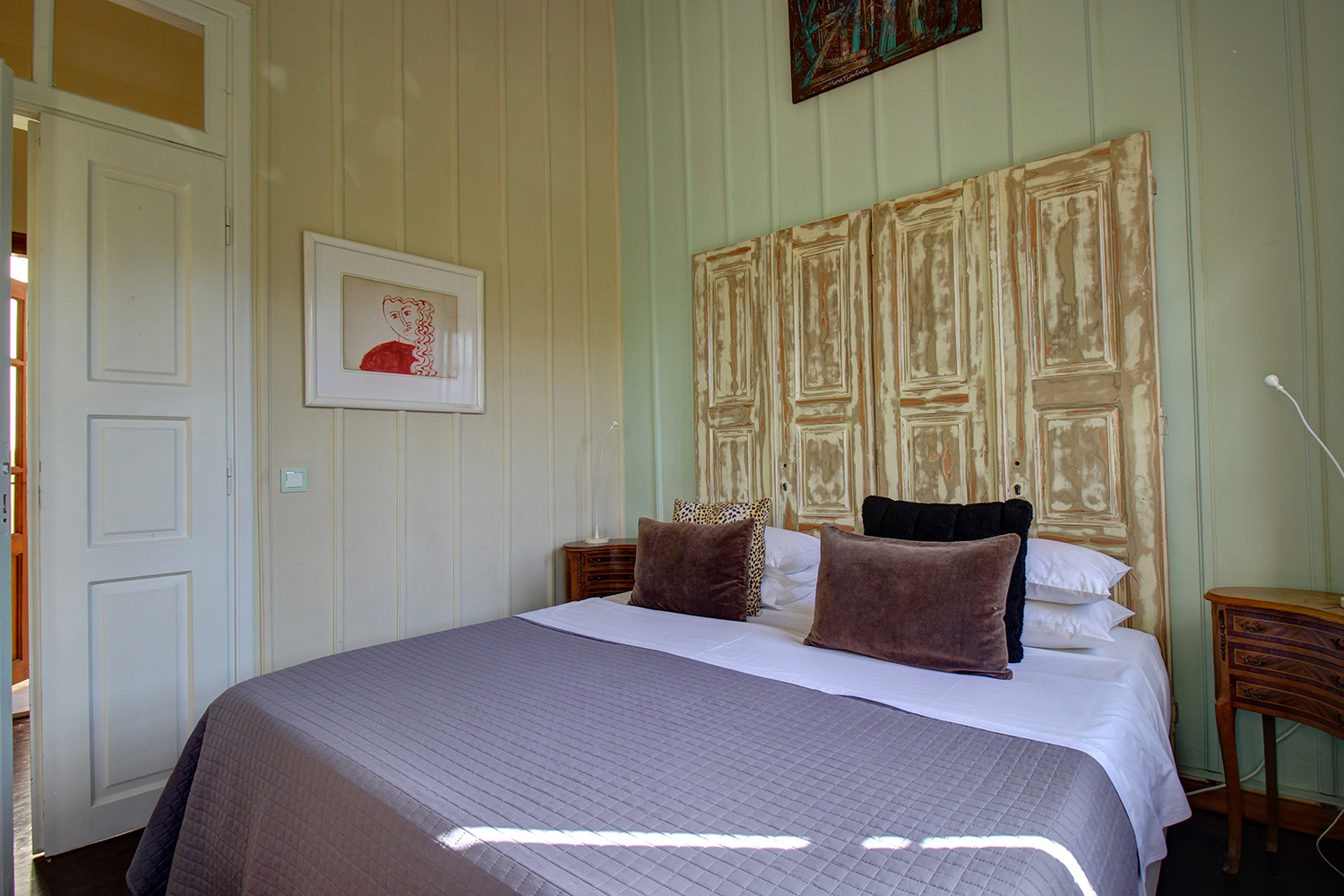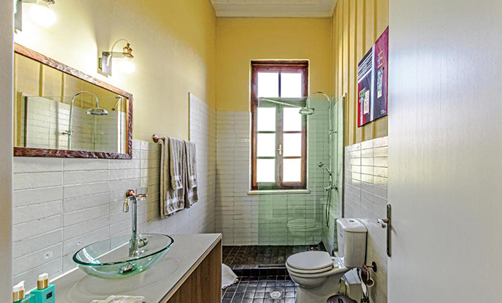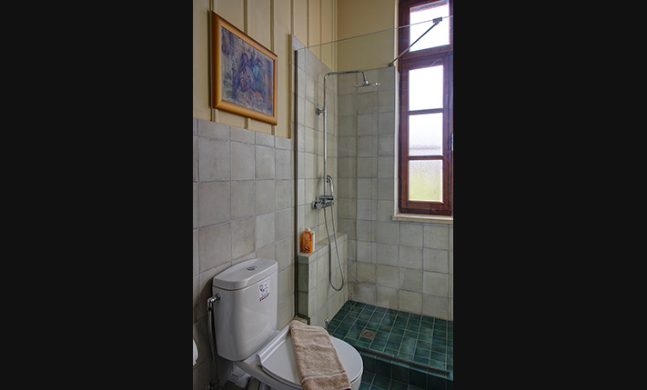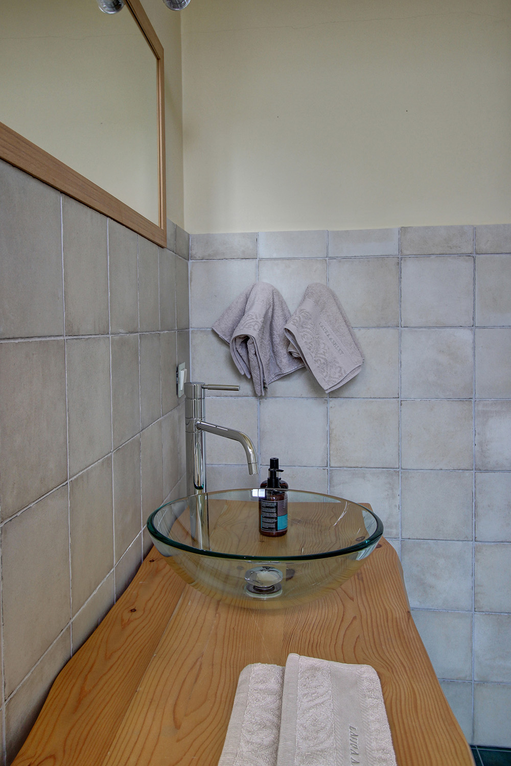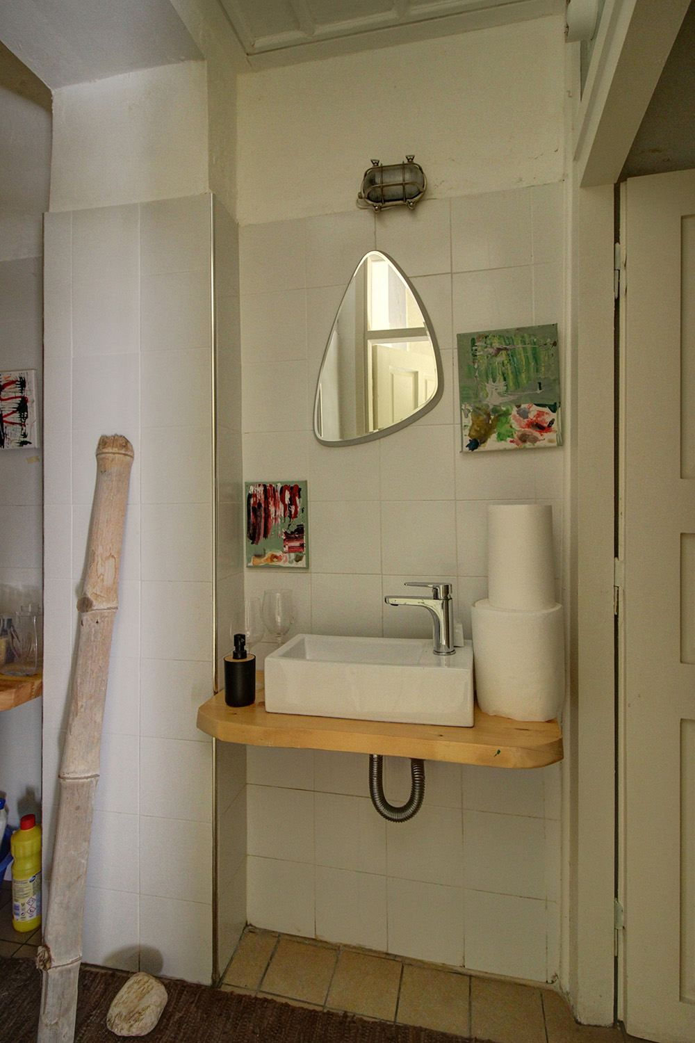 The handmade wooden staircase that leads to the upper floor is impressive. Upstairs, we find a central corridor that leads us to two bedrooms with impressively high ceilings, each of which has its own bathroom. A door opens to an enclosed interior balcony with good privacy. Here, there is also the old bathroom of the residence, which can be used as it currently is or as a storage room.