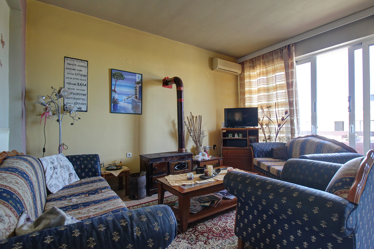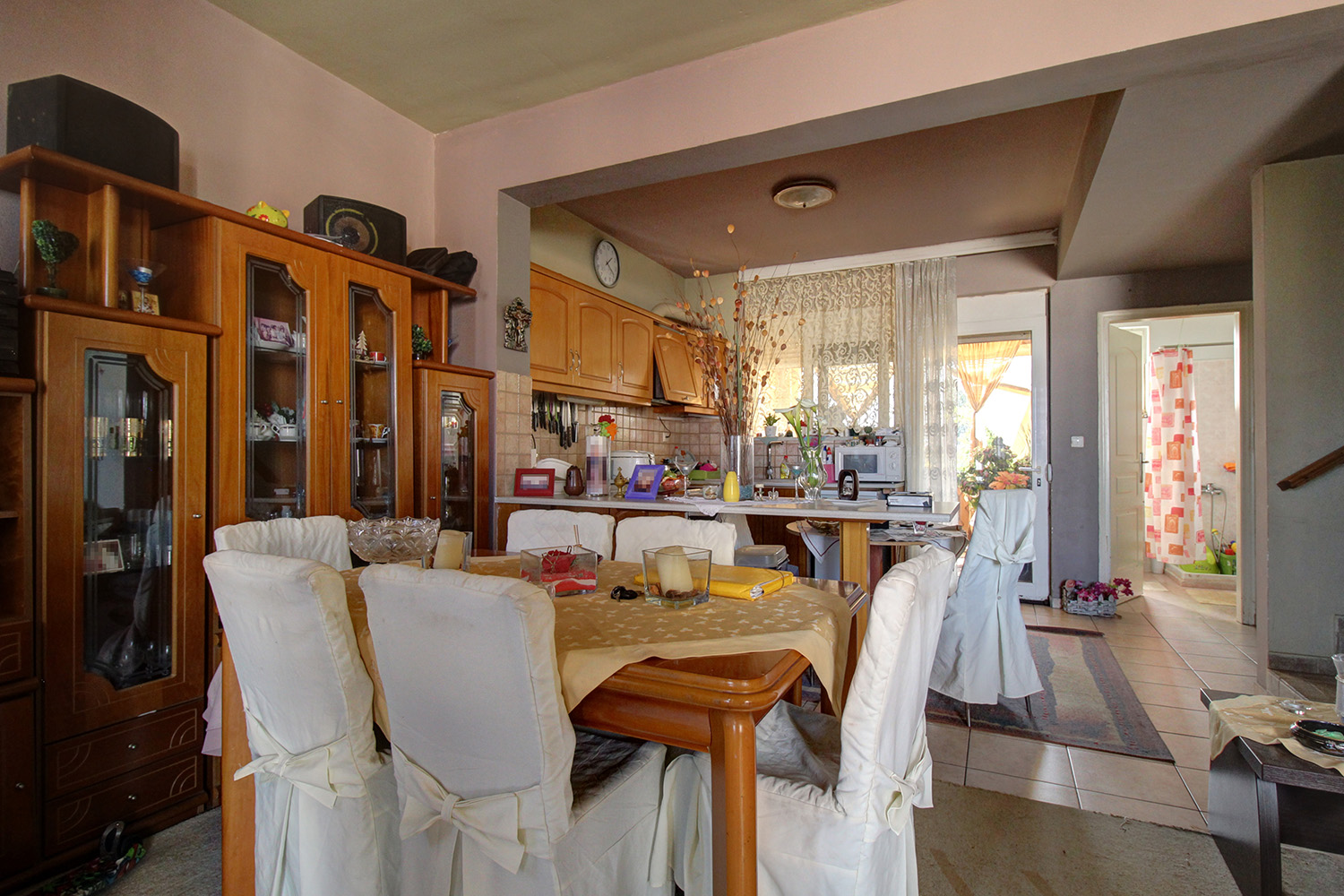 The frontages of the house are oriented to the north and the south so that there are beautiful views up to the sea and plenty of light, respectively. A short staircase leads to the main entrance on the ground floor, which is elevated. Inside, there is a large, open-plan space. From the side of the road there is an exit to a small terrace. On the back side we exit to a courtyard, which is enclosed with awning and constitutes an ideal area for relaxation all the day and all year round. The kitchen is spacious with many cupboards and a large counter while the living room has a wood-burning stove. The ground floor also has a bathroom with a shower. An internal staircase leads upstairs to three bedrooms and a bathroom with a bathtub. Each bedroom has a good-sized, built-in wardrobe and exit to a balcony, in its exclusive use. The two balconies on the north side have beautiful views towards the islet of Agios Theodoros. The staircase of the house leads to the rooftop terrace, which can be configured and may become an additional functional area of the house.
