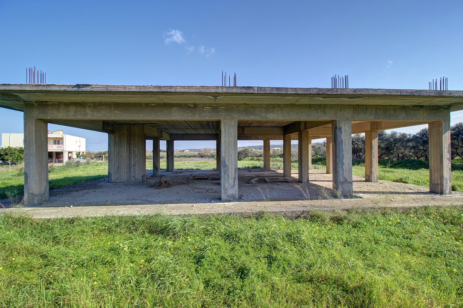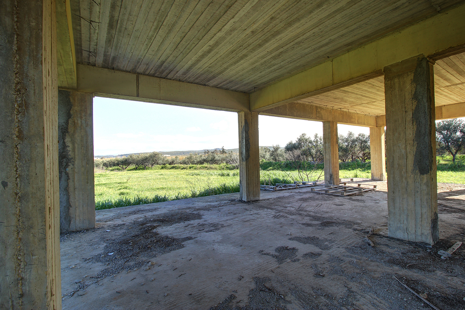 The property includes a large bare plot with a building in the concrete stage. The building can be completed as it currently is but you cannot expand it. The frame of the building requires some modifications and small repairs but structurally it has no obvious problems. You can therefore easily build a beautiful ground-floor villa with a large garden and up to 4 comfortable bedrooms. The size of the building allows you, alternatively, to divide it into two good-sized apartments with a layout that suits your needs. The surrounding area of the building has beautiful views towards the White Mountains and is more than enough in order to add parking spaces and a large thematic garden.