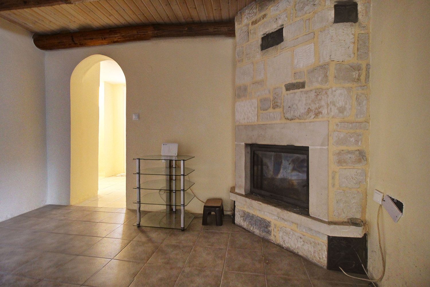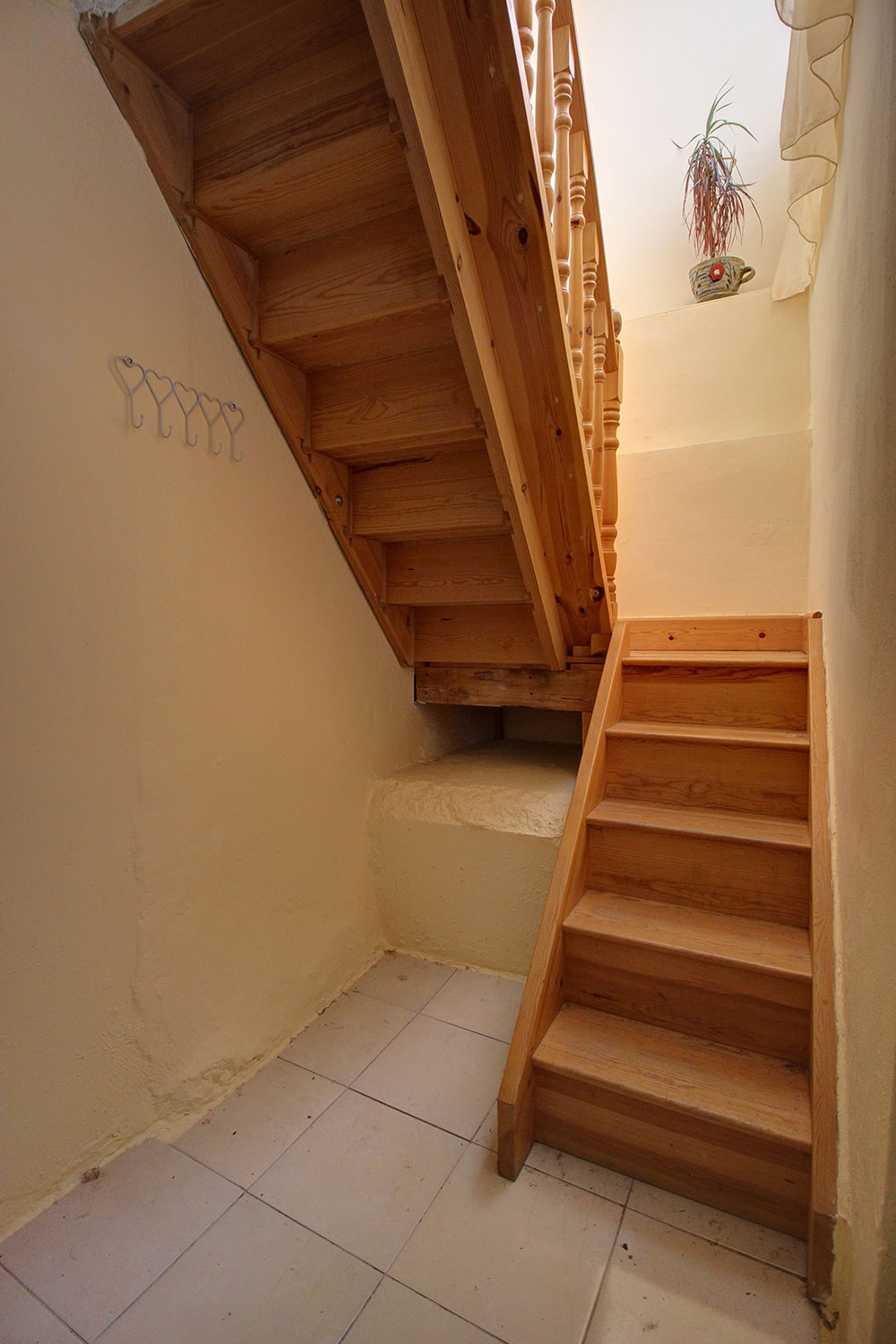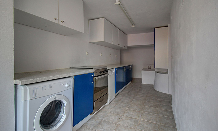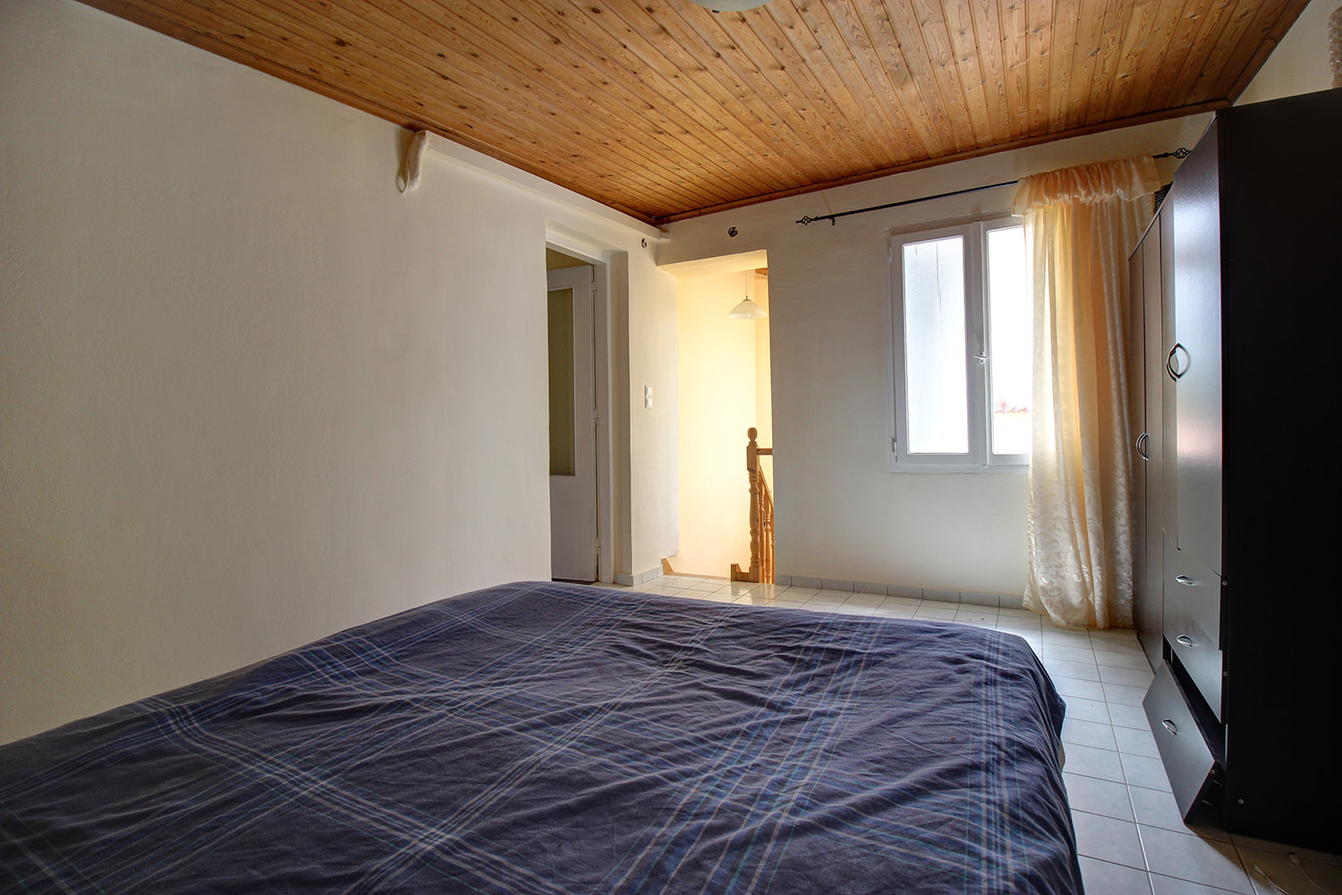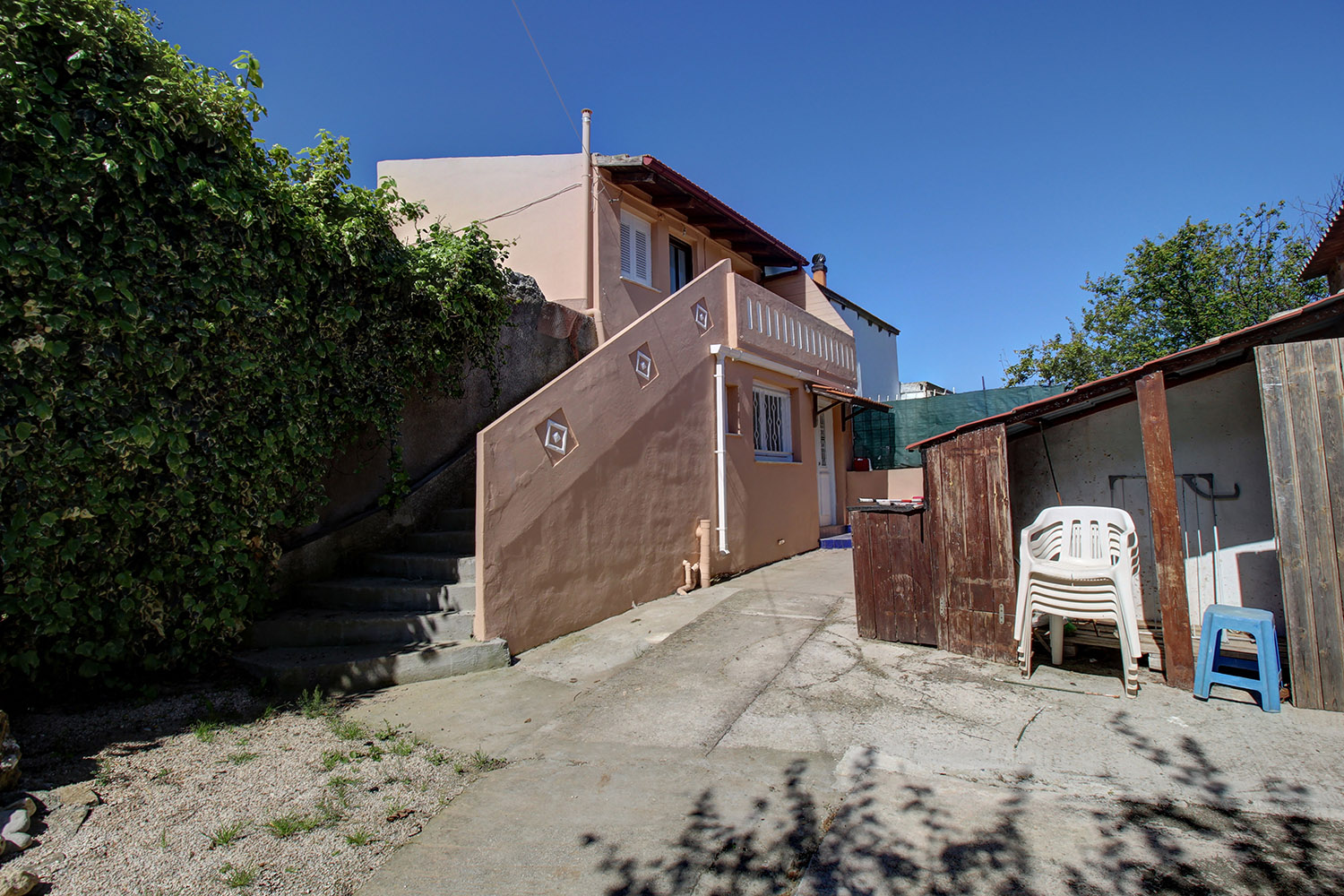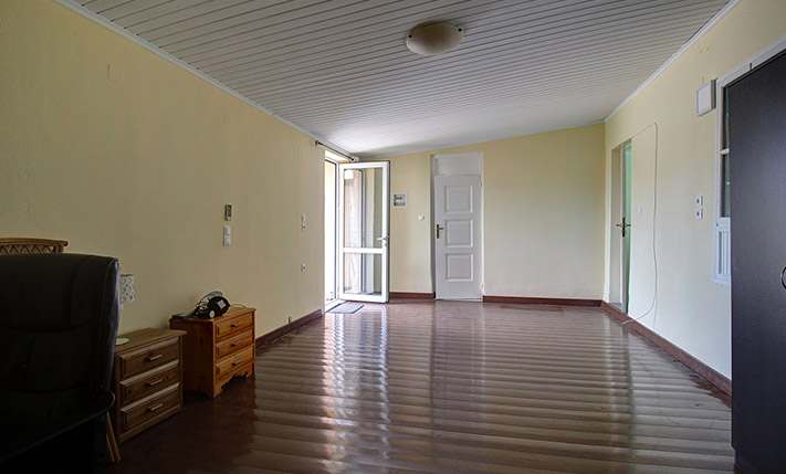 The two floors are connected internally with a wooden staircase while an external staircase allows you to use them separately. Downstairs, we find a large open-plan space with a fireplace, a separate kitchen, a bathroom and a bedroom. Upstairs, there is an additional open-plan area, which is quite large and you can construct another kitchen if you separate the space. There are also a bathroom, a northeast balcony as well as two comfortable bedrooms.