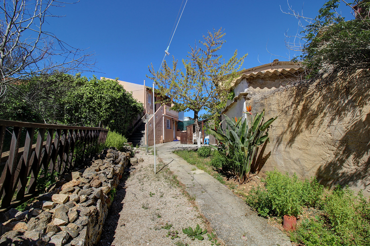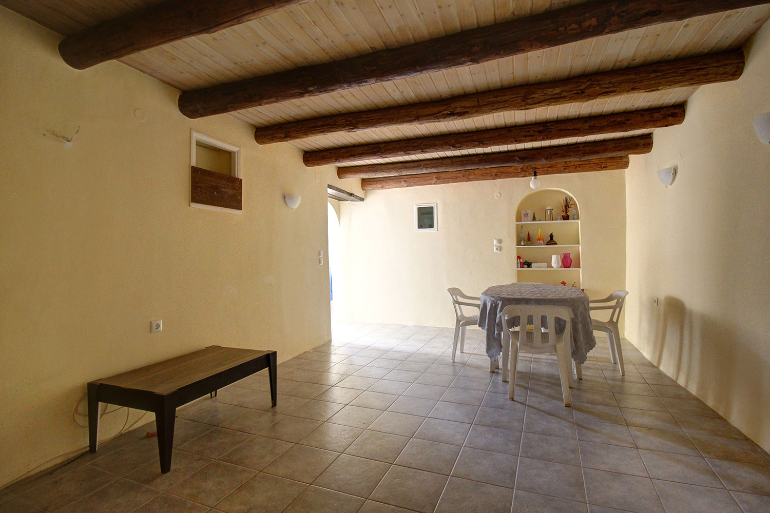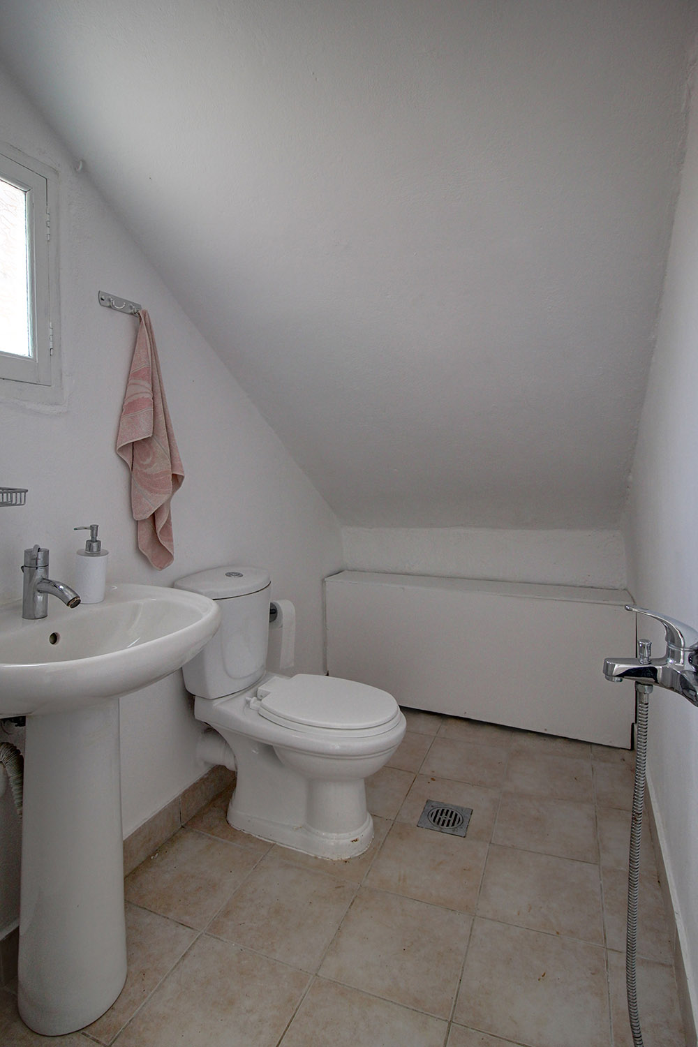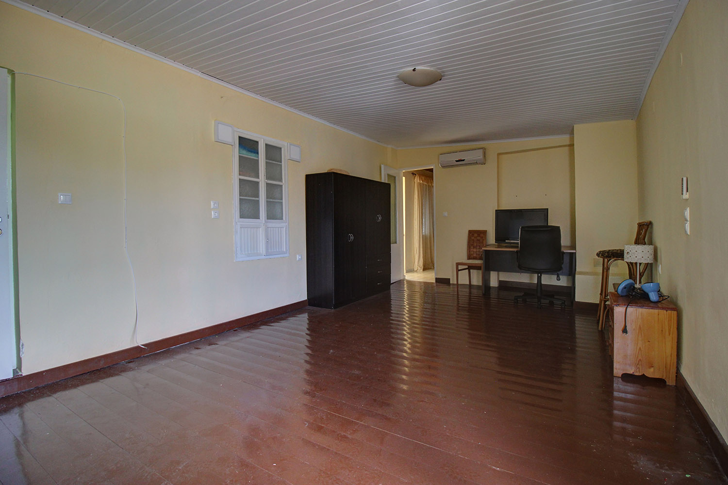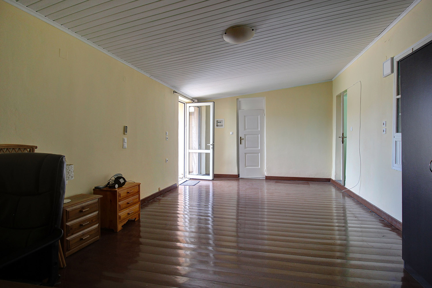 The two floors are connected internally with a wooden staircase while an external staircase allows you to use them separately. Downstairs, we find a large open-plan space with a fireplace, a separate kitchen, a bathroom and a bedroom. Upstairs, there is an additional open-plan area, which is quite large and you can construct another kitchen if you separate the space. There are also a bathroom, a northeast balcony as well as two comfortable bedrooms.