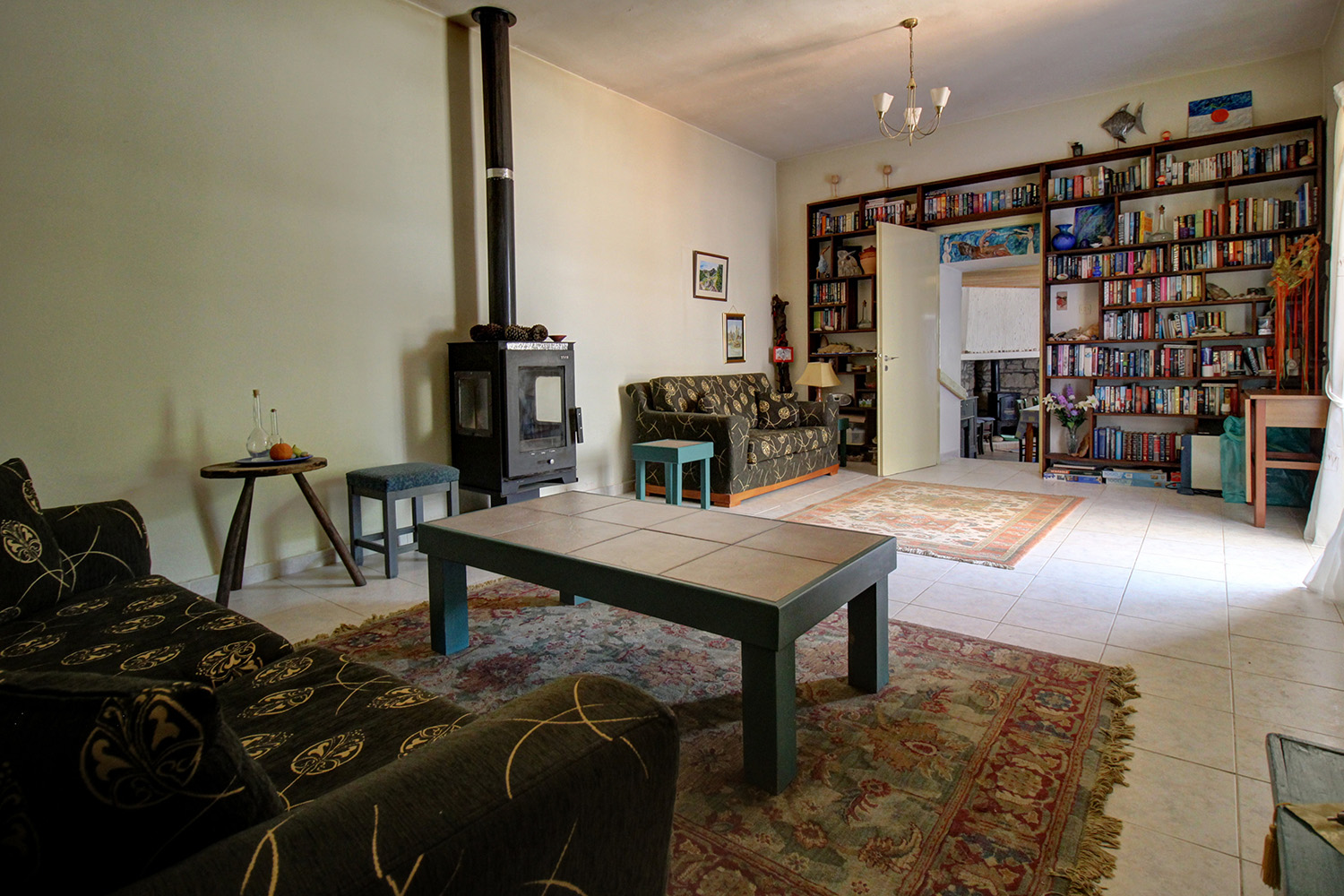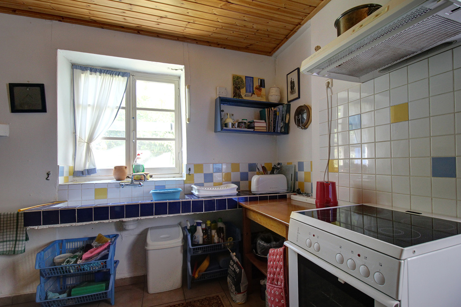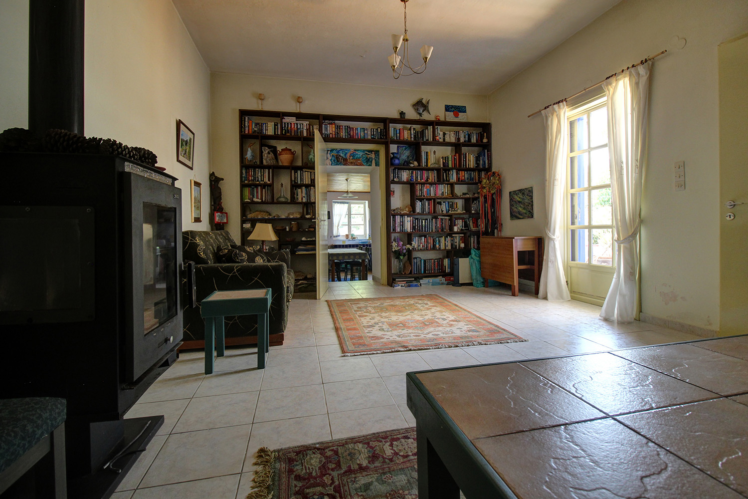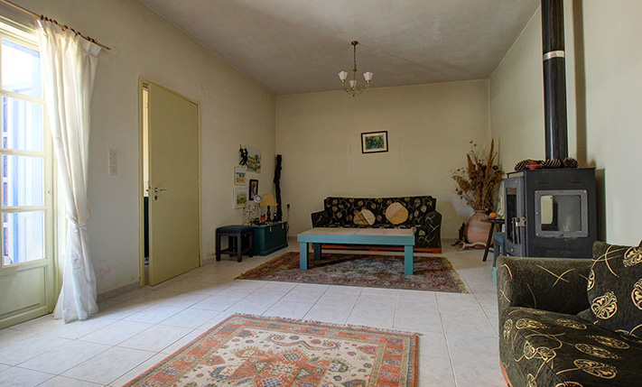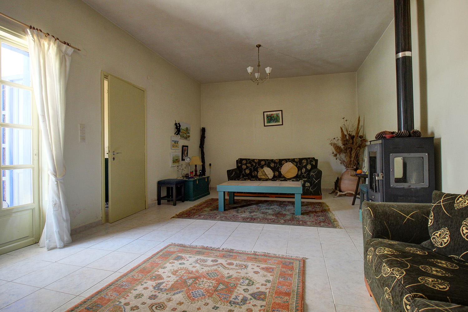 The house is stone built. If you renovate it you will probably be able to highlight the old walls in order to have an impressive rustic residence. The building follows the traditional layout of Cretan farmhouses, in which all the spaces are connected to each other in a row while at the same time have direct access to the courtyard. There are two entrances, from the kitchen or from a corridor that leads to the living space, the bathroom and the bedroom. An additional room has been separated in order to become a storage space and has access only from the outside but can very easily accommodate a small guestroom or an office. The plot has remaining buildable area if you want to extend the residence or even to add an extra floor. The home is suitable for holiday use and has two wood burning stoves that are enough to heat all the rooms.